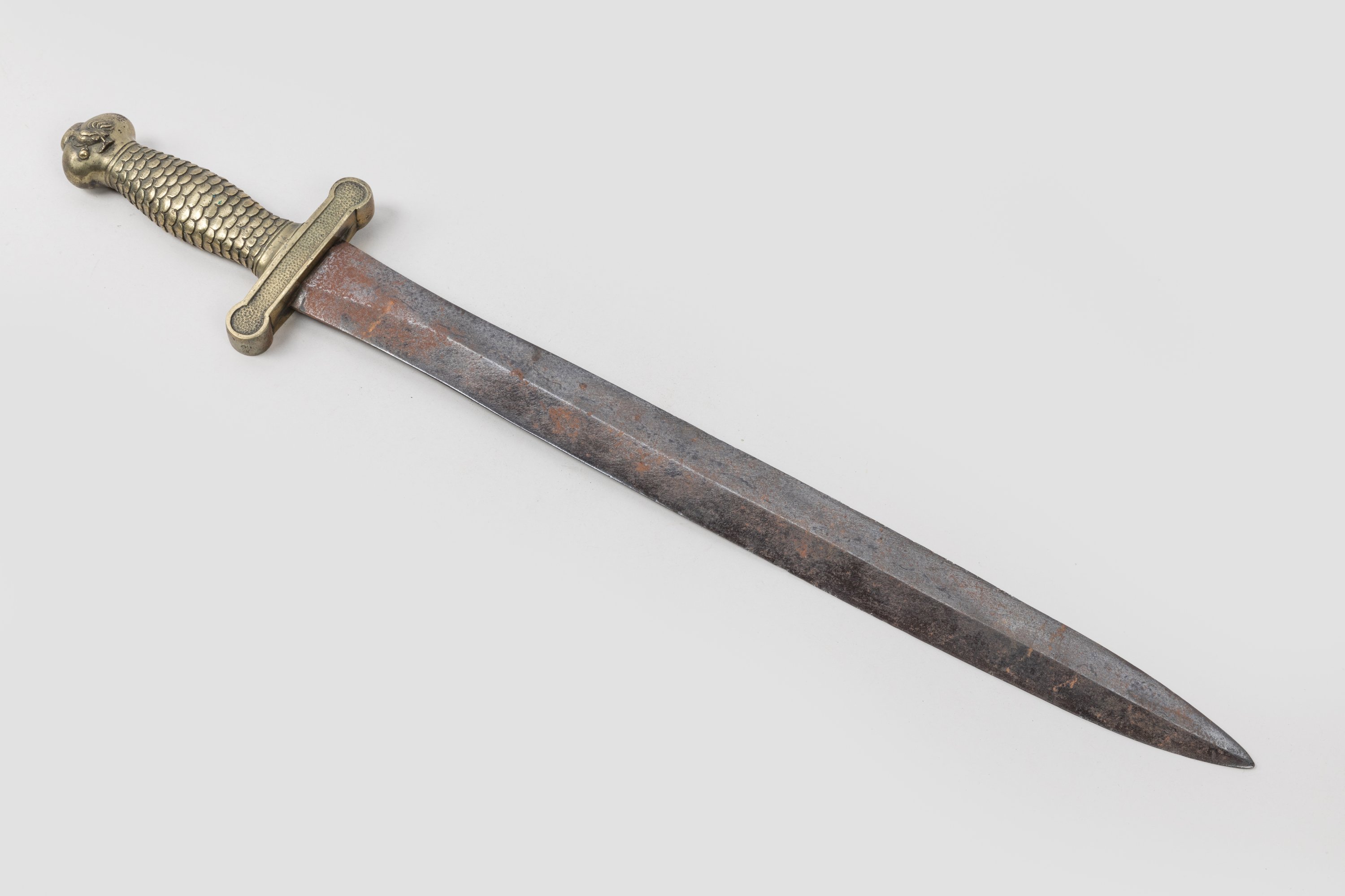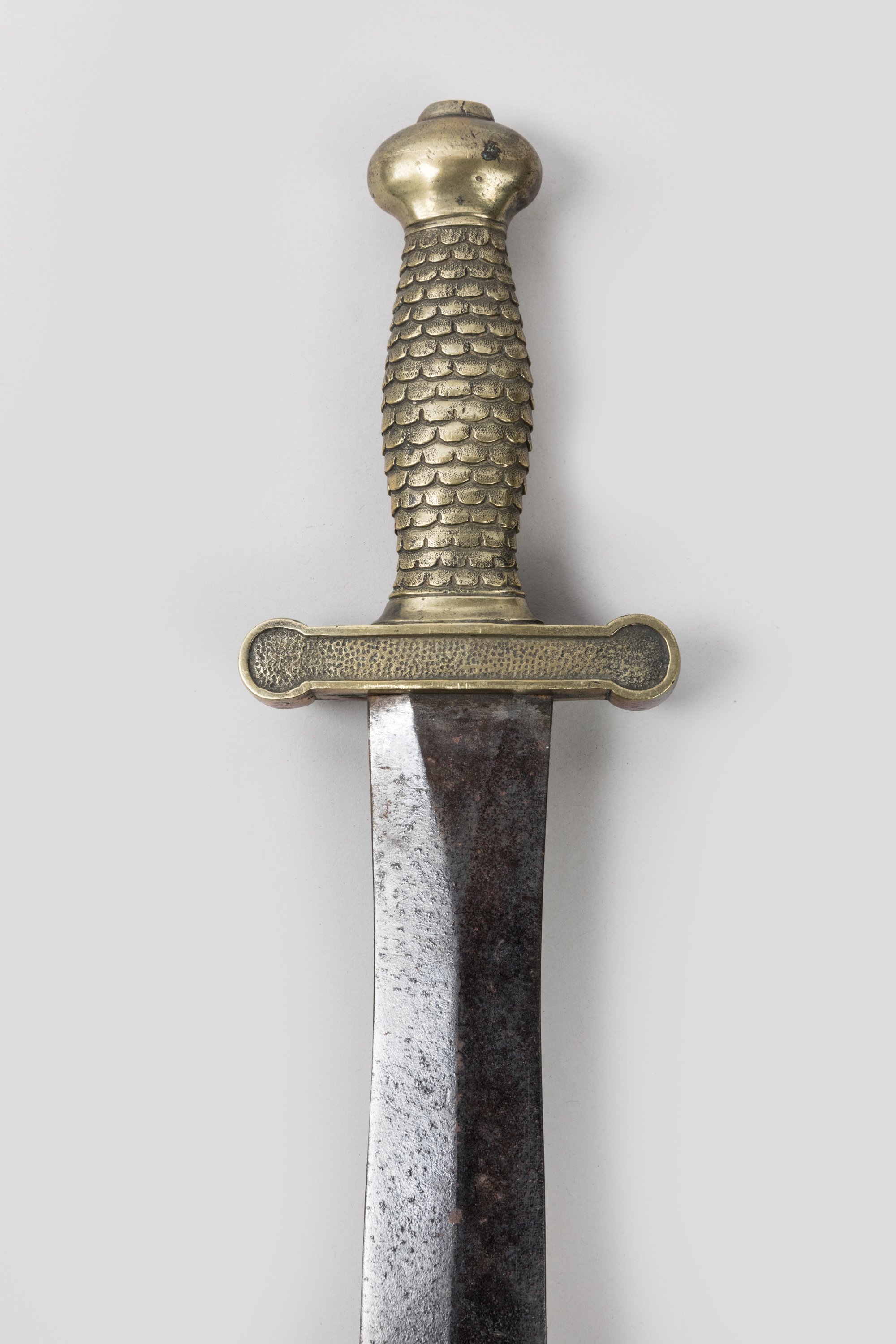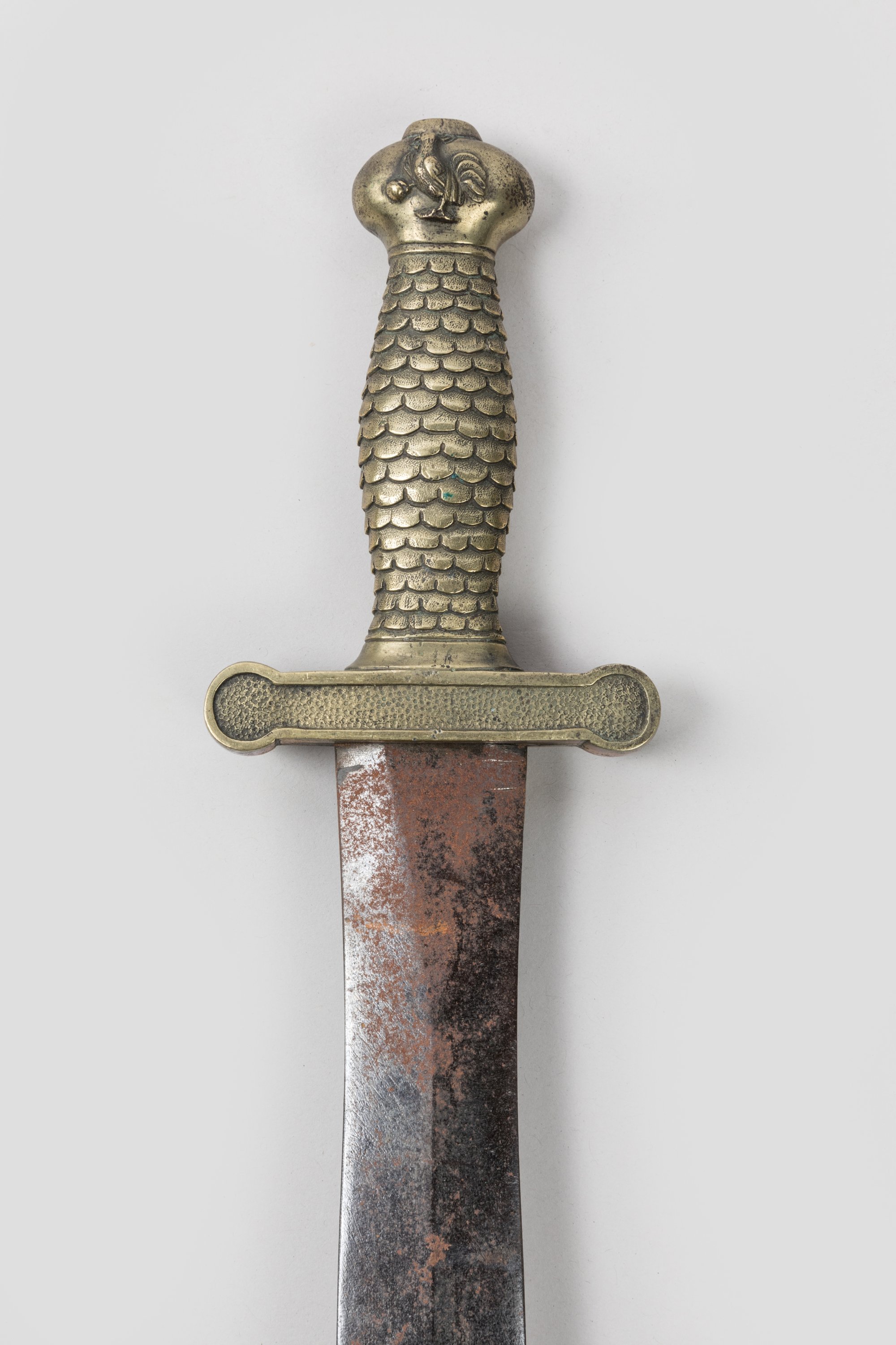 Monture en bronze, poignée à écailles à pommeau au coq. Lame à arête médiane.