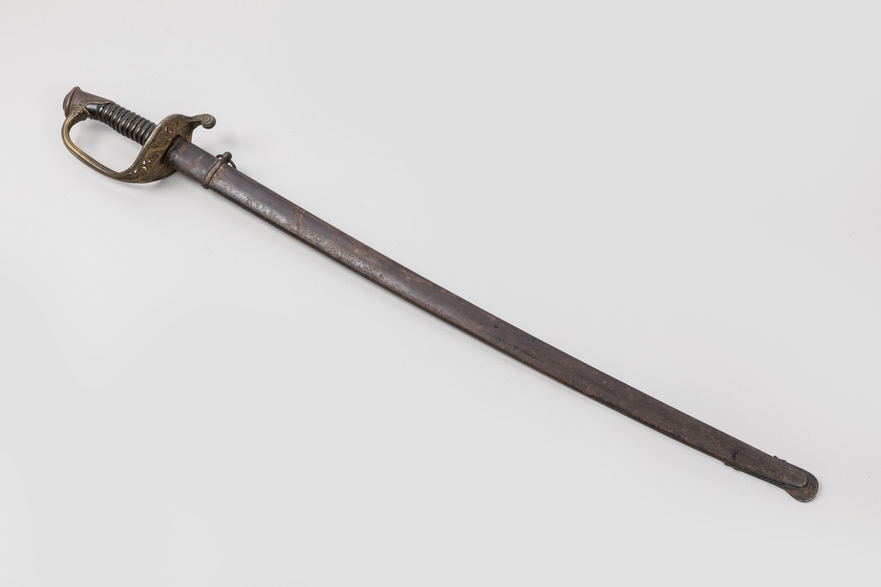 Poignée en corne avec restes de filigrane. Monture en laiton ciselé, patiné, garde à une branche ajourée.