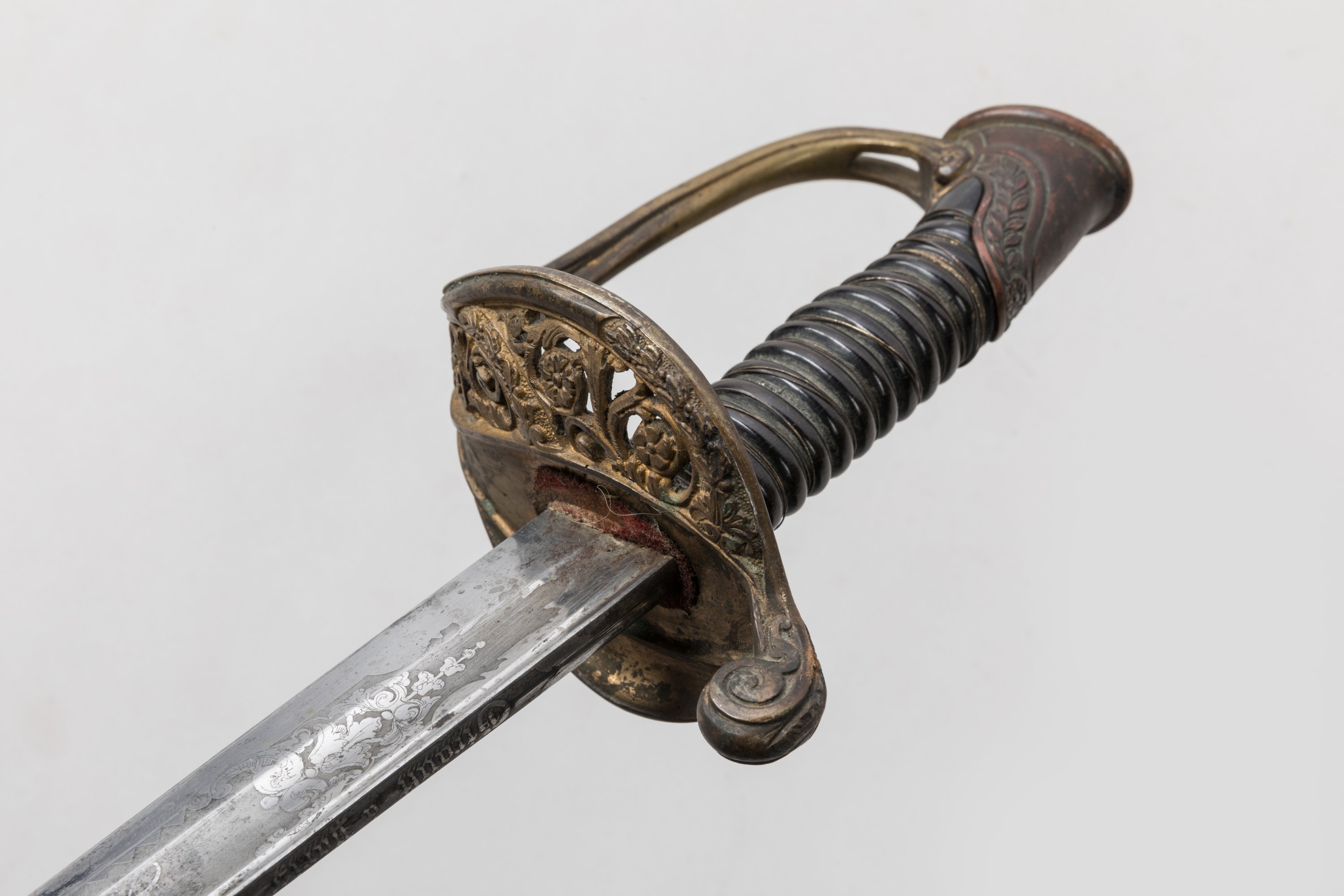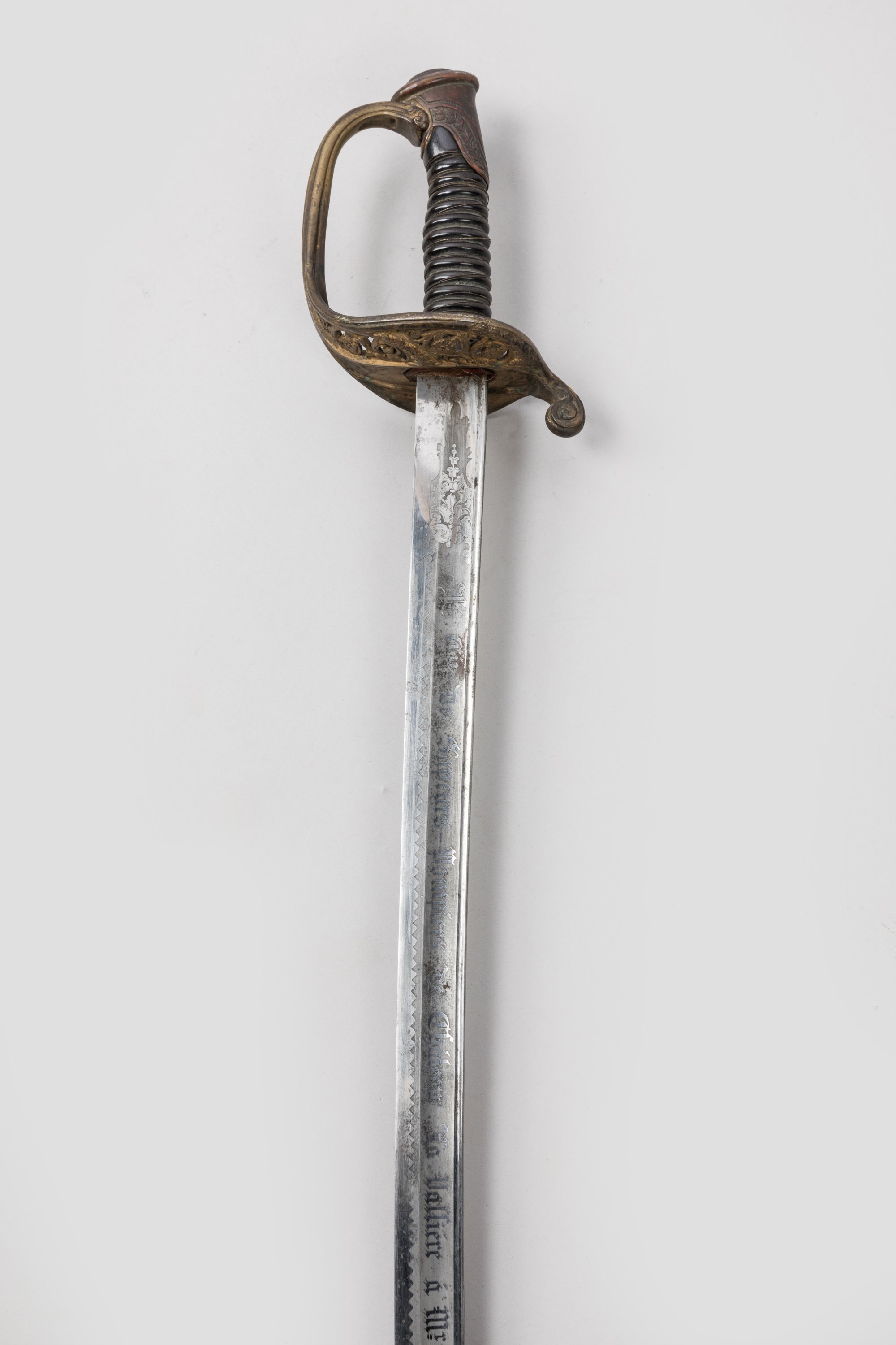 Lame cintrée à pans creux et gouttière, joliment gravée à l’acide au 2/3 de rinceaux feuillagés et d’un cartouche en lettres gothiques : « La Cie de Sapeurs-pompiers de Château La Vallière à Mr Hurt ». Dos signé « Giroult à Paris ».