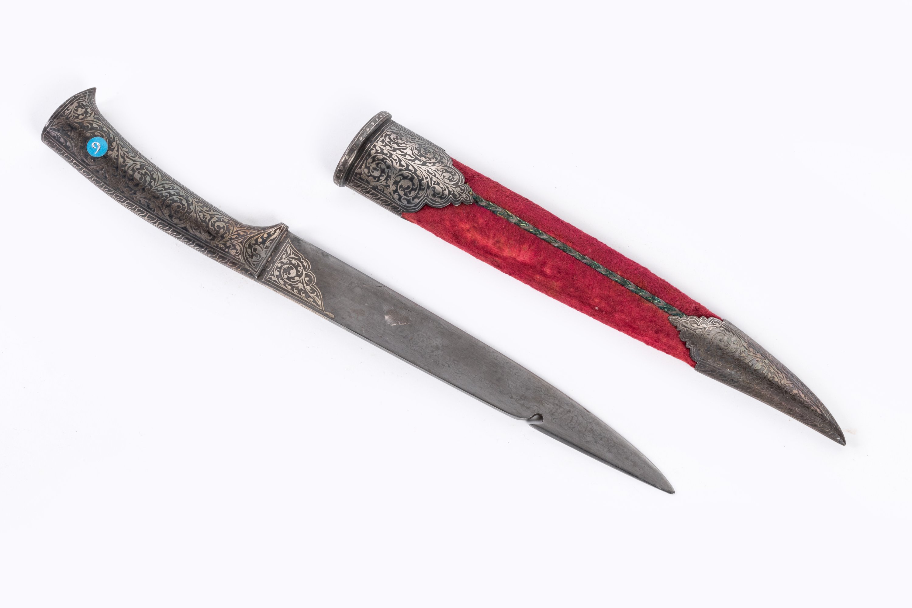 Poignée et garnitures du fourreau en fer damasquiné d’argent à décor de rinceaux. Lame damas émoussée à dos à croc. Fourreau de velours rouge postérieur.