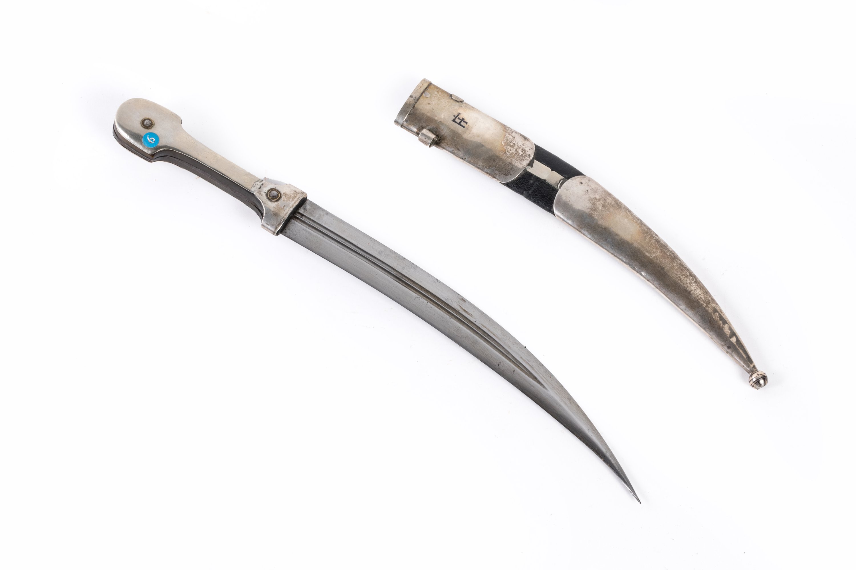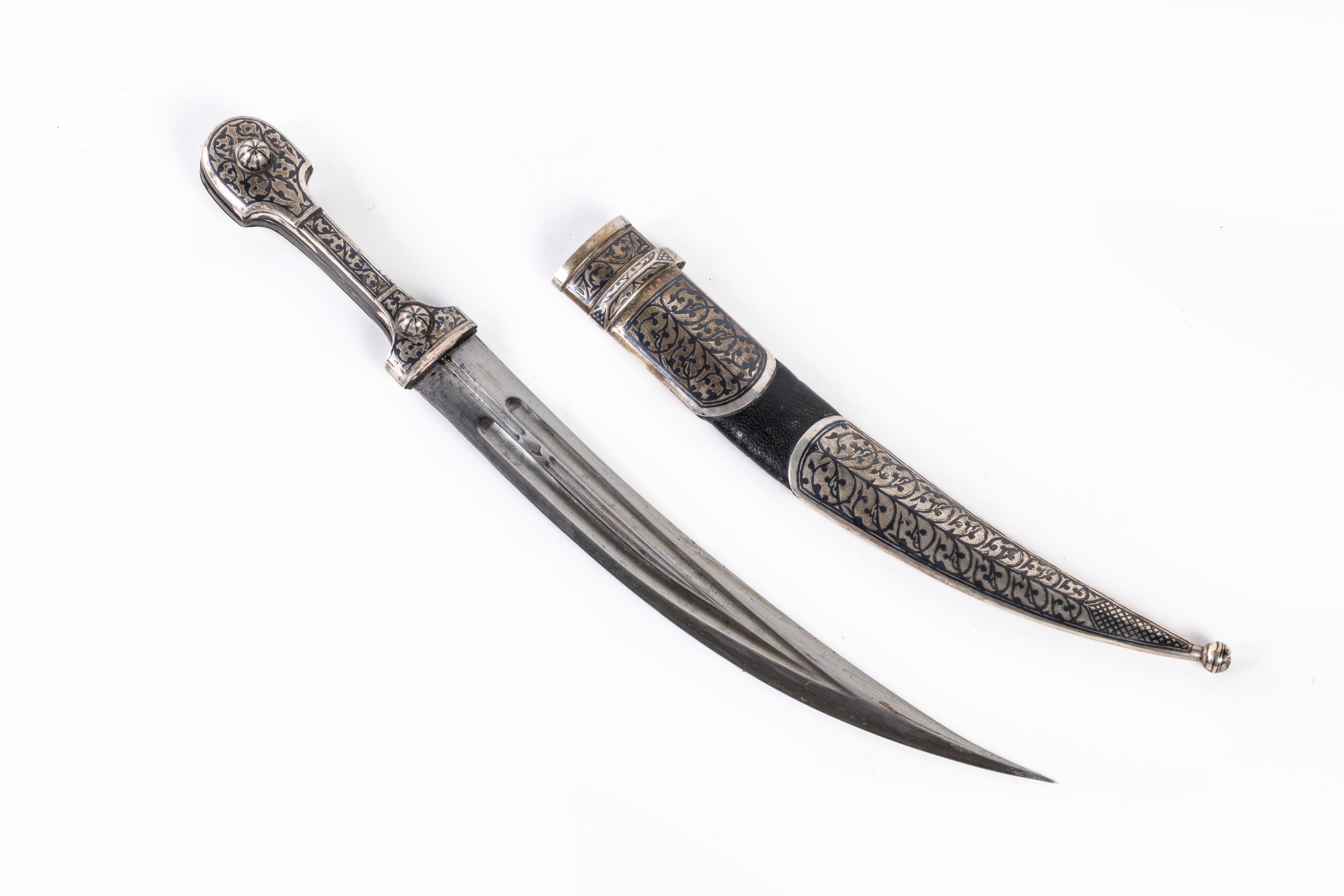 Monture et fourreau gravé de rinceaux en argent, entièrement gravé et niellé. Lame courbe à gouttière, poinçonnée. Fourreau recouvert de chagrin à deux garnitures.
