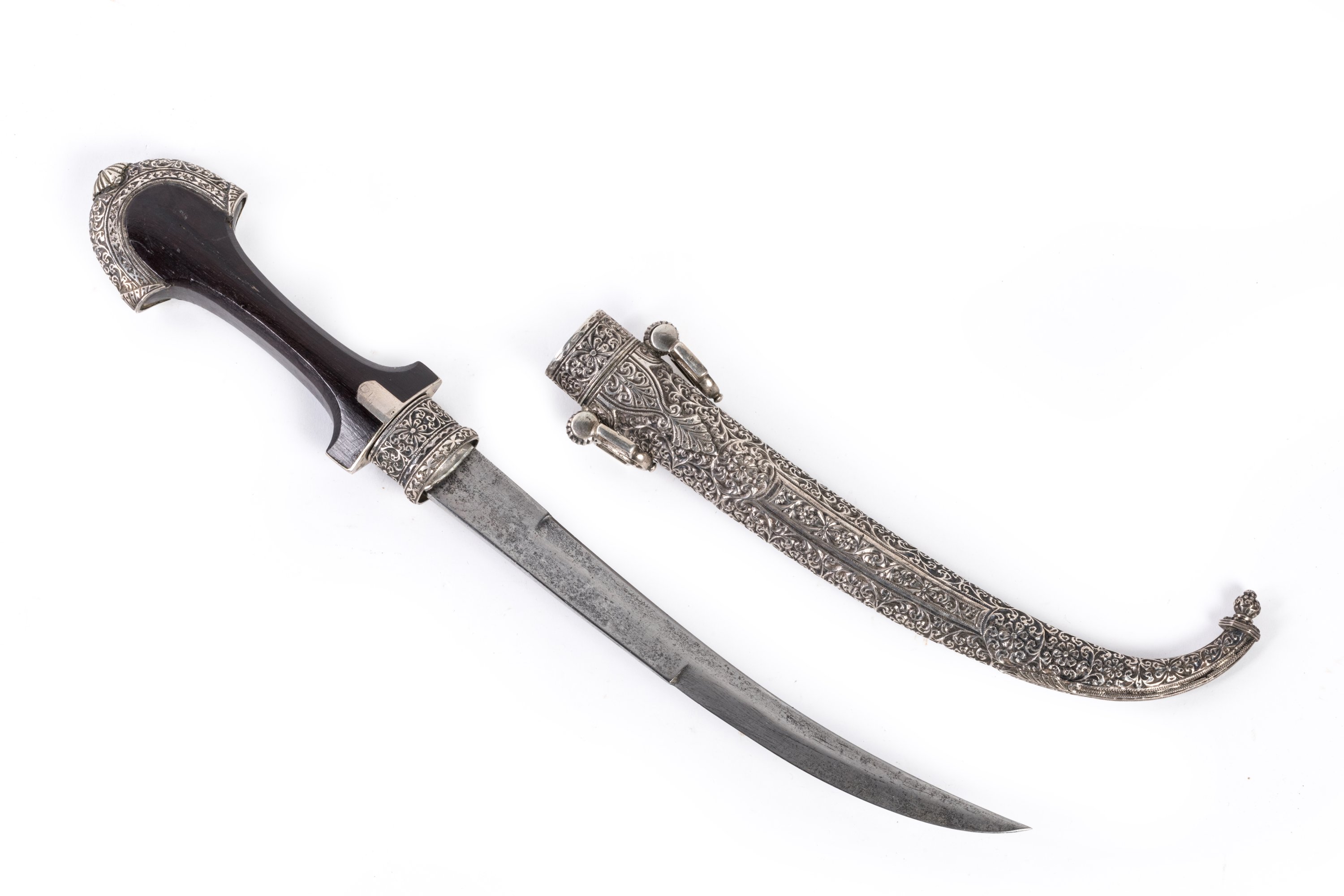 Poignée en bois verni. Monture et fourreau en métal argenté à décor de rinceaux.