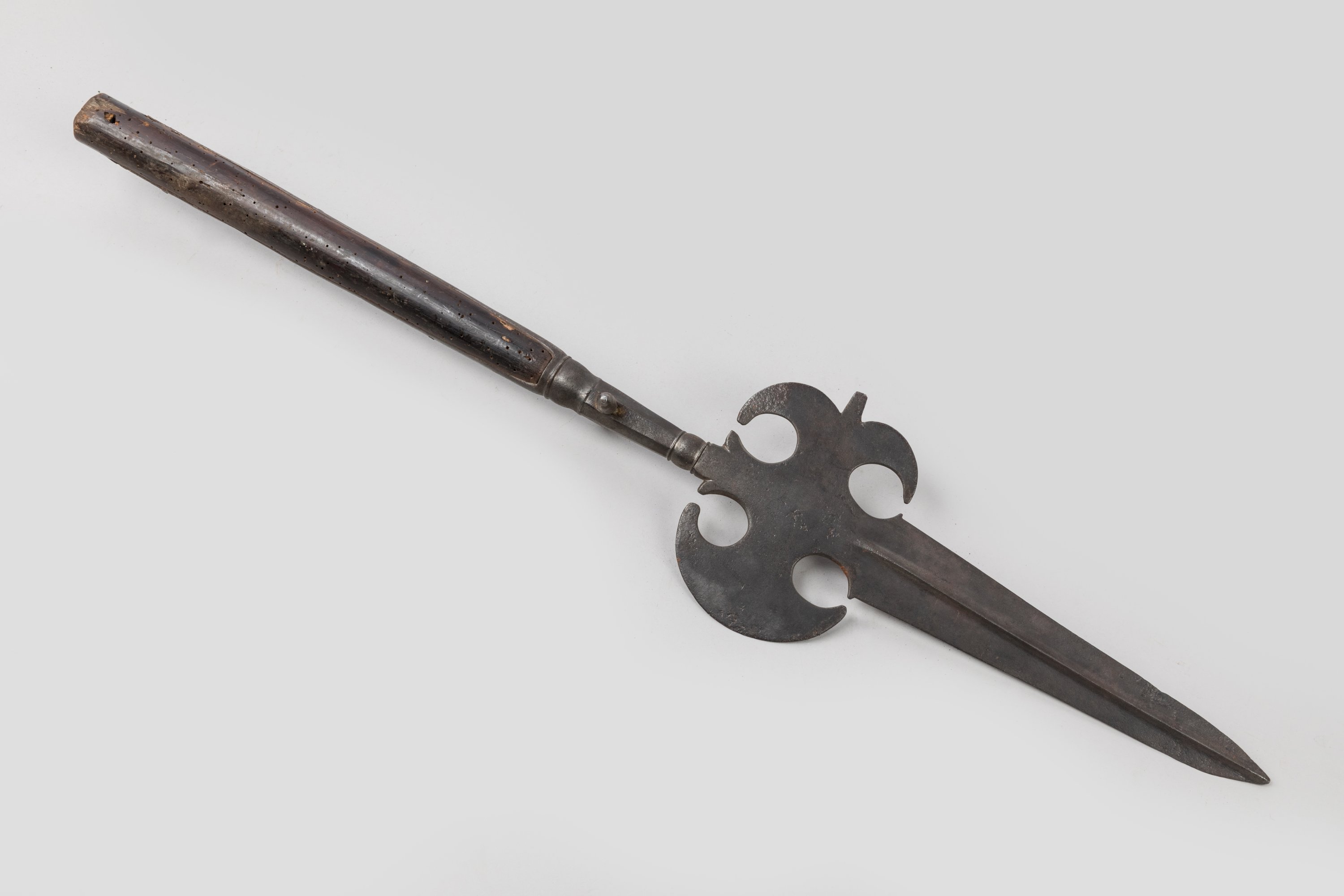 Fer à arête médiane, deux crocs découpés au talon. Douille à pans à deux attelles. Reste de hampe.