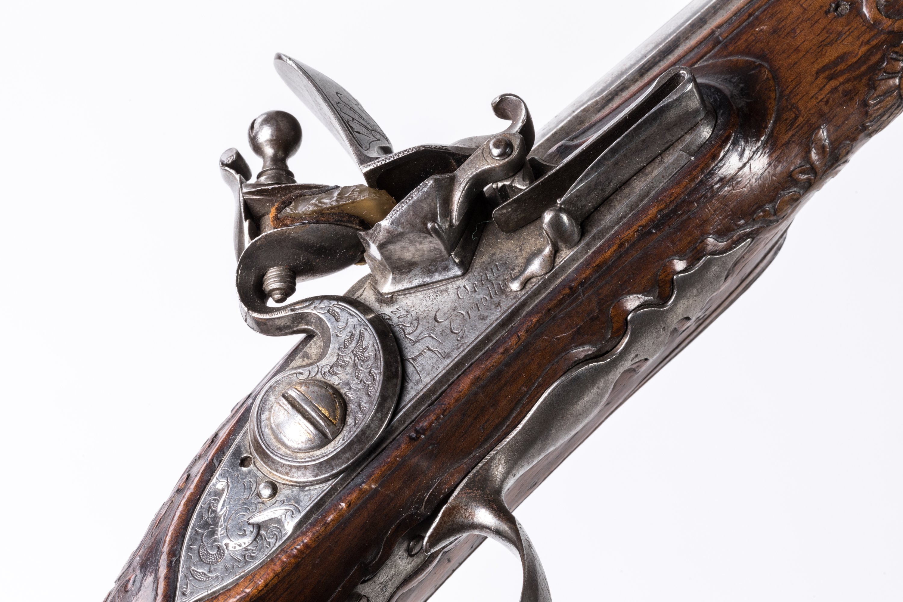 Canons ronds à méplats sur les dessus. Platines signées « JEAN GRIOTTIER » et chiens col de cygne à corps plat, gravés de rinceaux. Garnitures en fer ciselé (une contre platine anciennement changée). Pièces de pouce en argent, sous couronne de marquis (vierge). Montures en noyer (enture à l’avant de l’un des fûts).
