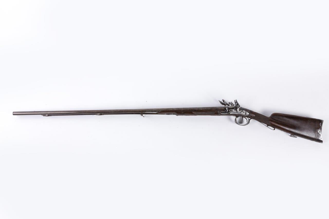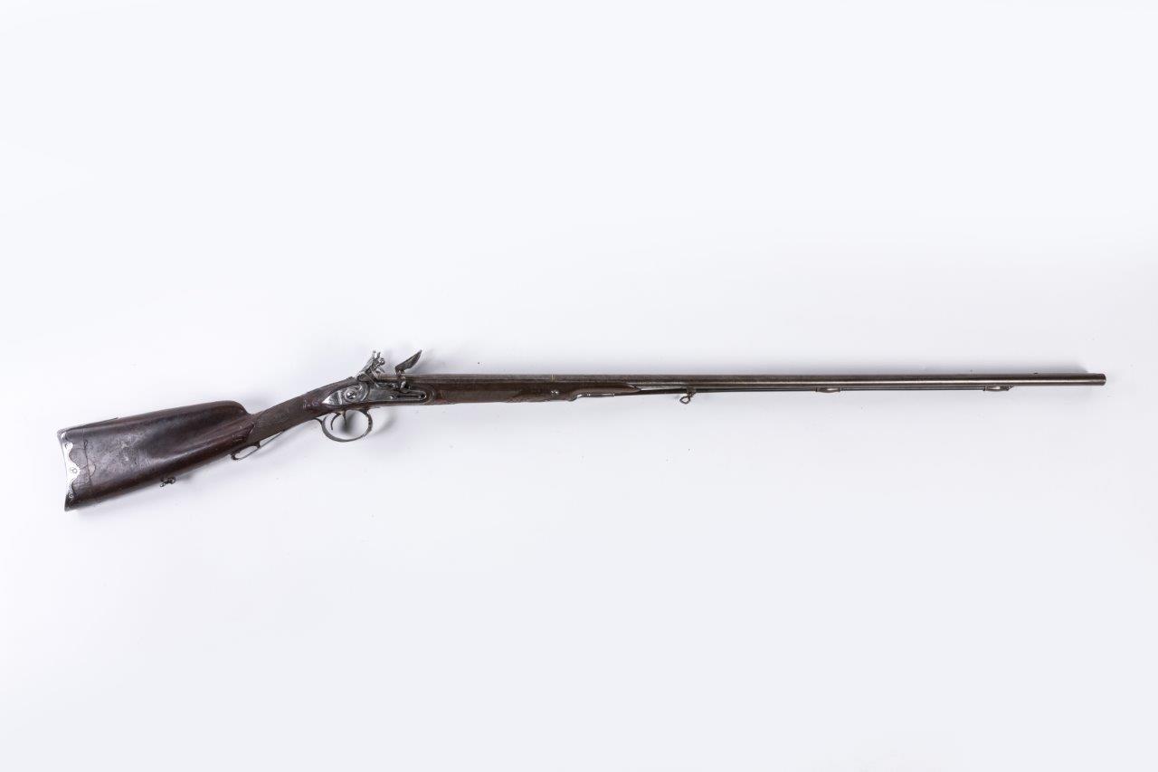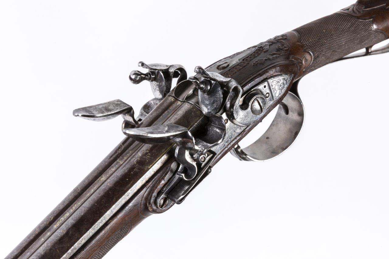 Canons en table gravés aux tonnerres de rinceaux, fleurs de lys et trophées, marqués sur la bande « CANON TORDU ». Platines avec restes de signature et chiens à corps plats. Garnitures en fer ciselé et gravé à décor fleuri.