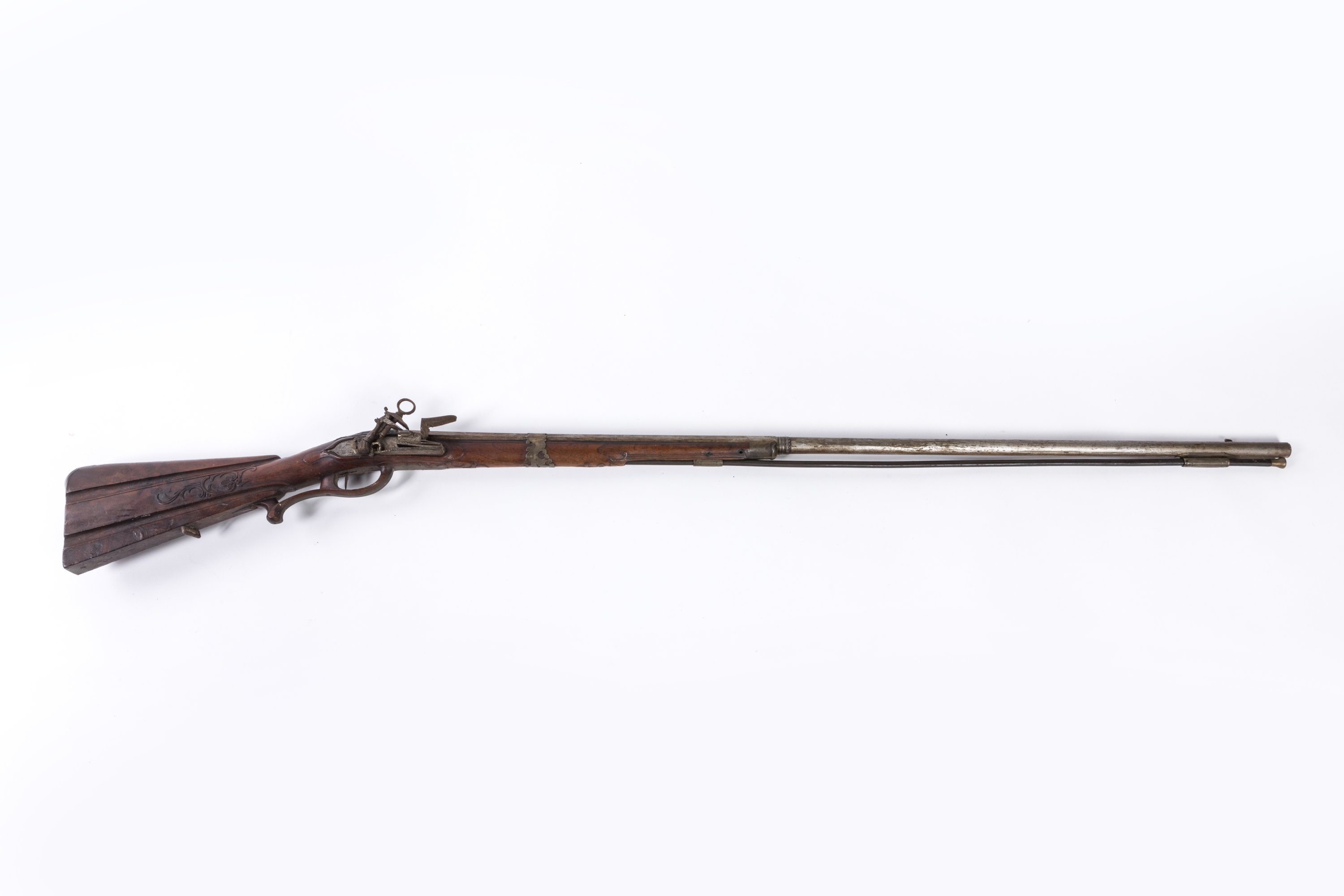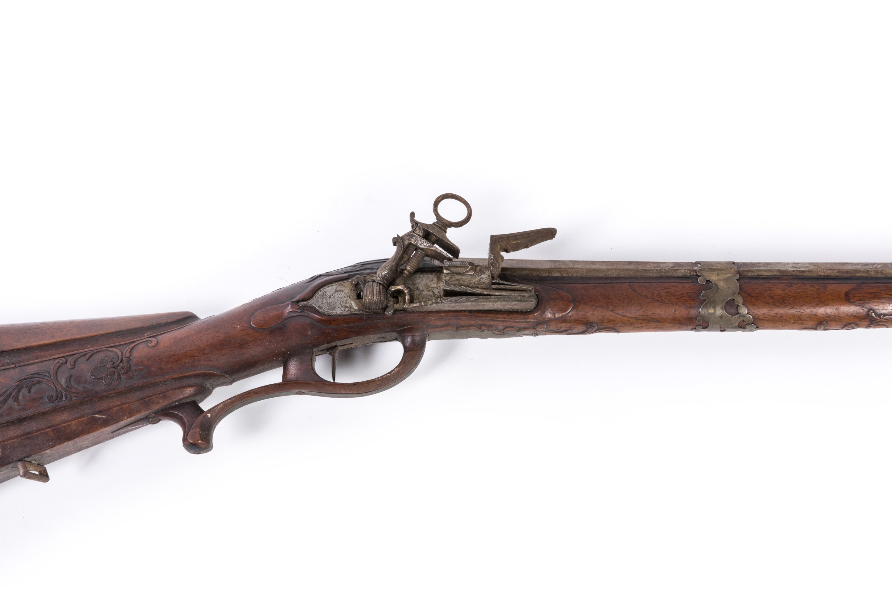 Belle platine à la Miquelet en fer ciselé et gravé de rinceaux et gibiers. Garnitures en argent découpé uni. Pontet en bois enrichi d’argent. Crosse à la Madrilène à joue en drapé sculptée de rinceaux fleuris.