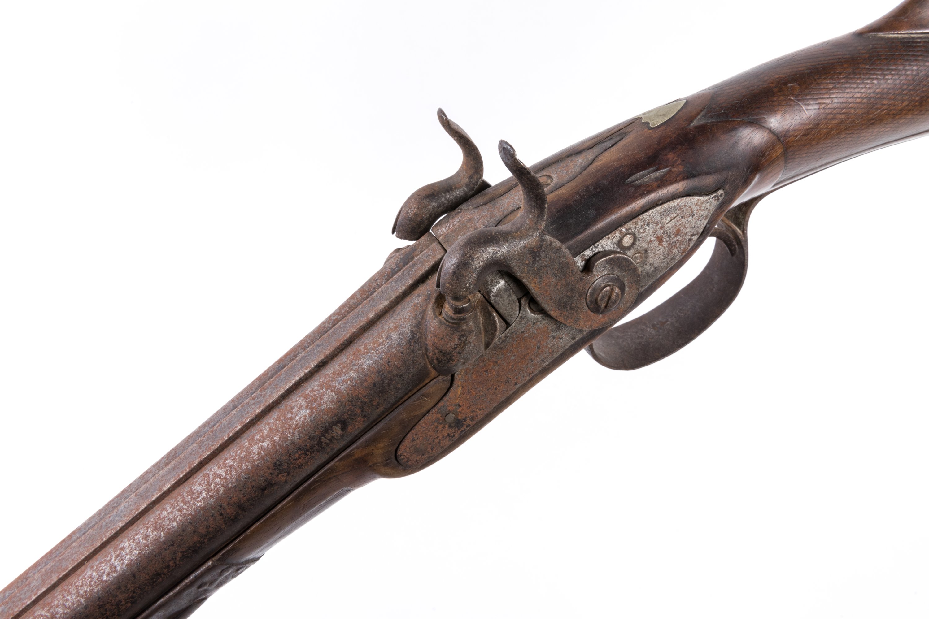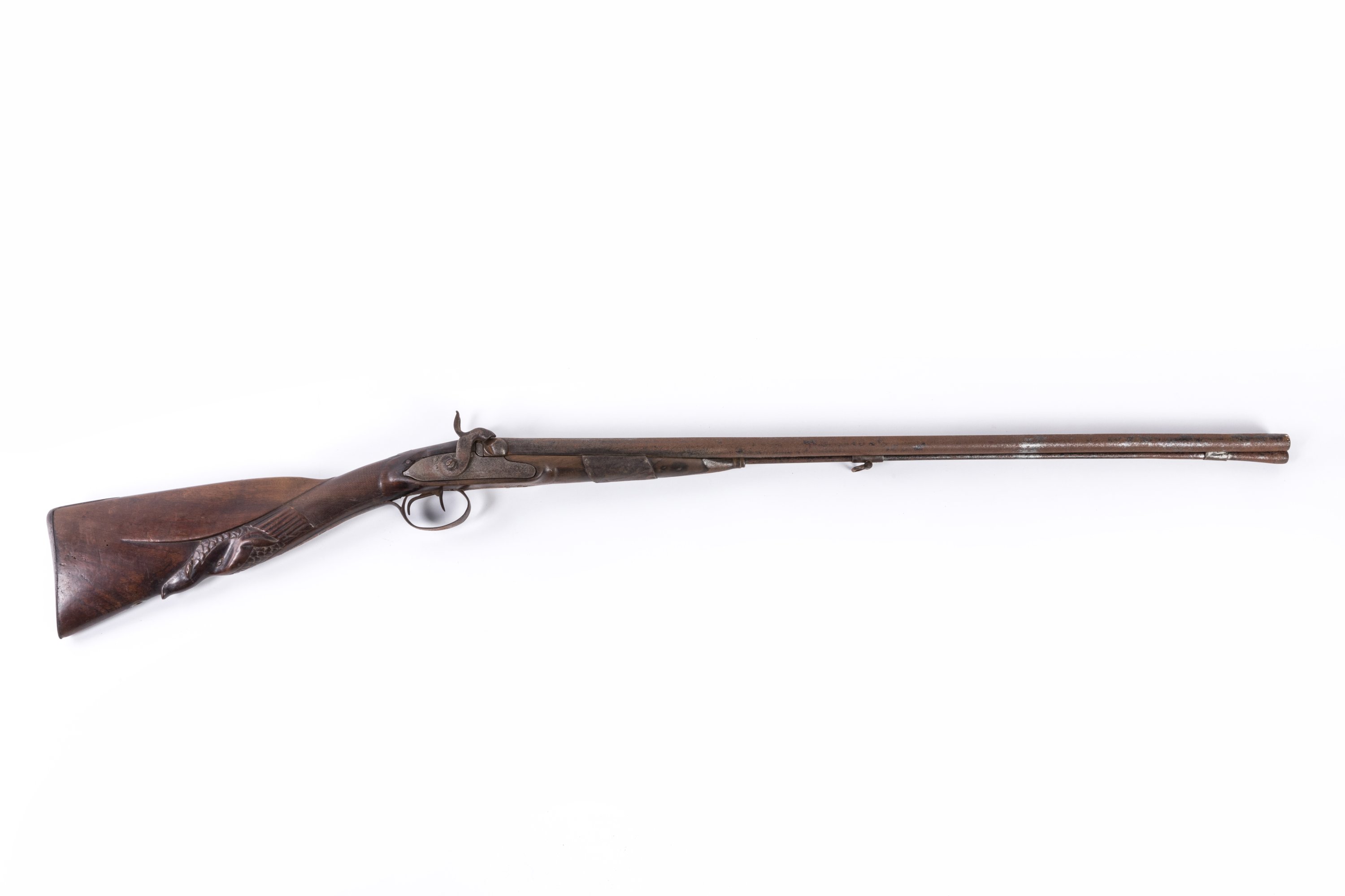 Garnitures en fer. Crosse sculptée d’une hure de sanglier (réparation à l’avant du fût). Baguette en fer.