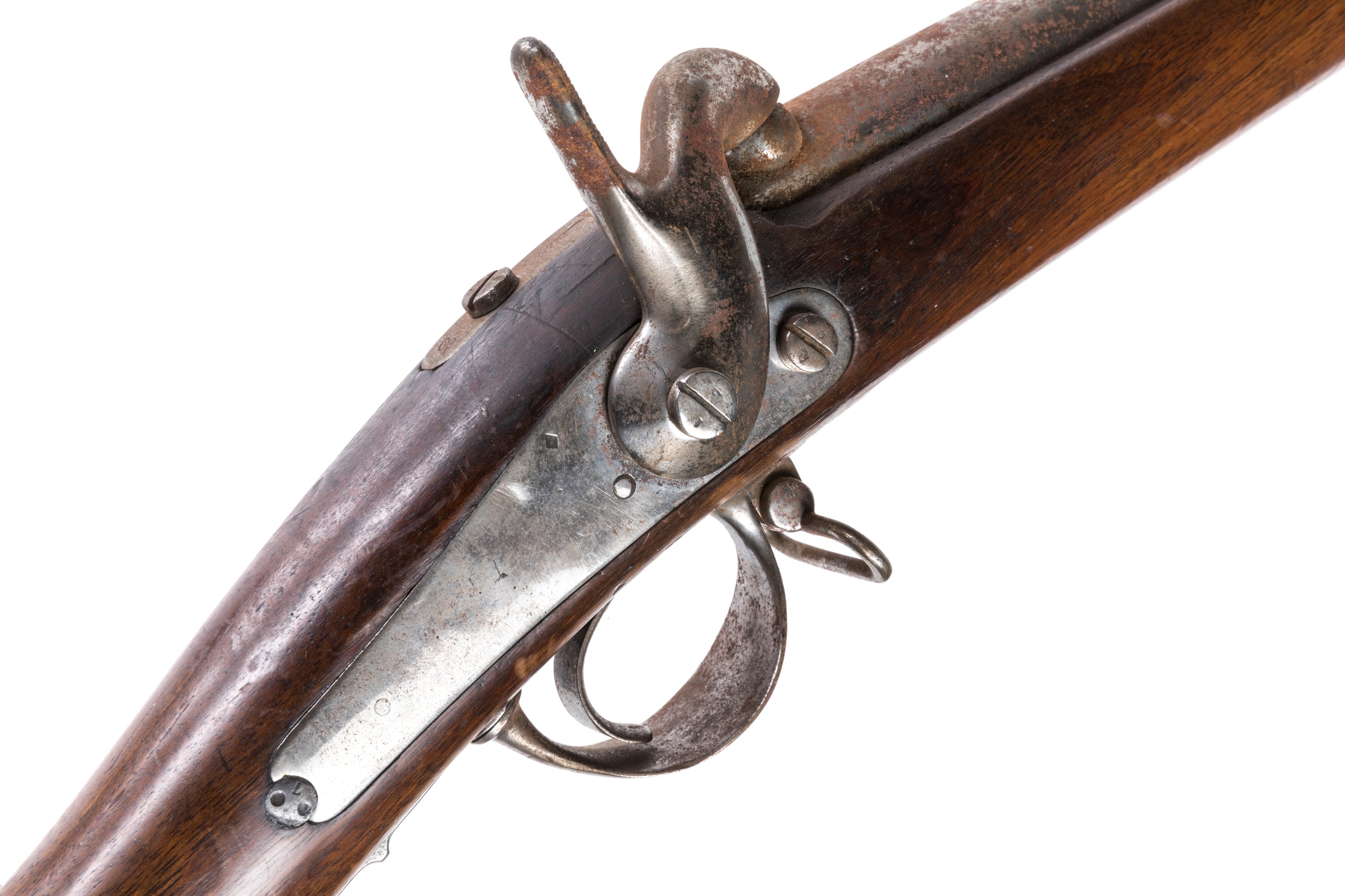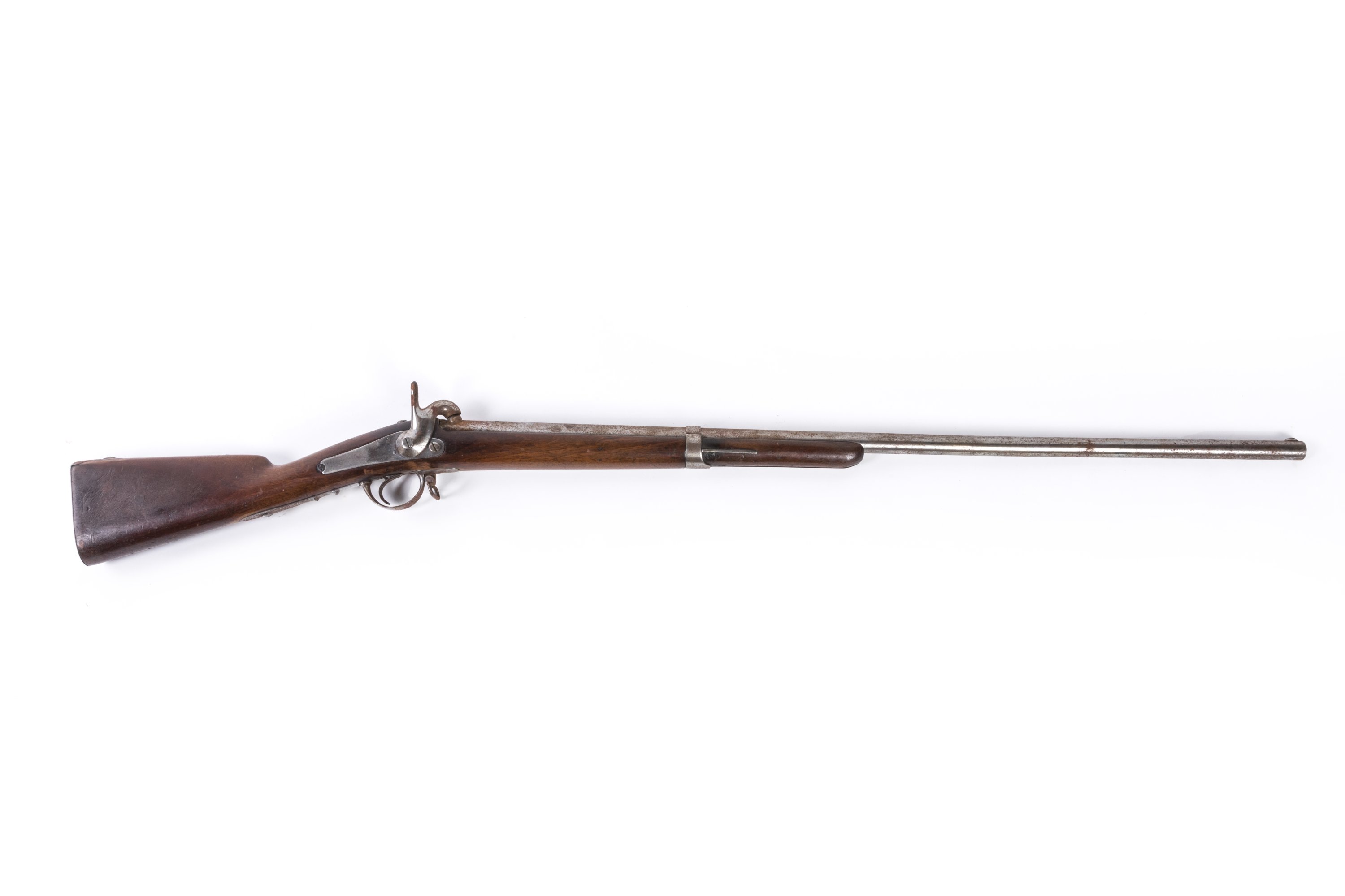 Canon rond à pans au tonnerre. Queue de culasse frappée « 1842 T ». Platine vierge. Garnitures en fer. Monture à fût raccourci et crosse en noyer.