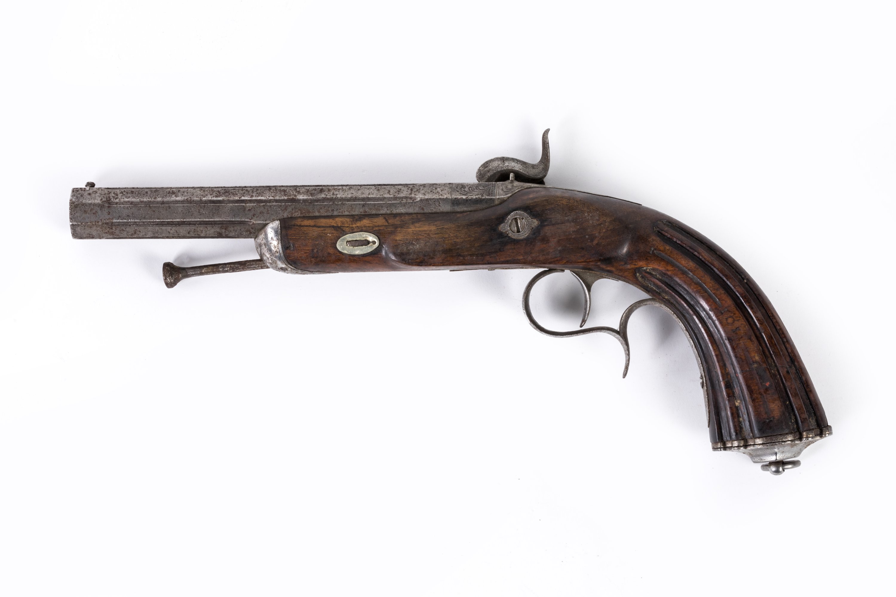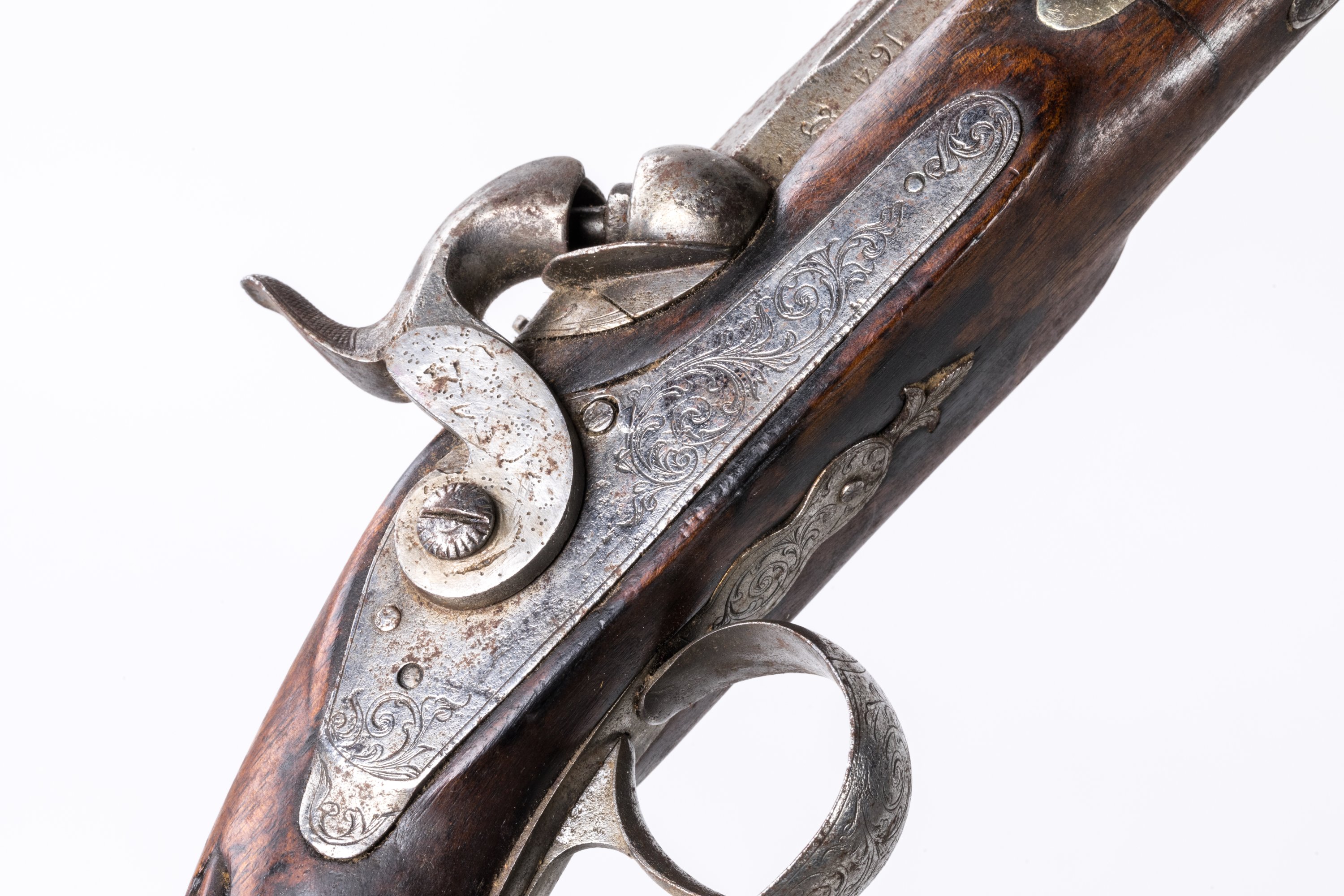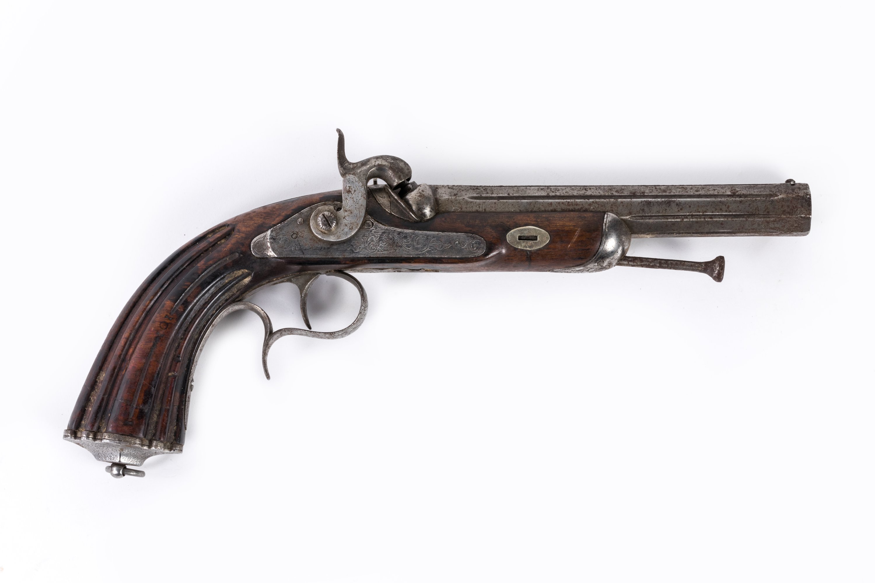 Canon à pans, à arête cannelée. Platine et chien gravé de rinceaux. Crosse sculptée. Calotte pivotante pour le rangement des balles. Baguette en fer.