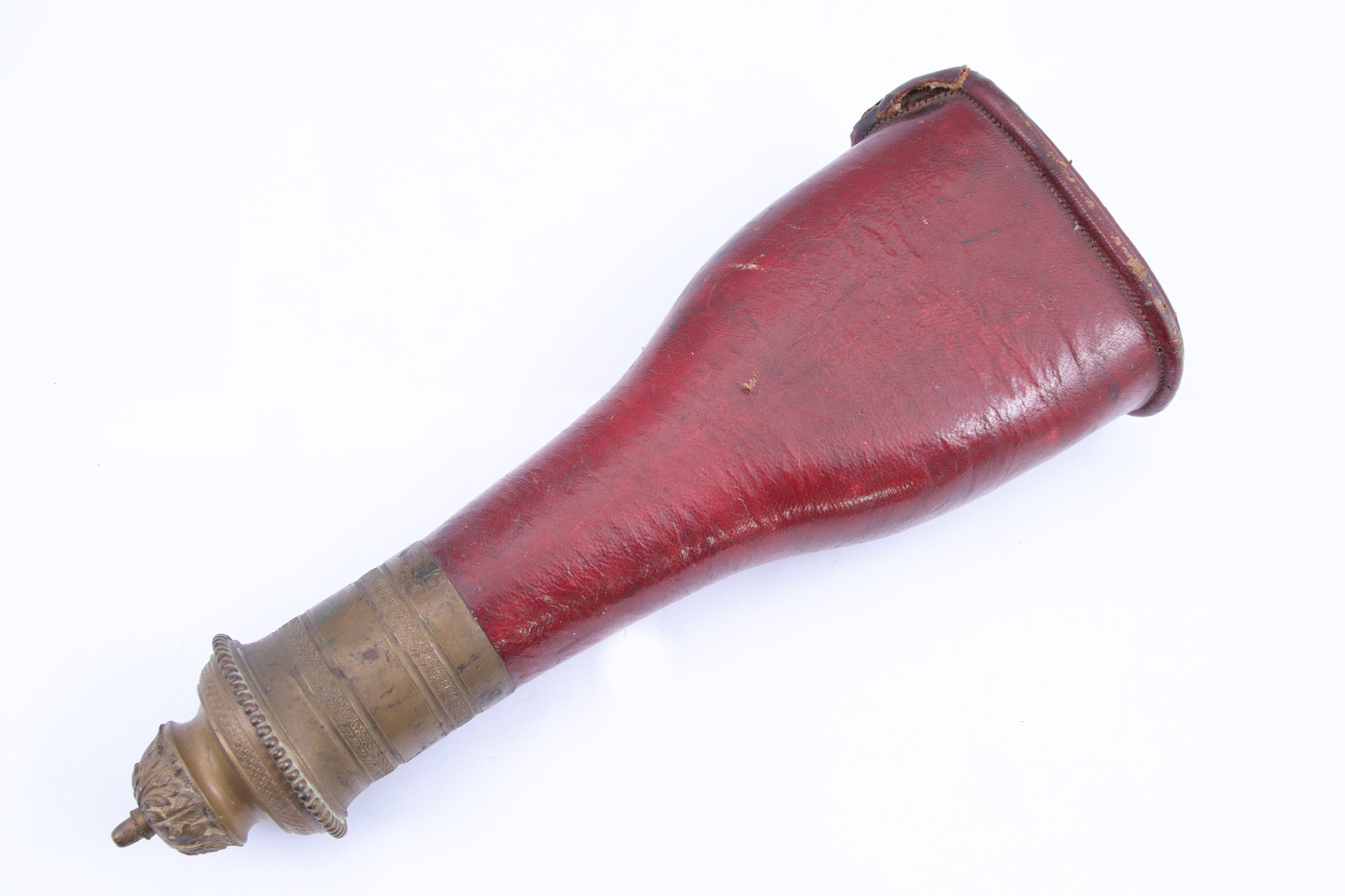 Joint : fonte de cavalerie en maroquin rouge, embout en laiton, vers 1830.