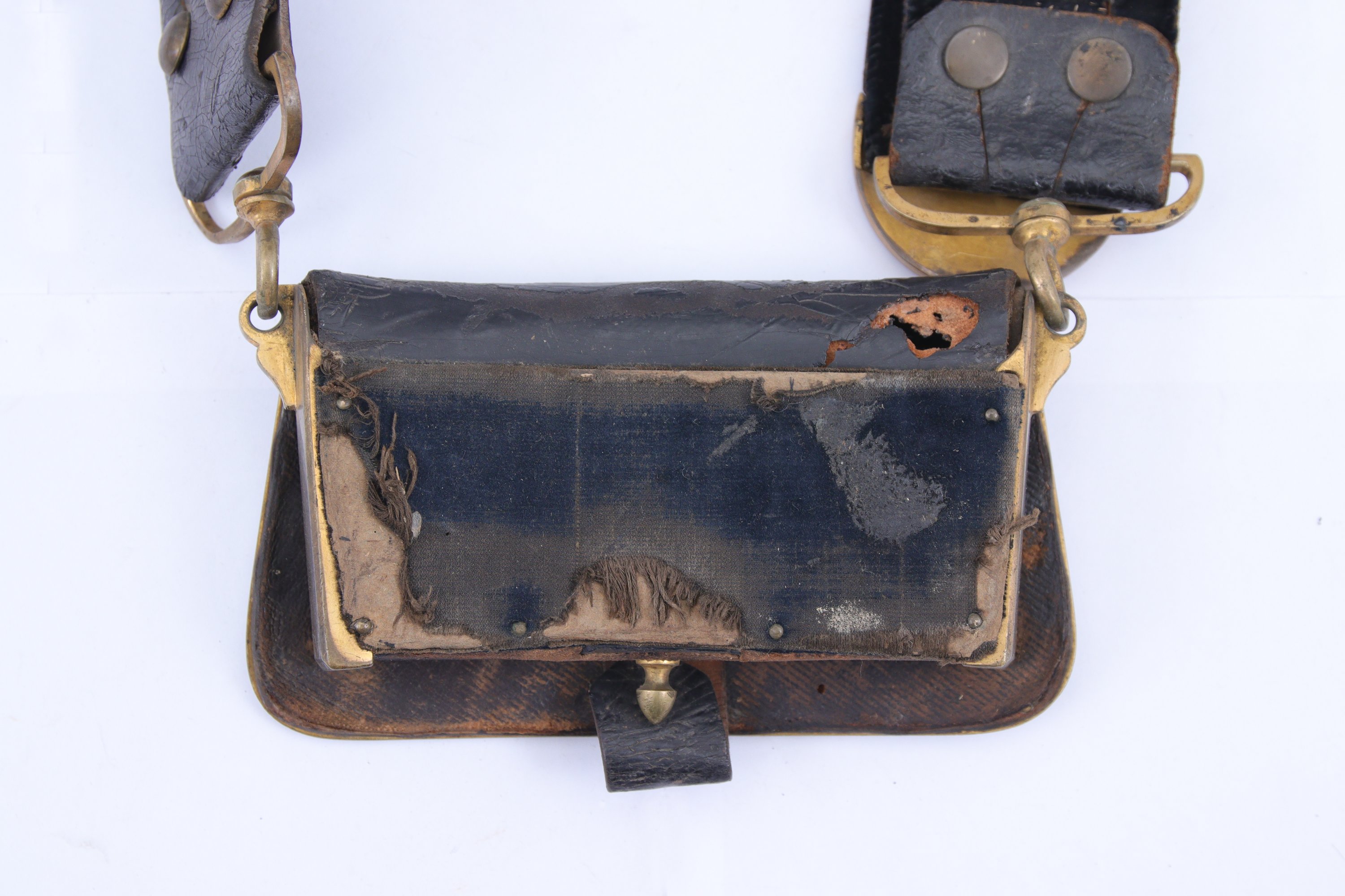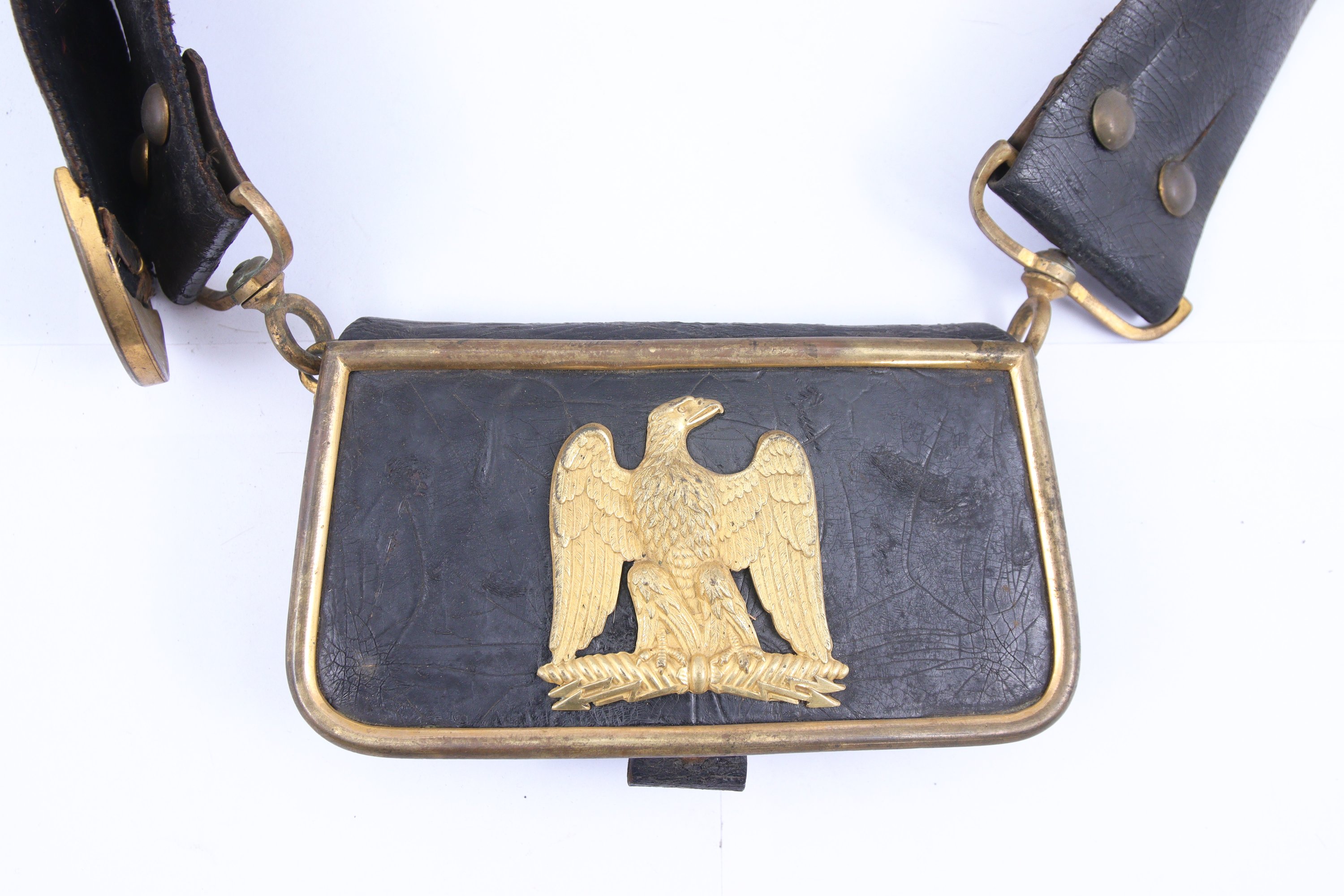 Joints : Deux banderoles. L'une d’officier de service de santé, en cuir noir à motifs en laiton doré, IIIe République ; l'autre d’officier espagnol, recouverte de galon doré à motif de fleurs de lys, doublée de soie rosée, garnitures en laiton à motif de grenade argentée. Fin du XIXe siècle.