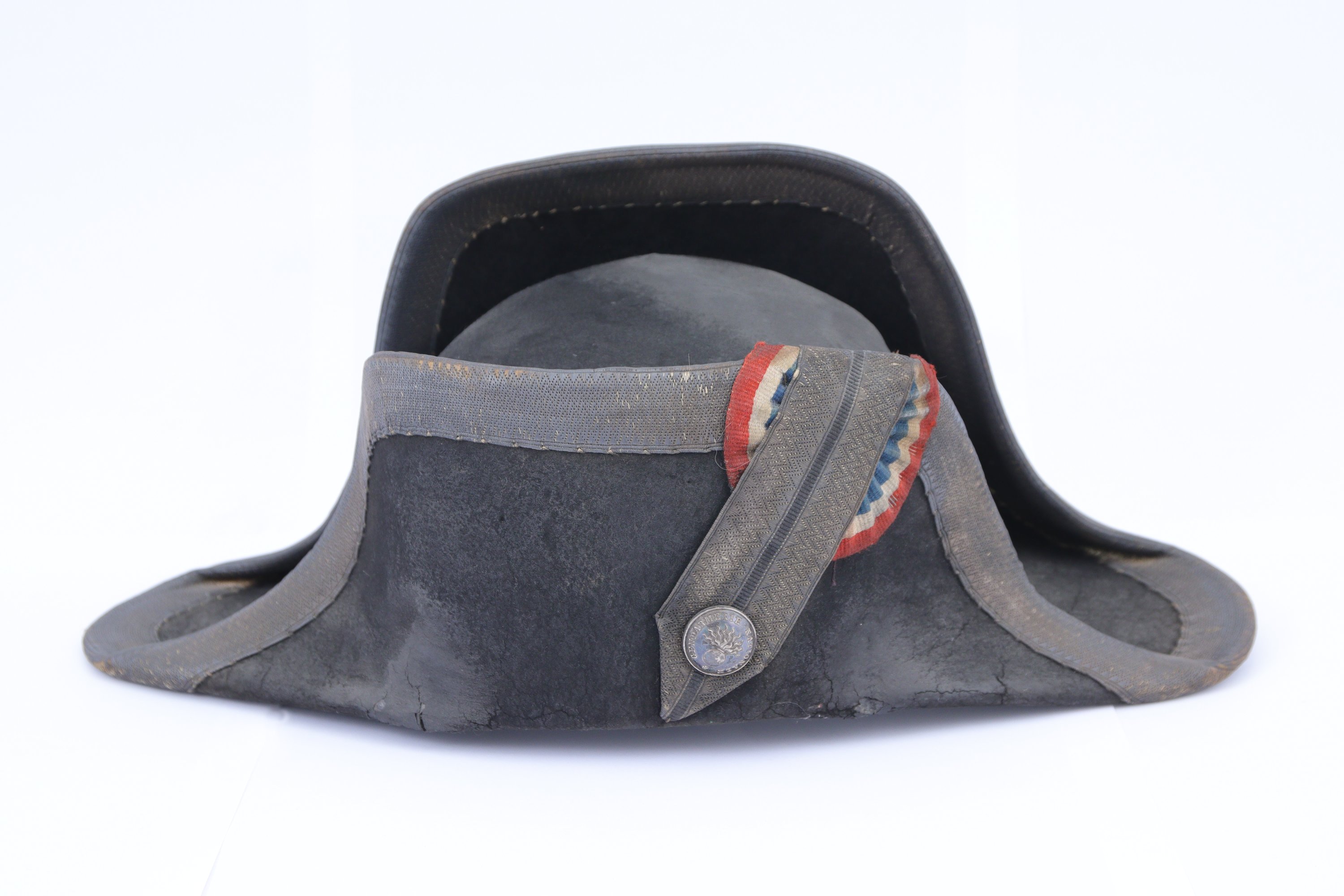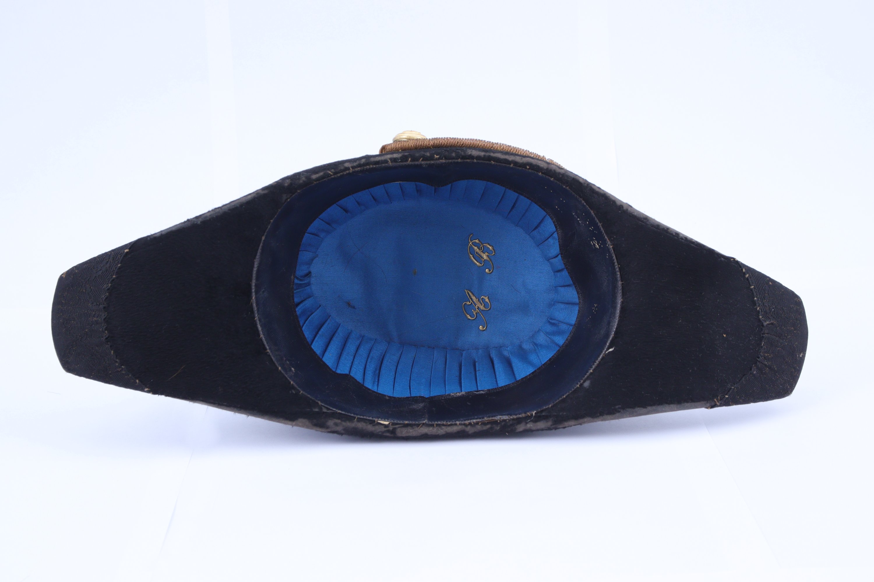 - Bicorne d’officier de marine. En feutre taupé. Ganse en passementerie et bouton à l’ancre, dorés. Galon en passementerie noire à décor d’ancre. Coiffe intérieure en satinette bleue, à motifs en laiton doré « AB » et bandeau en cuir. IIIe République. A.B.E.