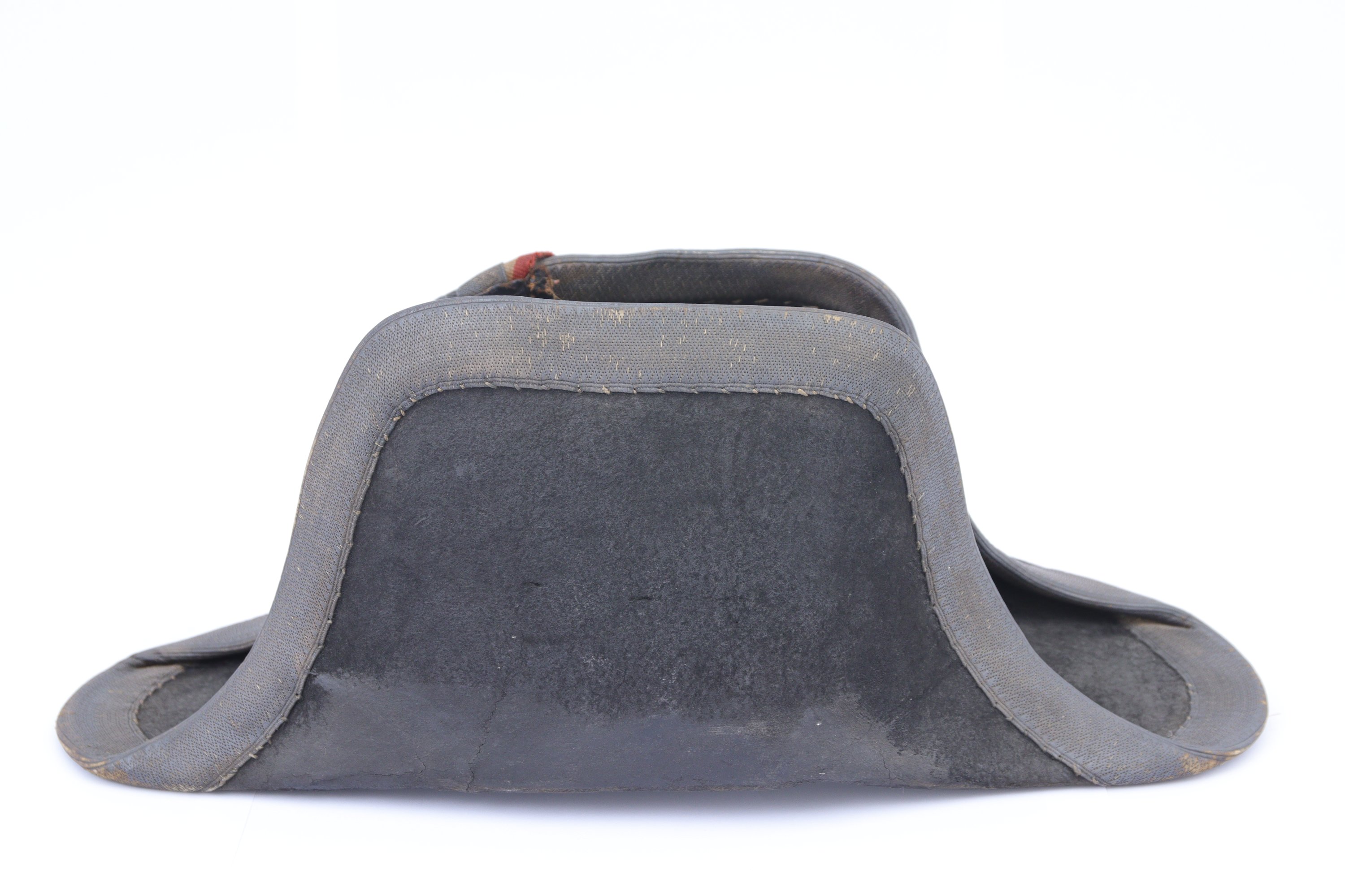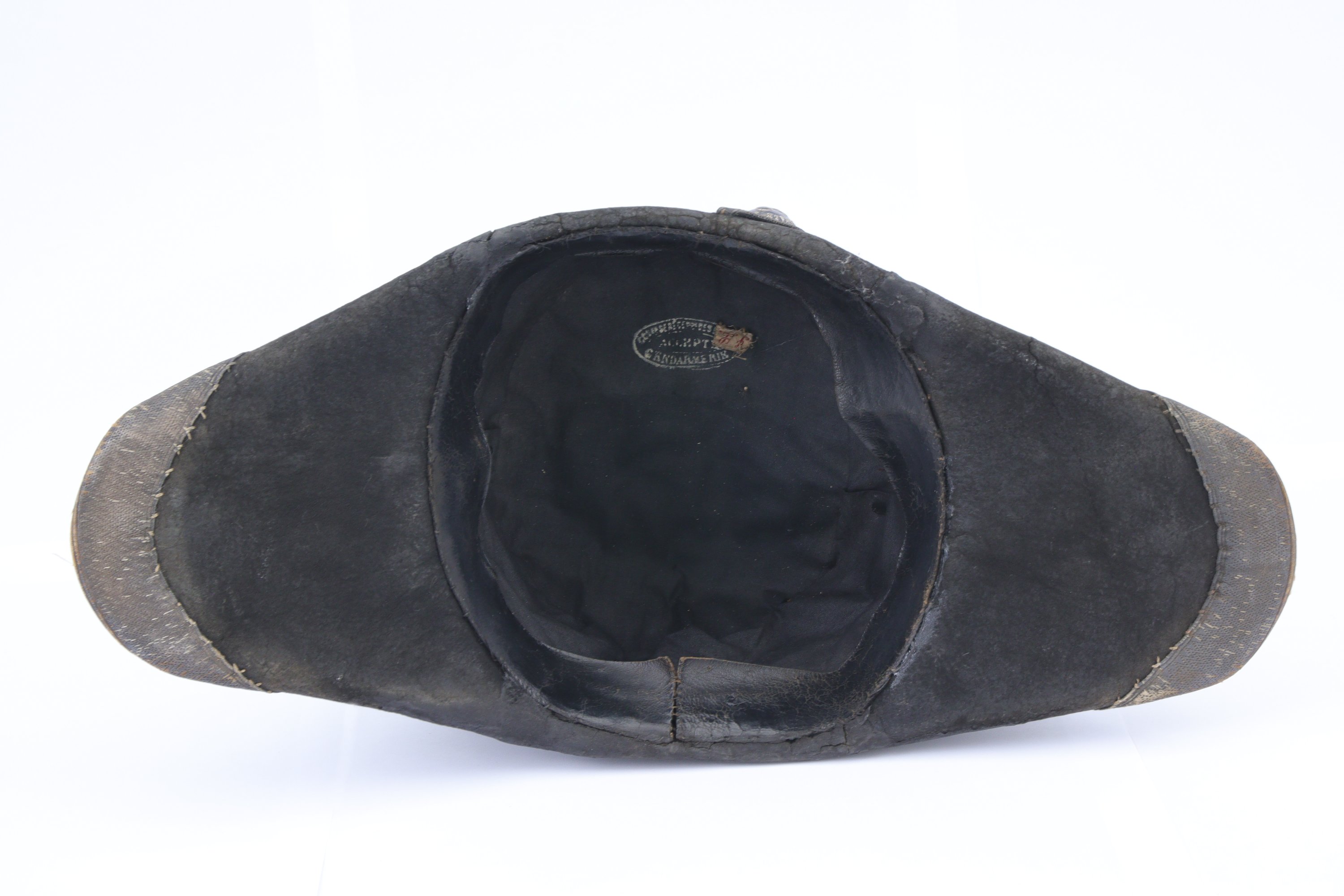 - Bicorne de gendarmerie, modèle 1895. En feutre taupé. Galon en passementerie argentée, à lézardes. Bouton argenté à la grenade. Cocarde brodée tricolore. Coiffe intérieure à bandeau en cuir. IIIe République. A.B.E.