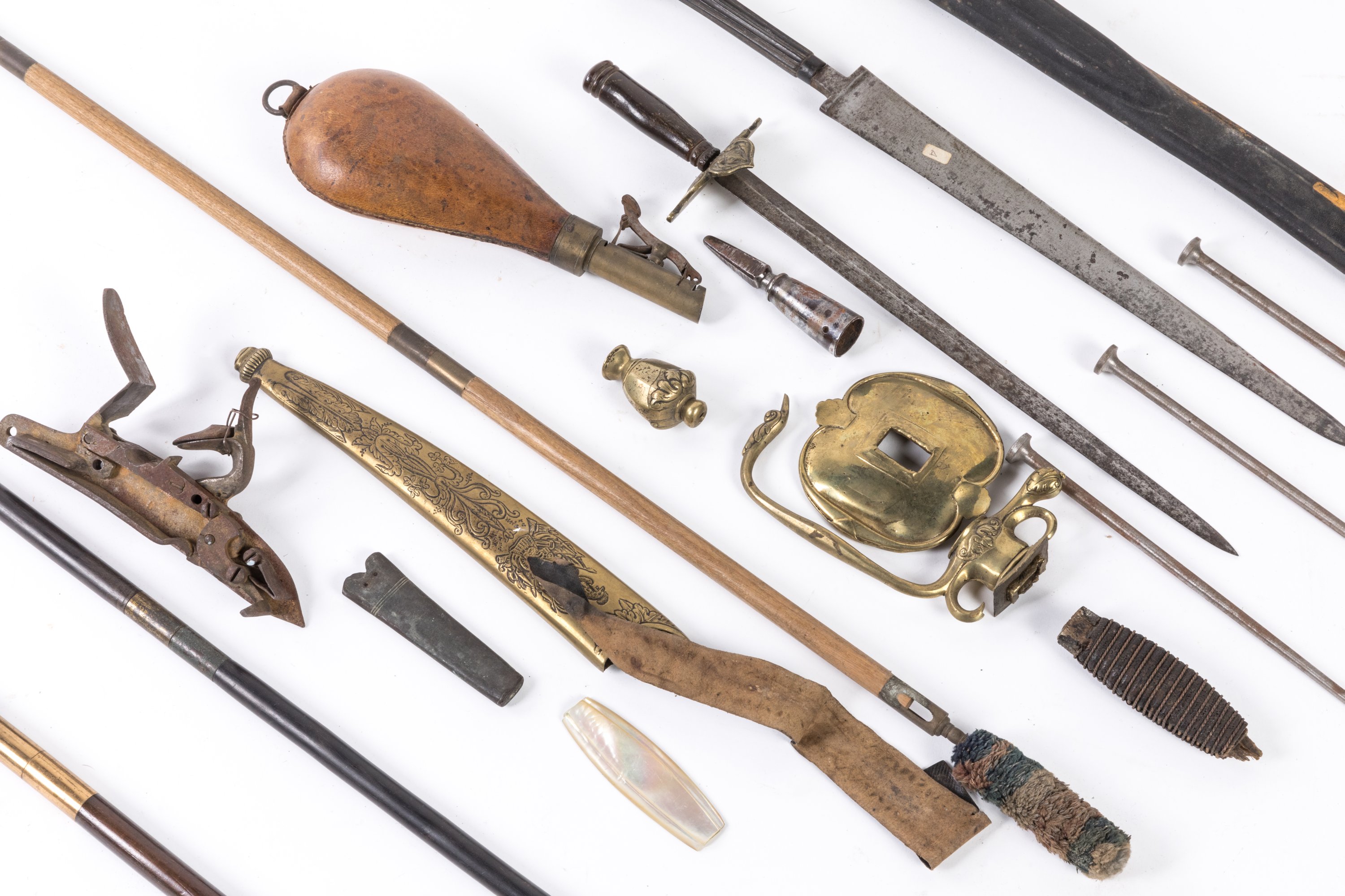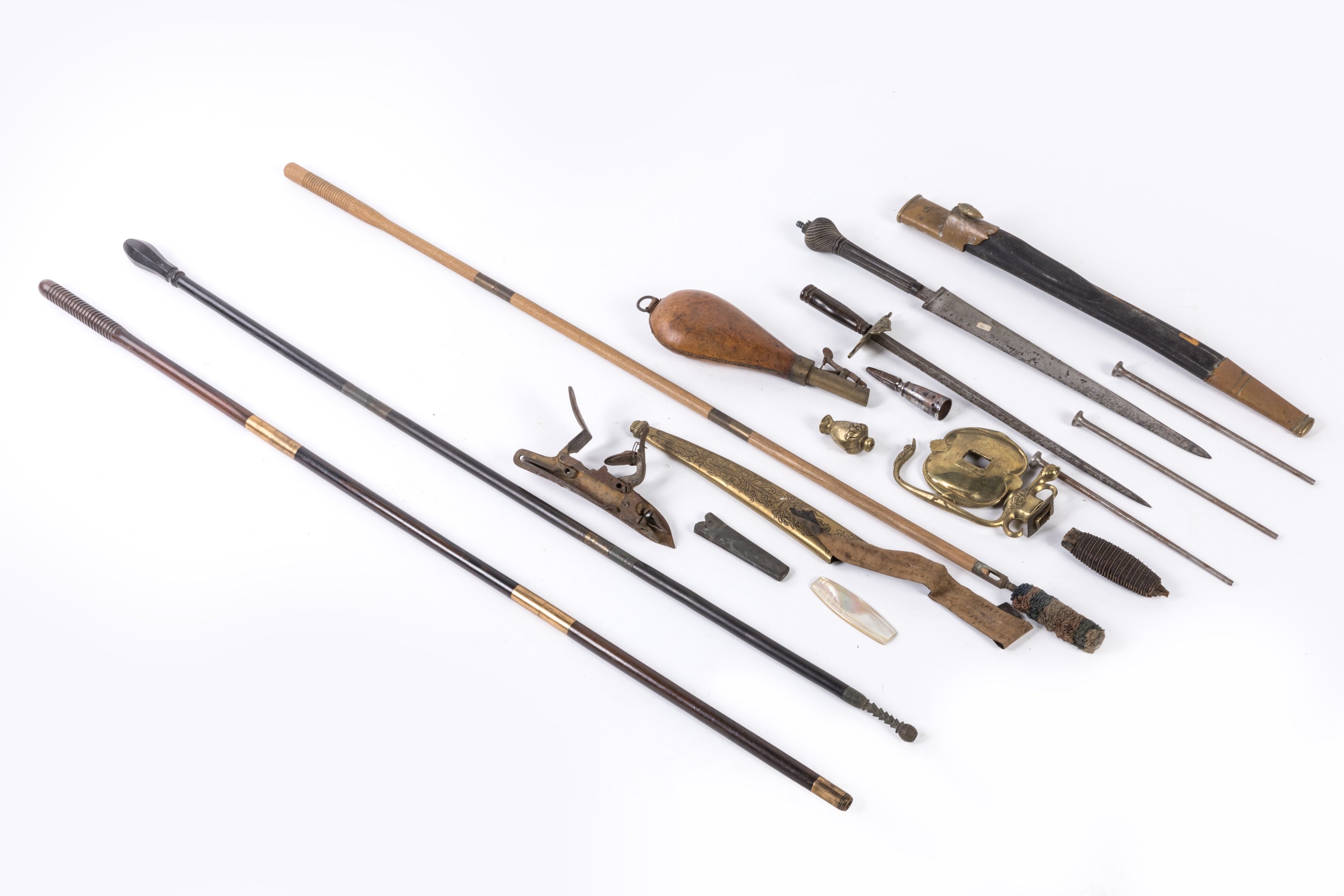 Platine, poire à poudre, baguettes de nettoyage, fusée d’épée, bouterole de sabre modèle 1821 de luxe, baïonnette, etc