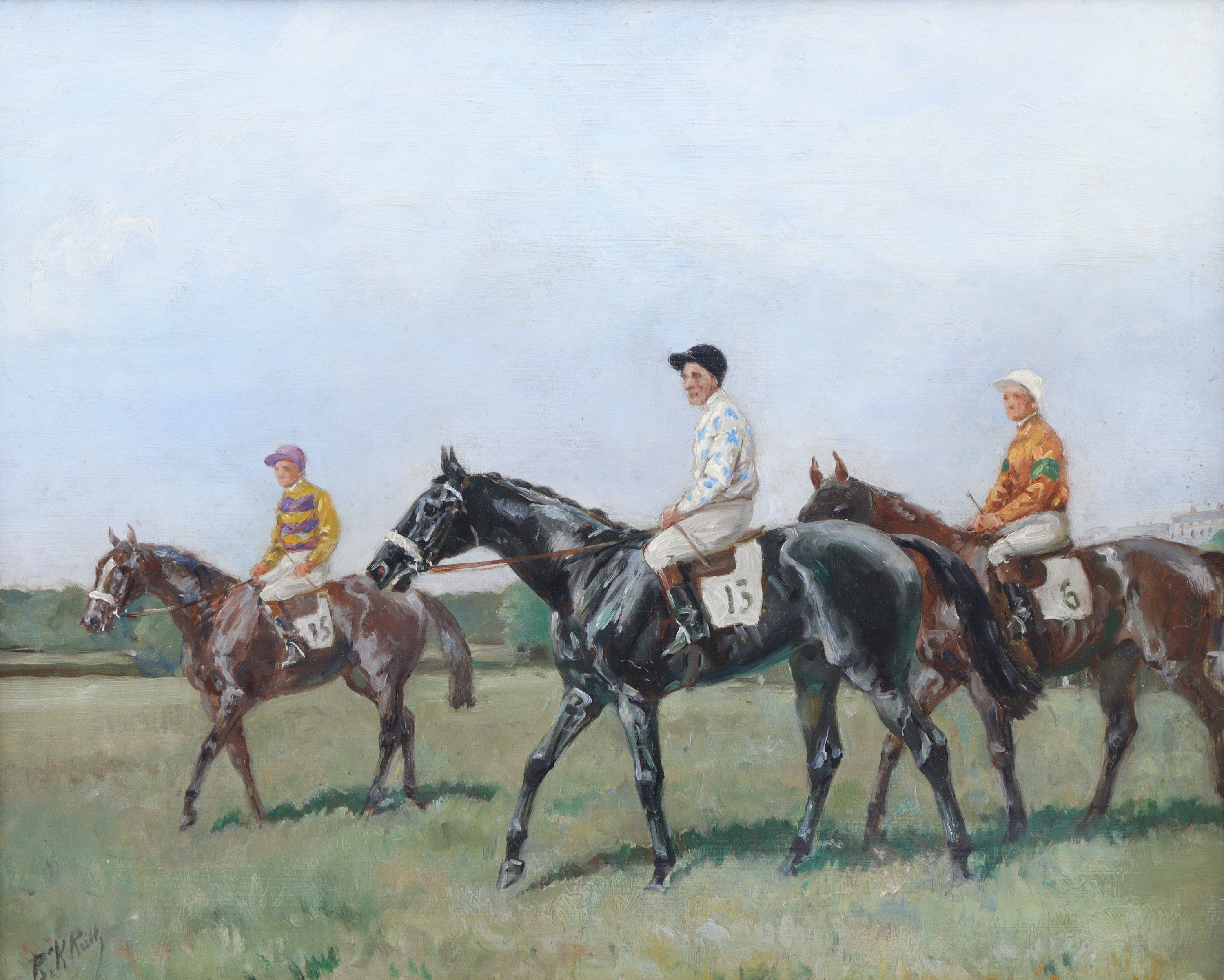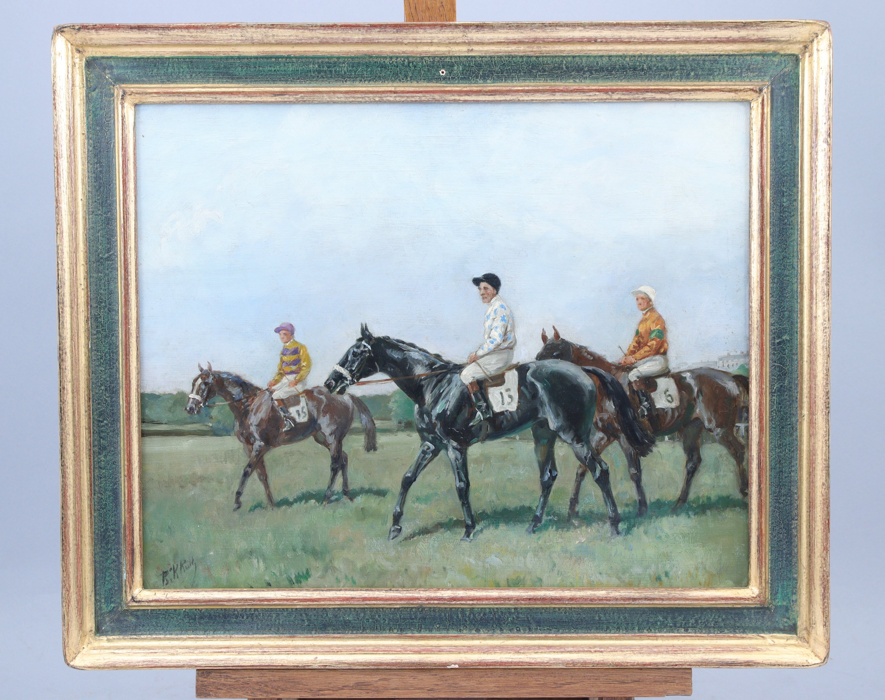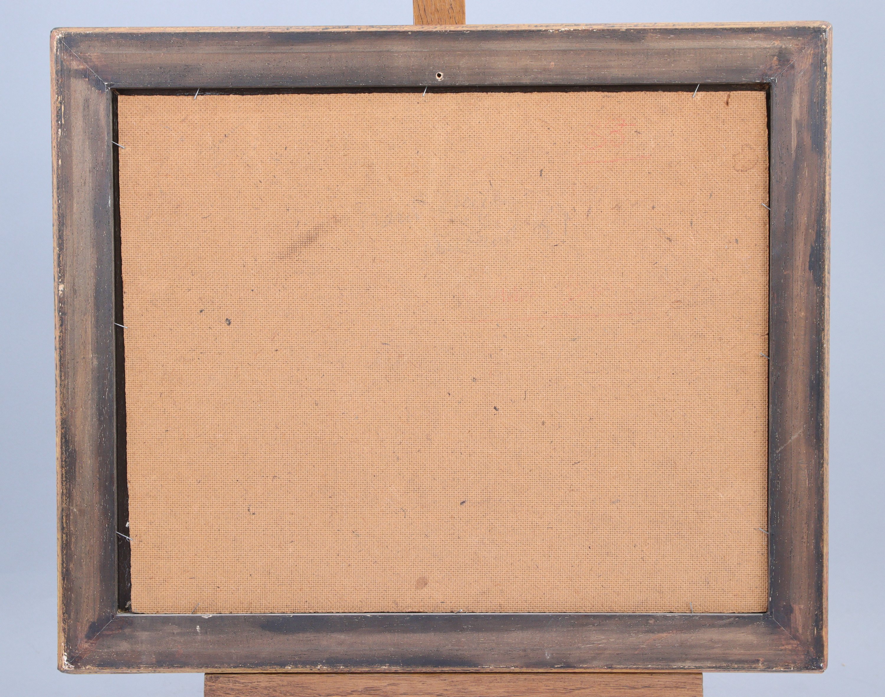 Dans un cadre en bois mouluré, laqué vert et doré.