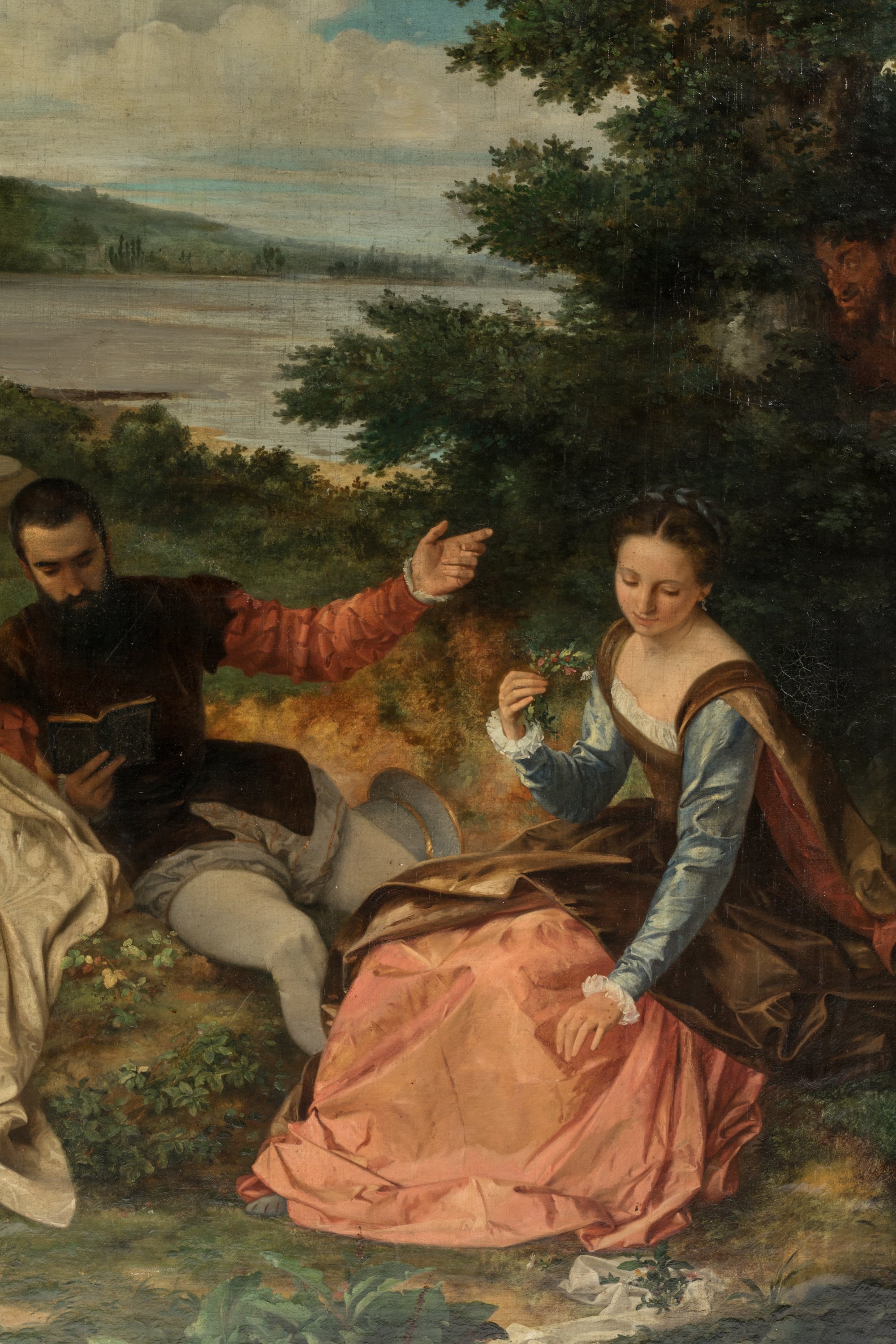 Le Salon de 1865 continue d'entretenir la rivalité entre Grand genre et les petits genres, comme le soulèvent certains commentateurs de l'époque, à l'exemple de Félix Jahyer ("Salon de 1865 : étude sur les beaux-arts", Paris, Dentu, p.6). Il déplore effectivement qu'une grande majorité des artistes vivants se complaisent dans le prolongement de peintres comme Greuze, savant orchestrateur des scènes de genre historique. "Il est bien plus facile de surpasser ce peintre agréable que de marcher, même à distance, sur les traces des grands maîtres" déclare-t-il. Tel n'est pas le cas de notre tableau qui, d'une certaine façon, n'est pas sans rappeler, par sa composition, celle des concerts champêtres des grands maîtres de la Renaissance comme Titien.