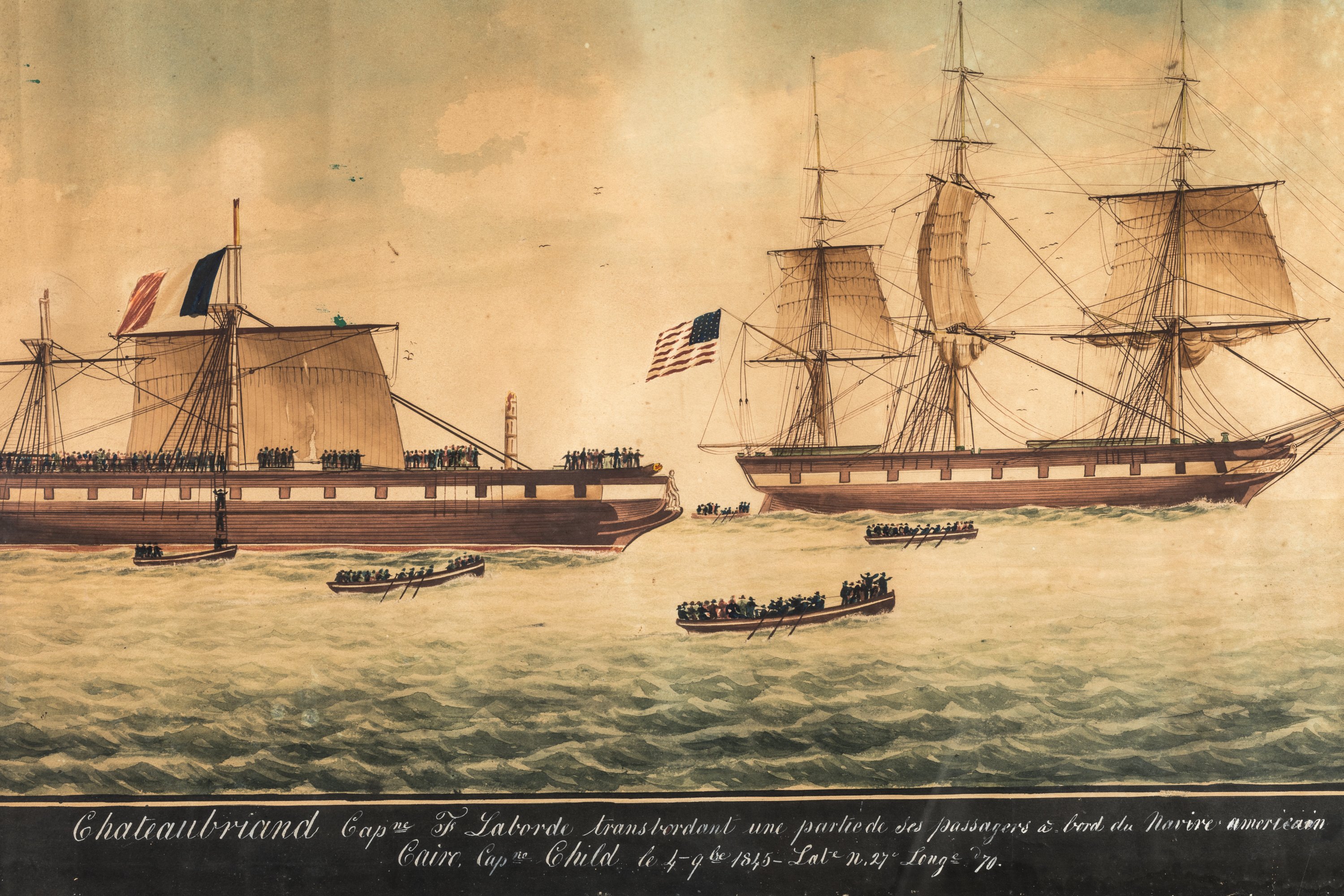 - "Chateaubriand Capne F Laborde transbordant une partie de ses passagers à bord du navire américain Cairo Capne Child le 4-9bre 1845 - Lat n. 27 Long. 70", signée"Evans".
