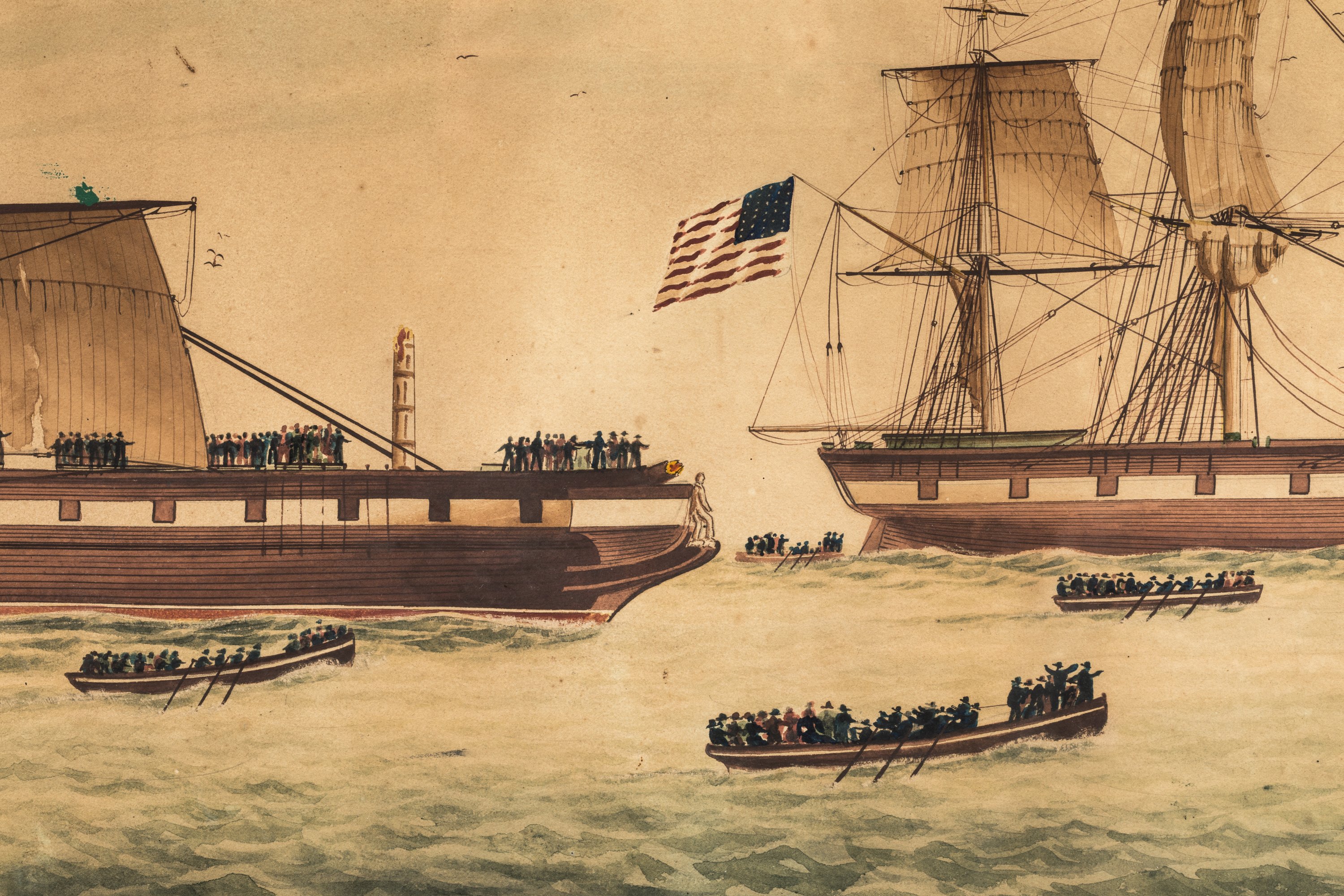 Two 1845-1846 watercolor paintings by James Guy Evans depicting the adventures of sailing ship Chateaubriand on the Mississippi River.