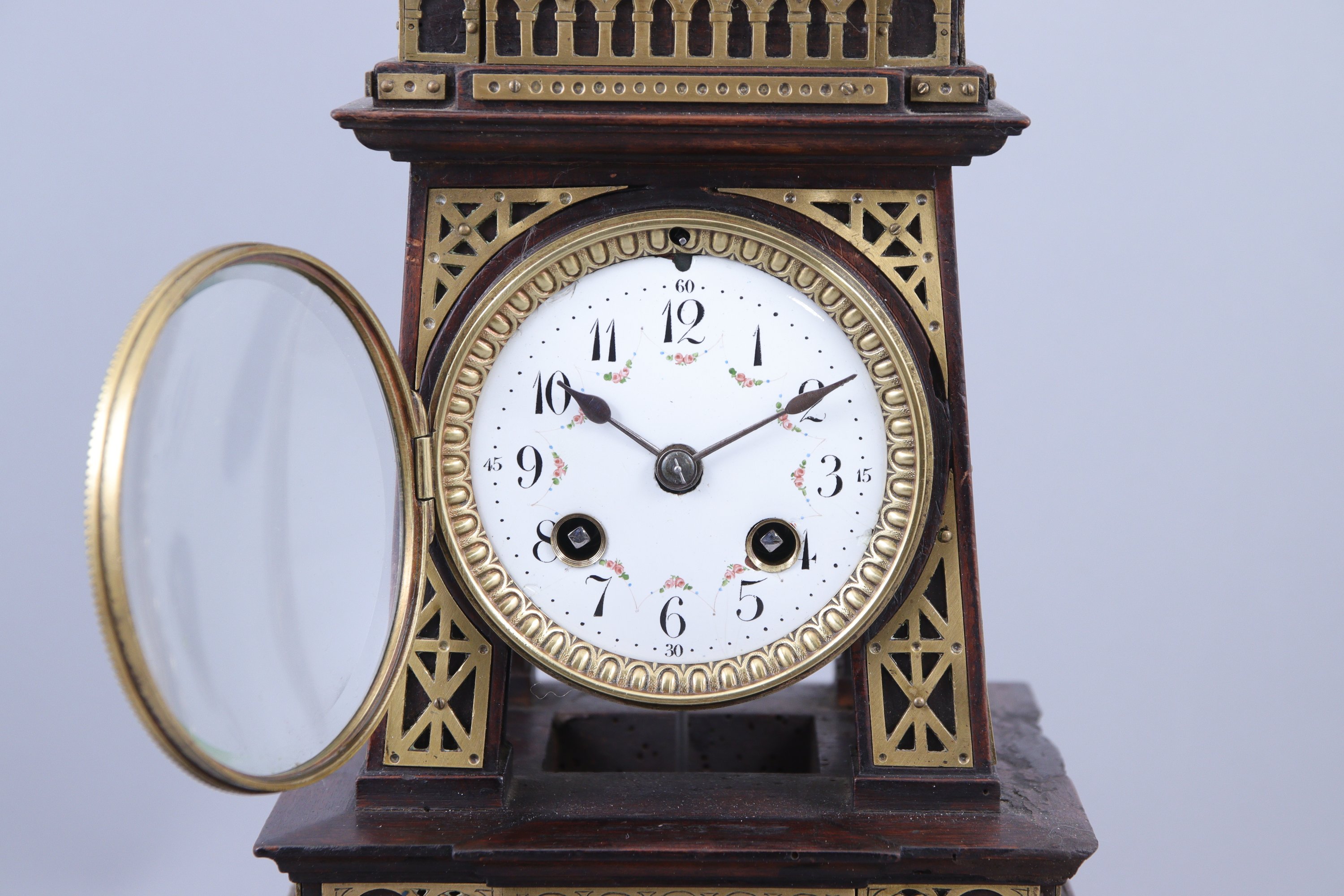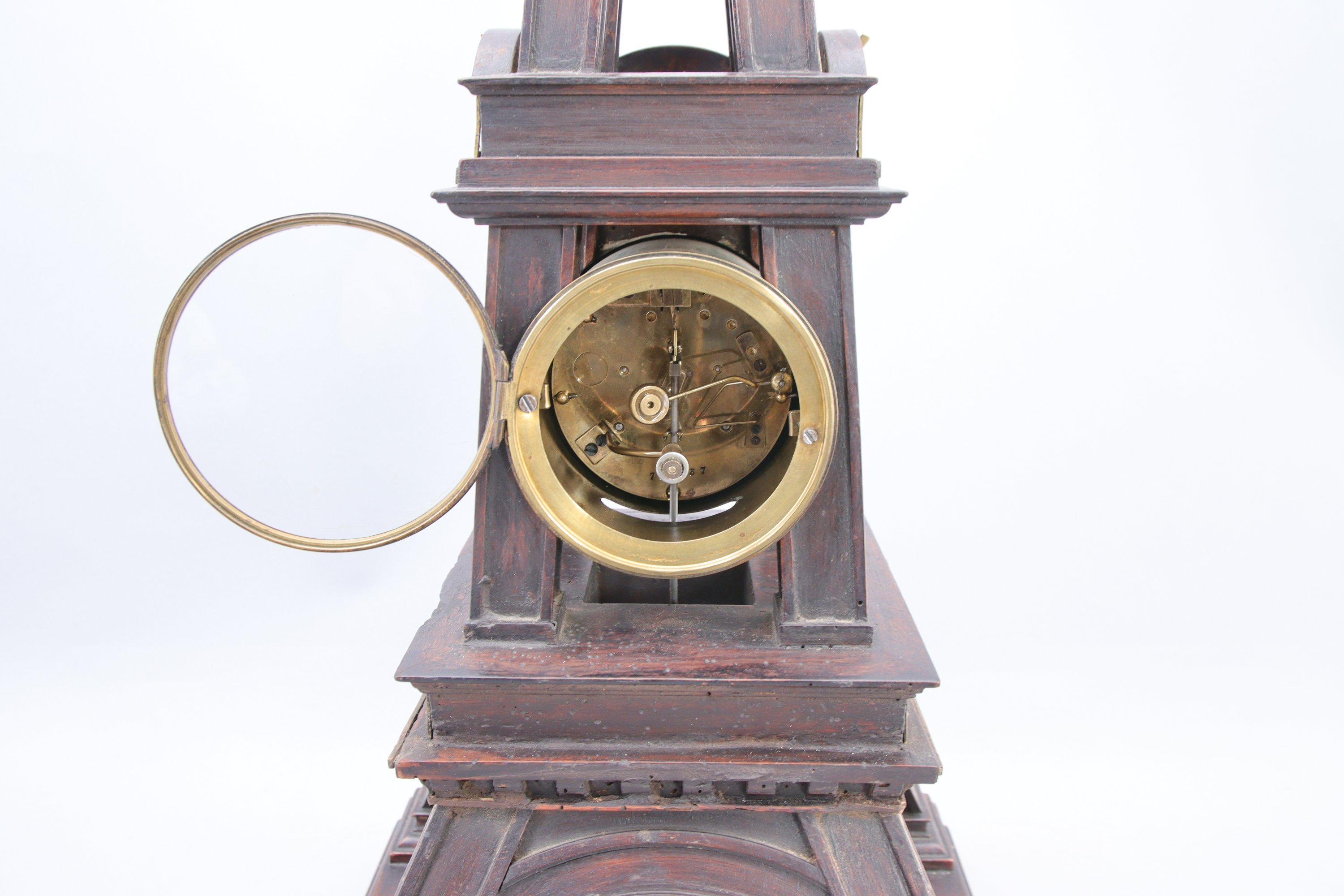 en bois teinté noir et laiton. Le cadran émaillé blanc indiquant les heures en chiffres arabes, les minutes par des pointillés. Elle repose sur un socle carré.
