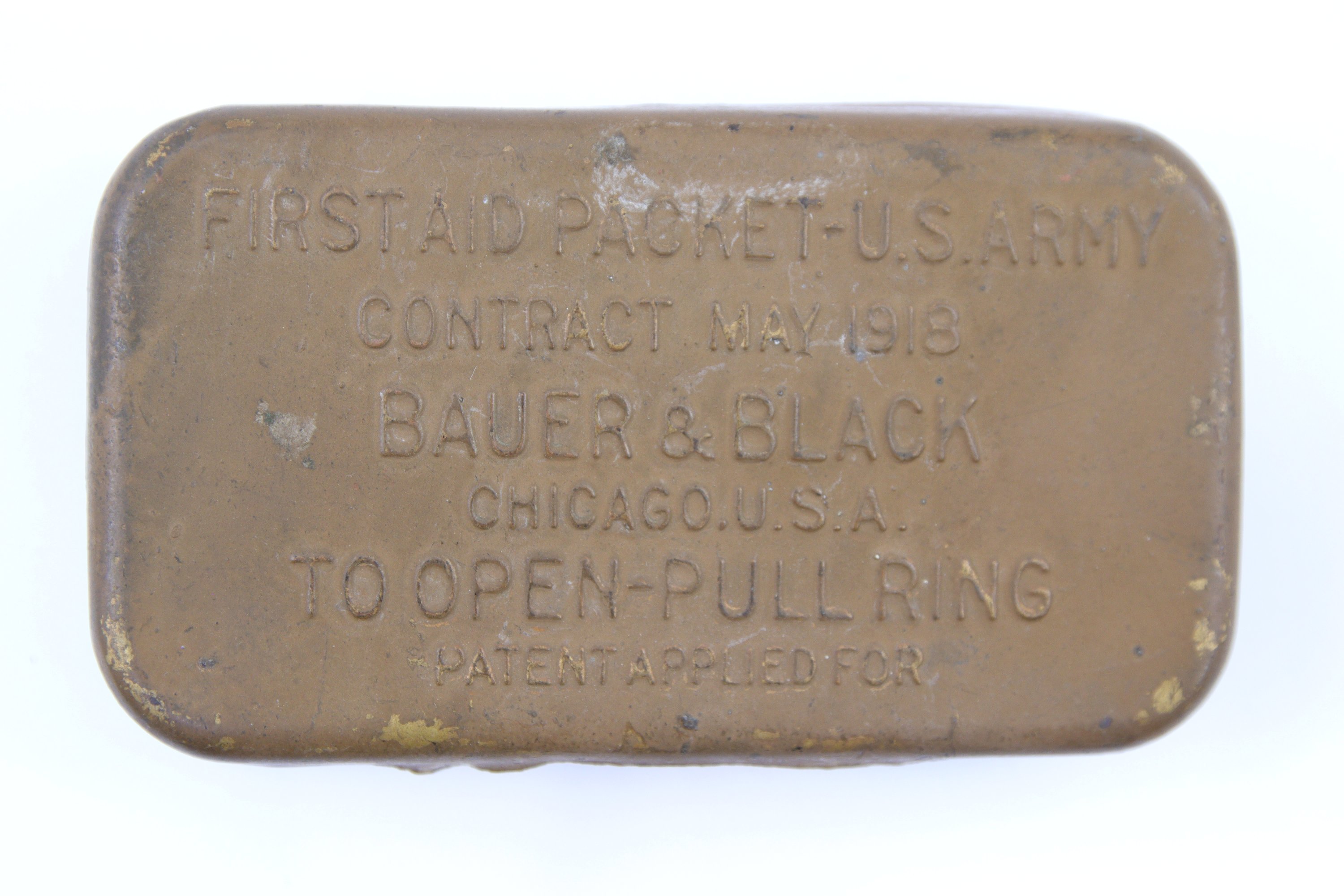 "First Aid Packet - U.S.Army / contract May 1918 / Bauer & Black / Chicago U.S.A / To open-pull Ring / Patent applied for".