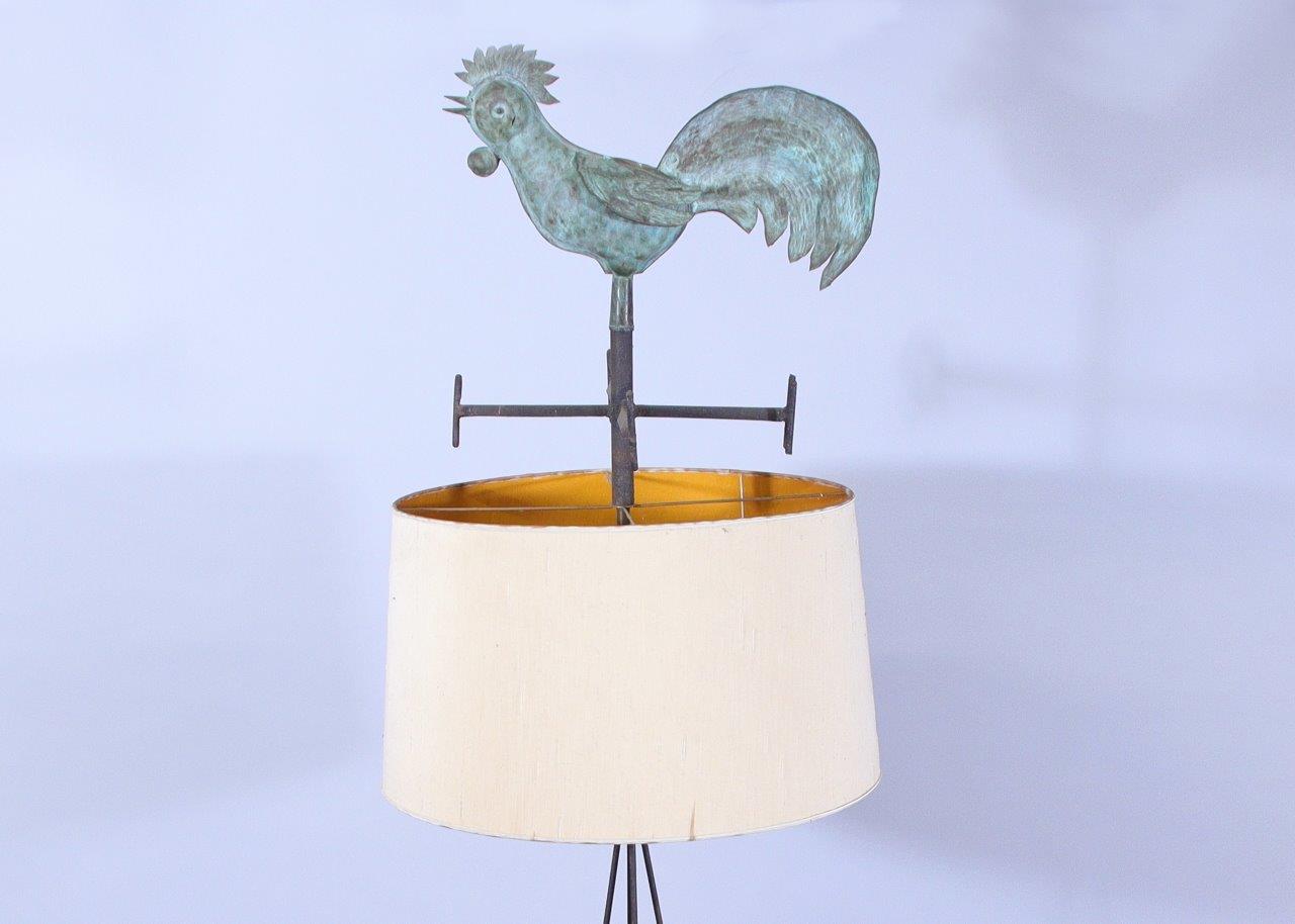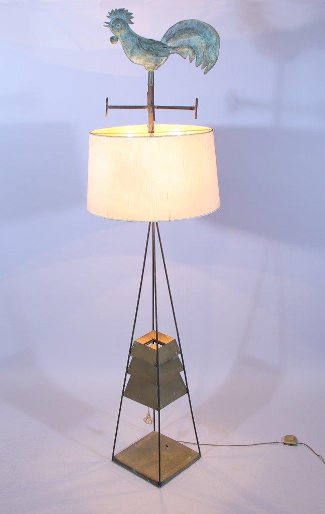 Elle repose sur un lampadaire en fer forgé et cuivre à trois lumières dont la partie inférieure se compose de réflecteurs sur une base de section quadrangulaire. Abat-jour en tissu crème.