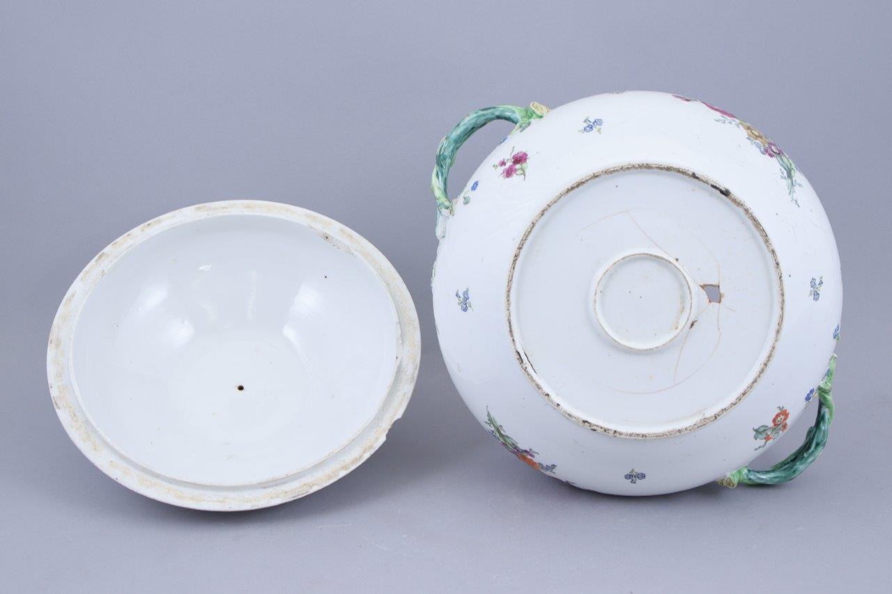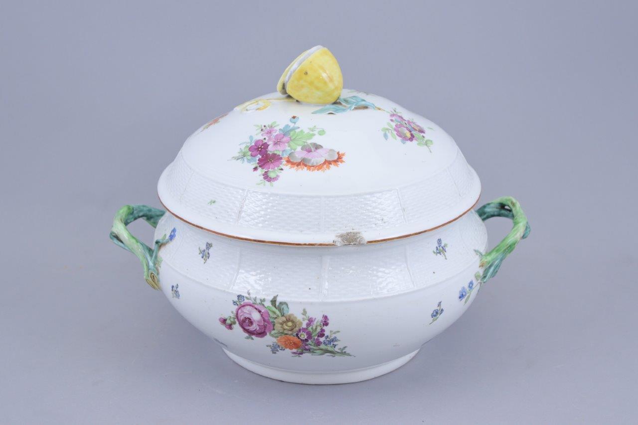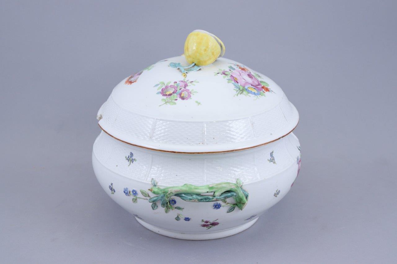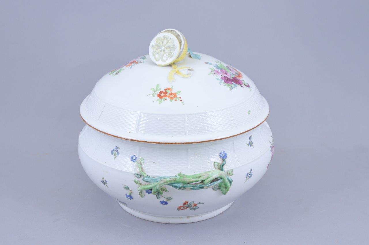 en porcelaine blanche à motifs de vannerie en léger relief, décor polychrome de bouquets de fleurs, la prise du couvercle en forme de citron en partie tranché, les anses en branchages verts stylisés.
