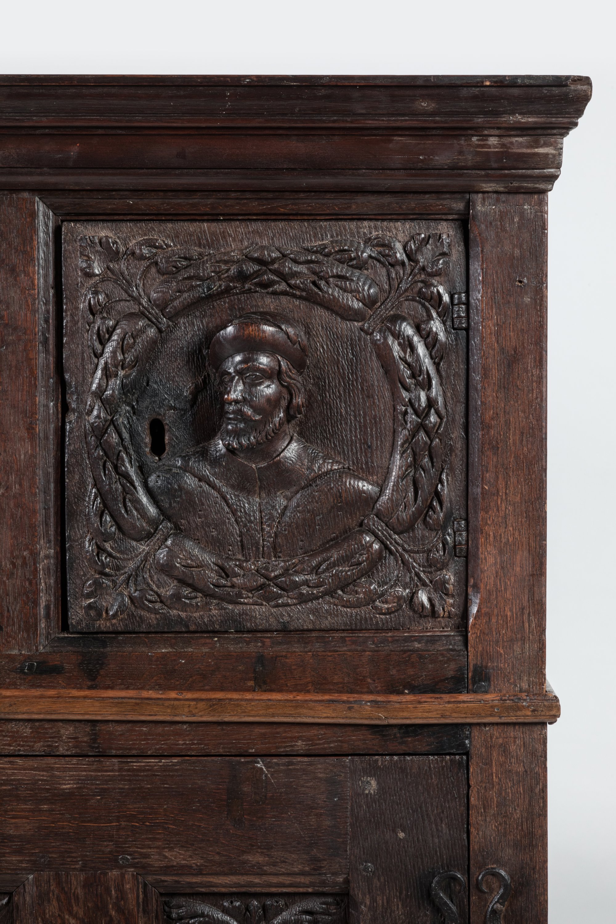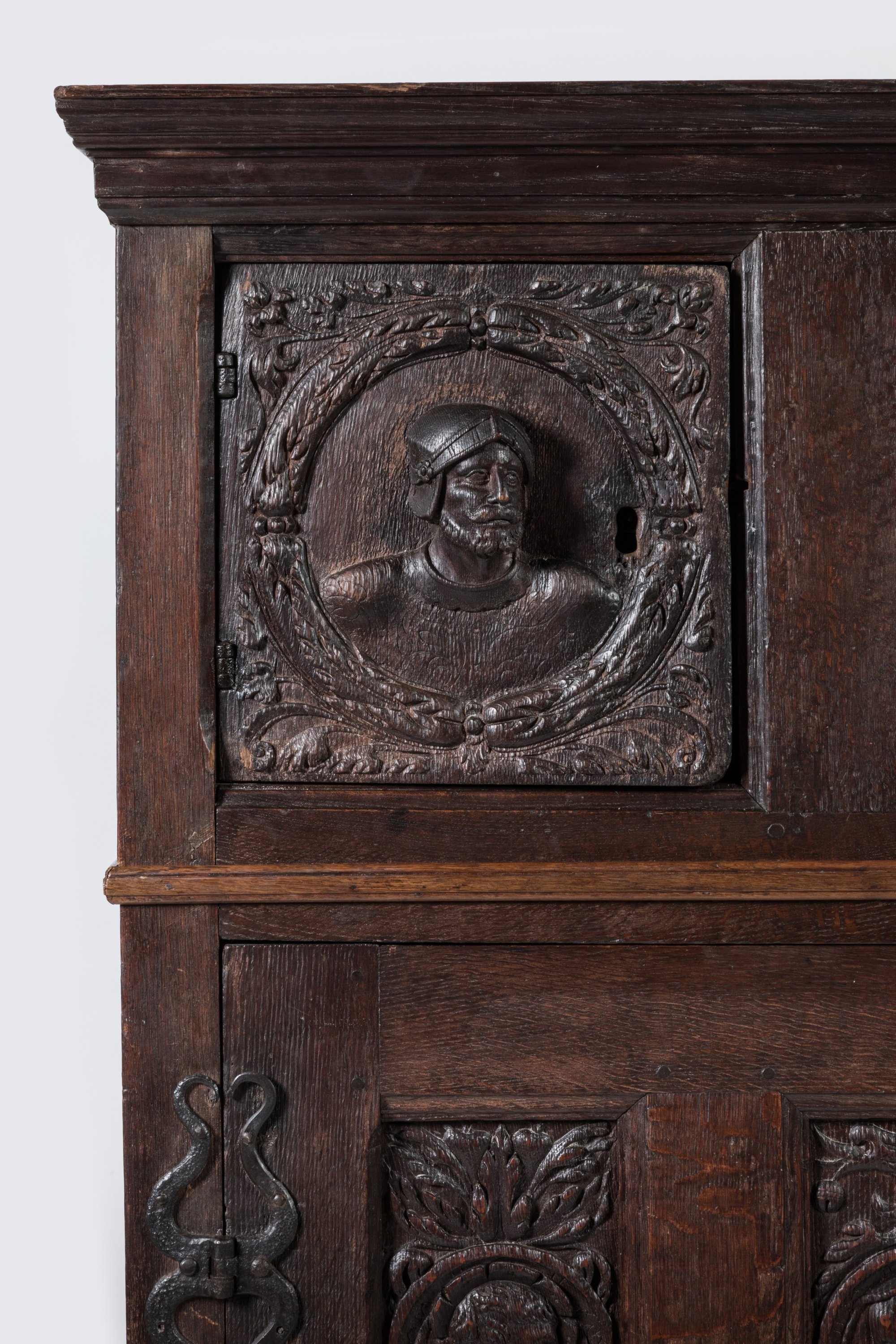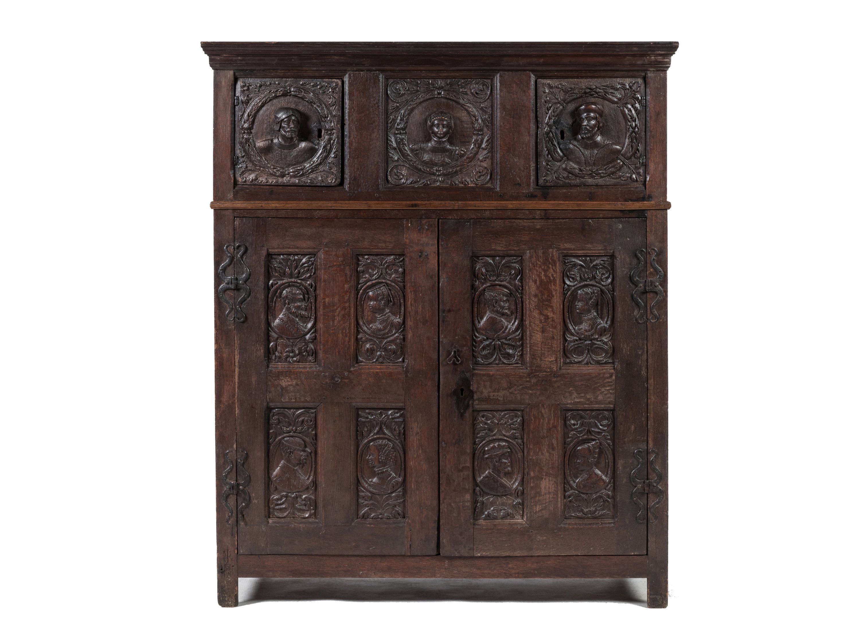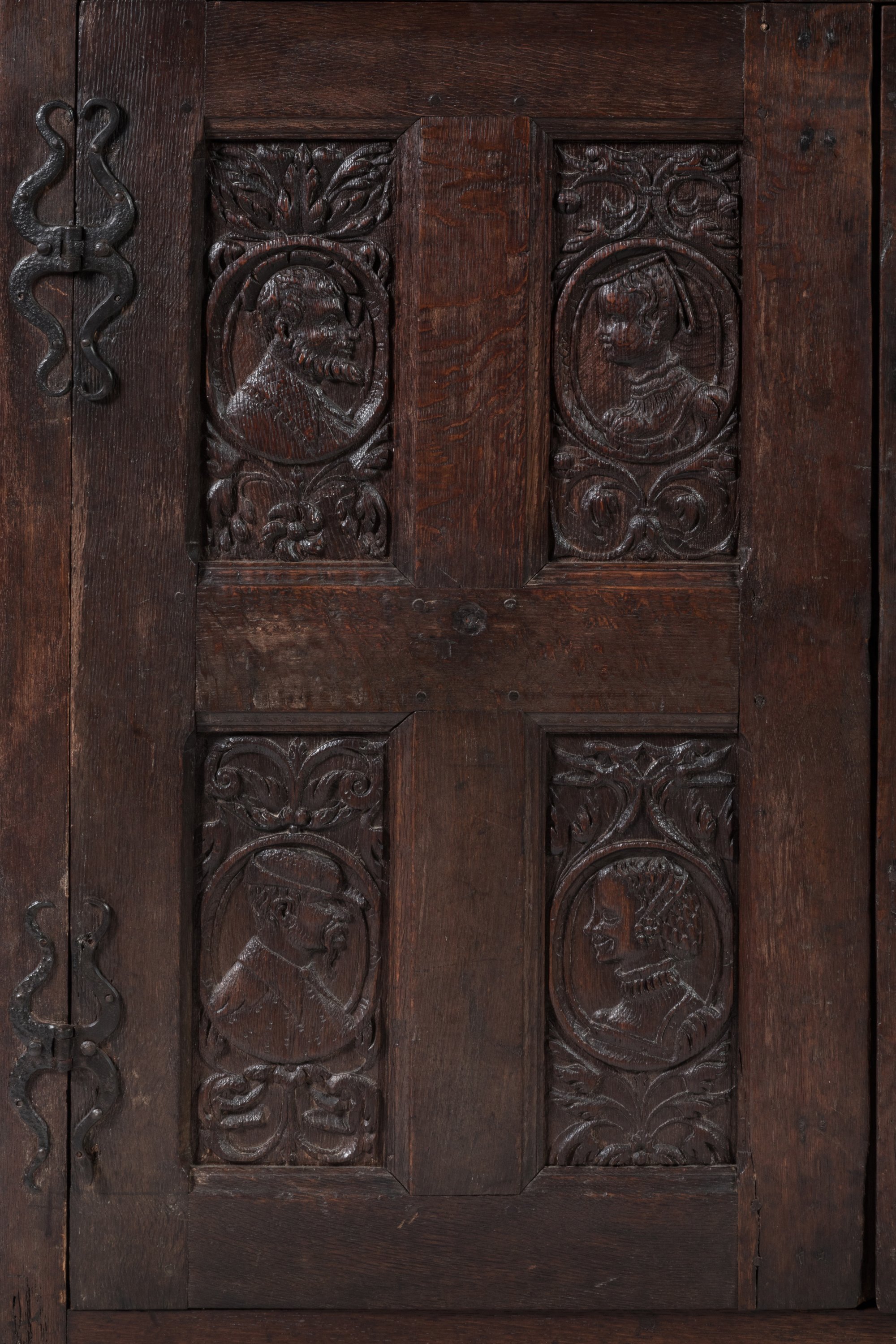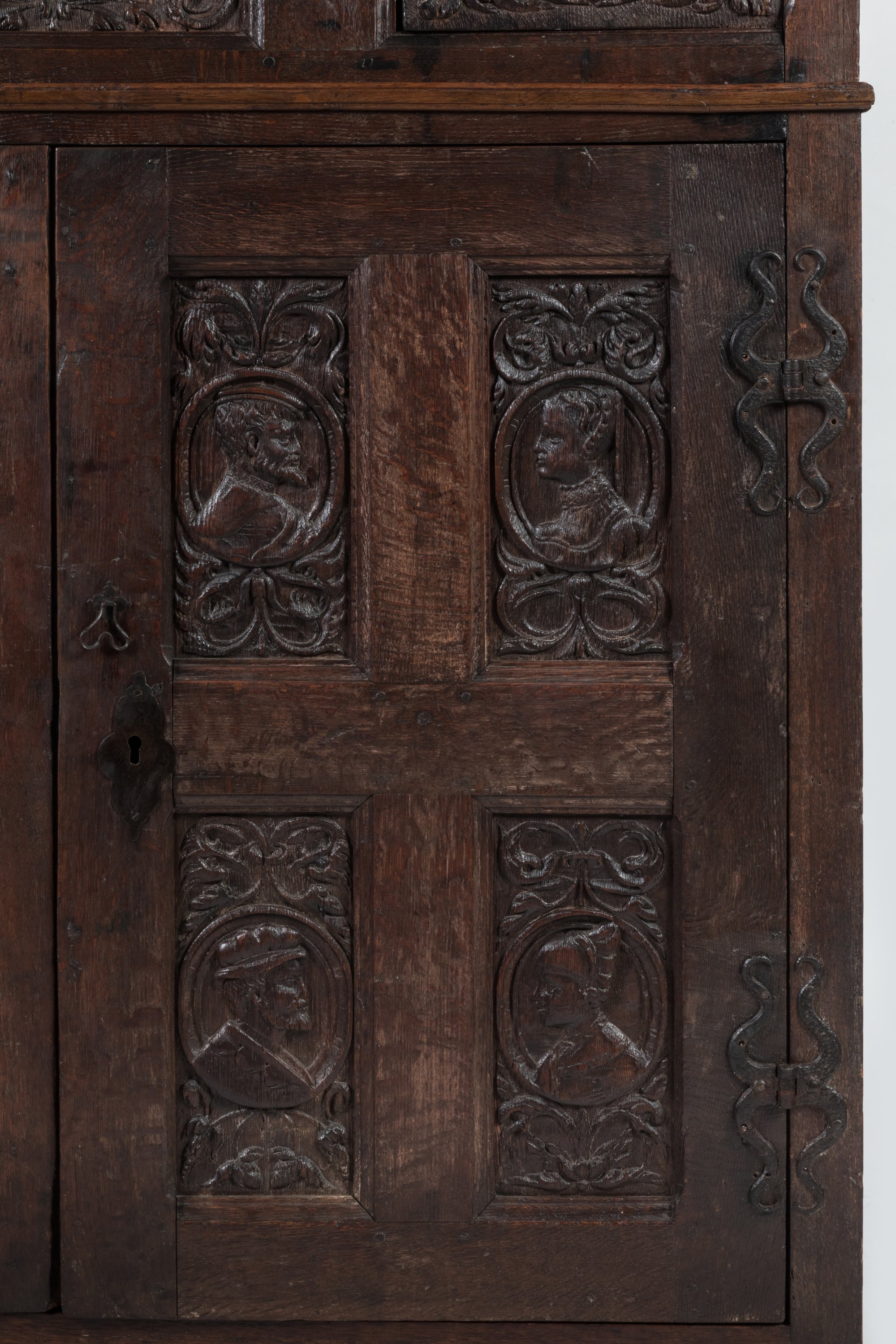 en chêne sculpté ouvrant à quatre vantaux, deux au corps supérieur encadrant une partie fixe, deux grands vantaux à quatre panneaux au corps inférieur. Décor de personnages en buste dans des médaillons représentés de face en partie haute et de profil en partie basse, entourage de rinceaux symétriques.