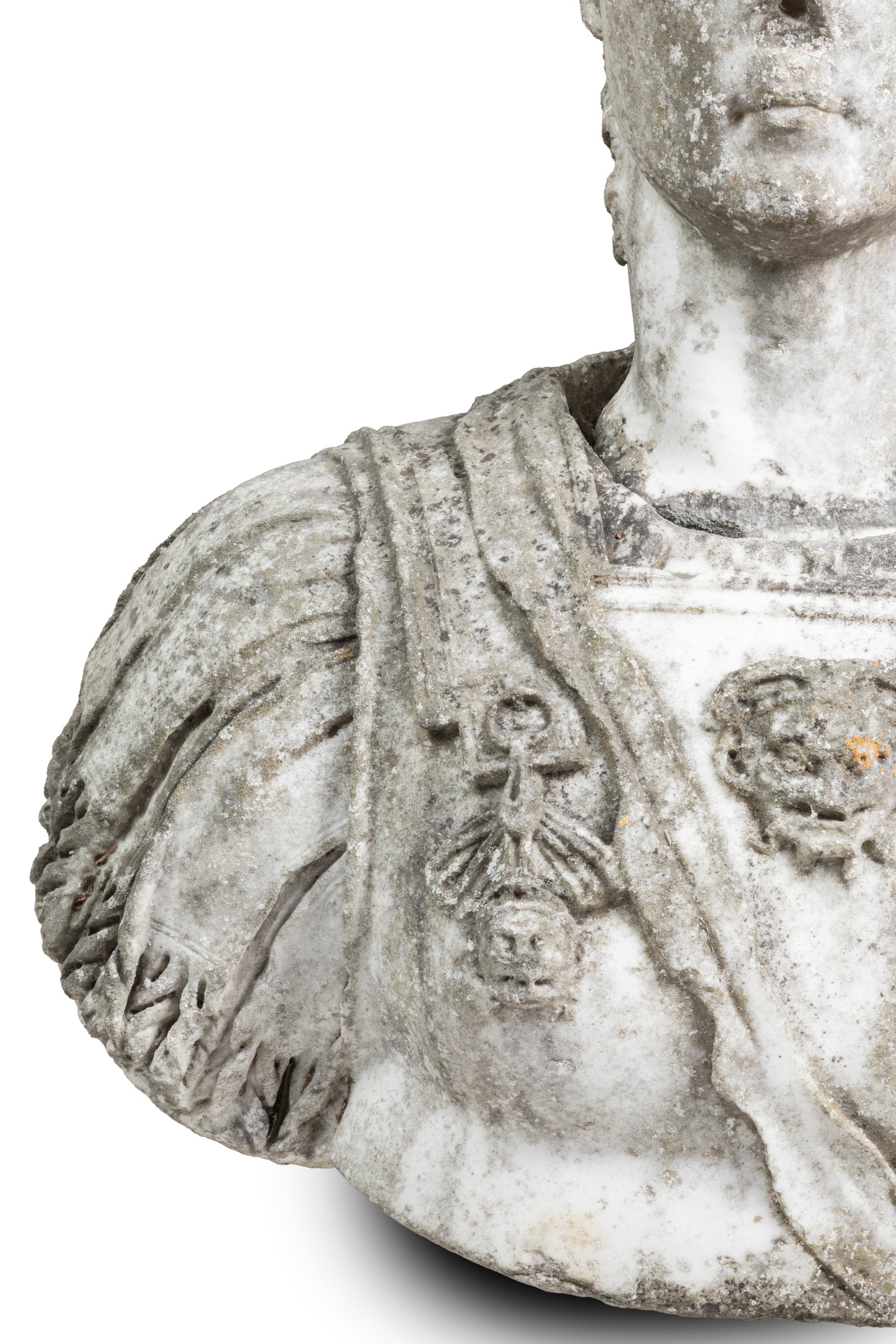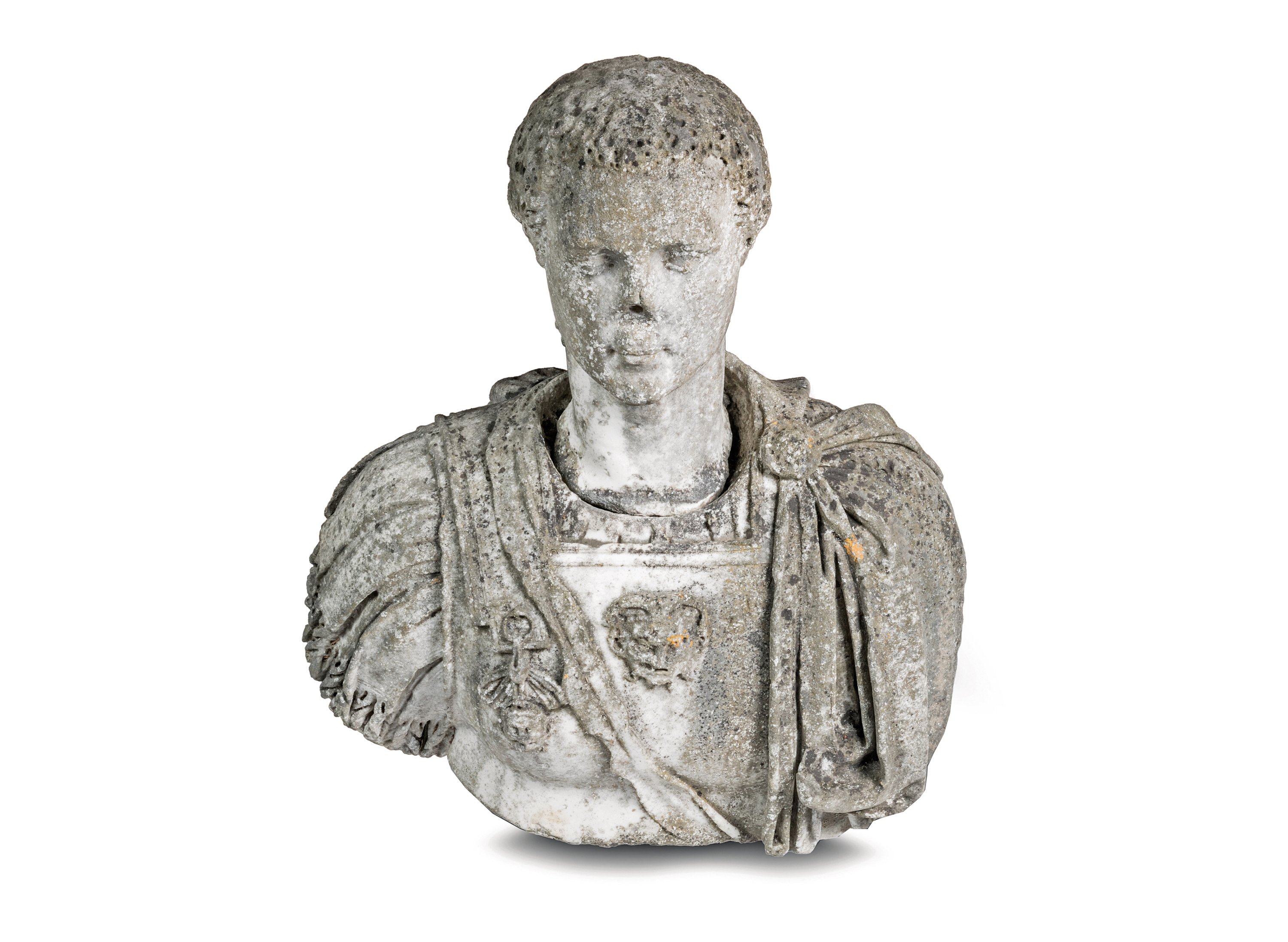 Tête imberbe à la chevelure courte et bouclée, cuirasse à l’antique au pectoral orné d’un masque de Gorgone, manteau fixé sur l’épaule gauche par une fibule.