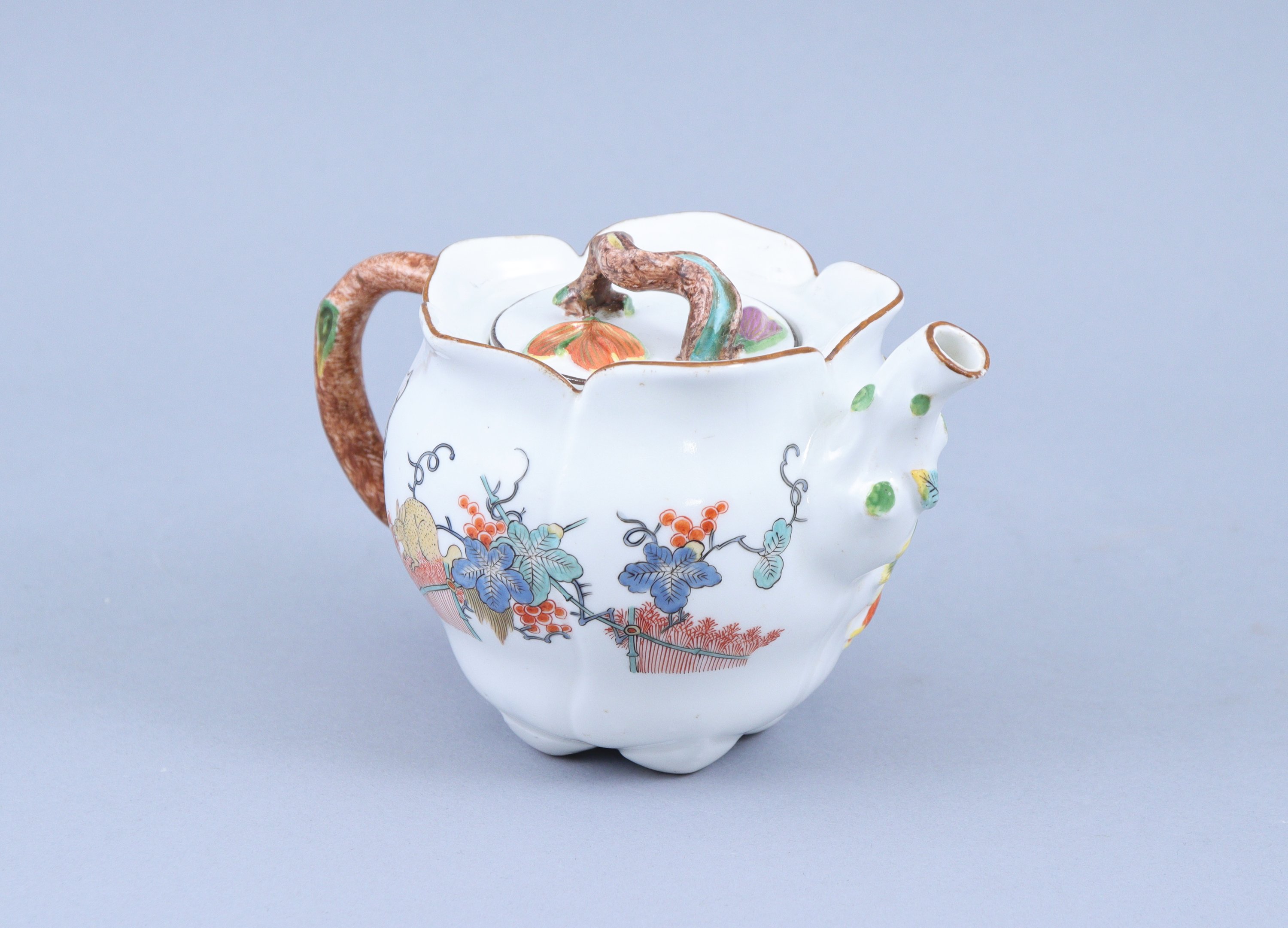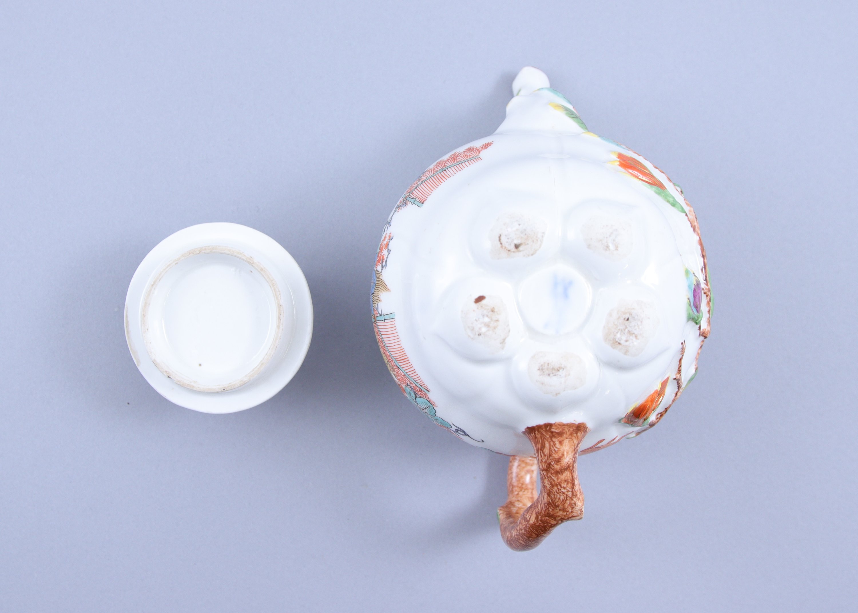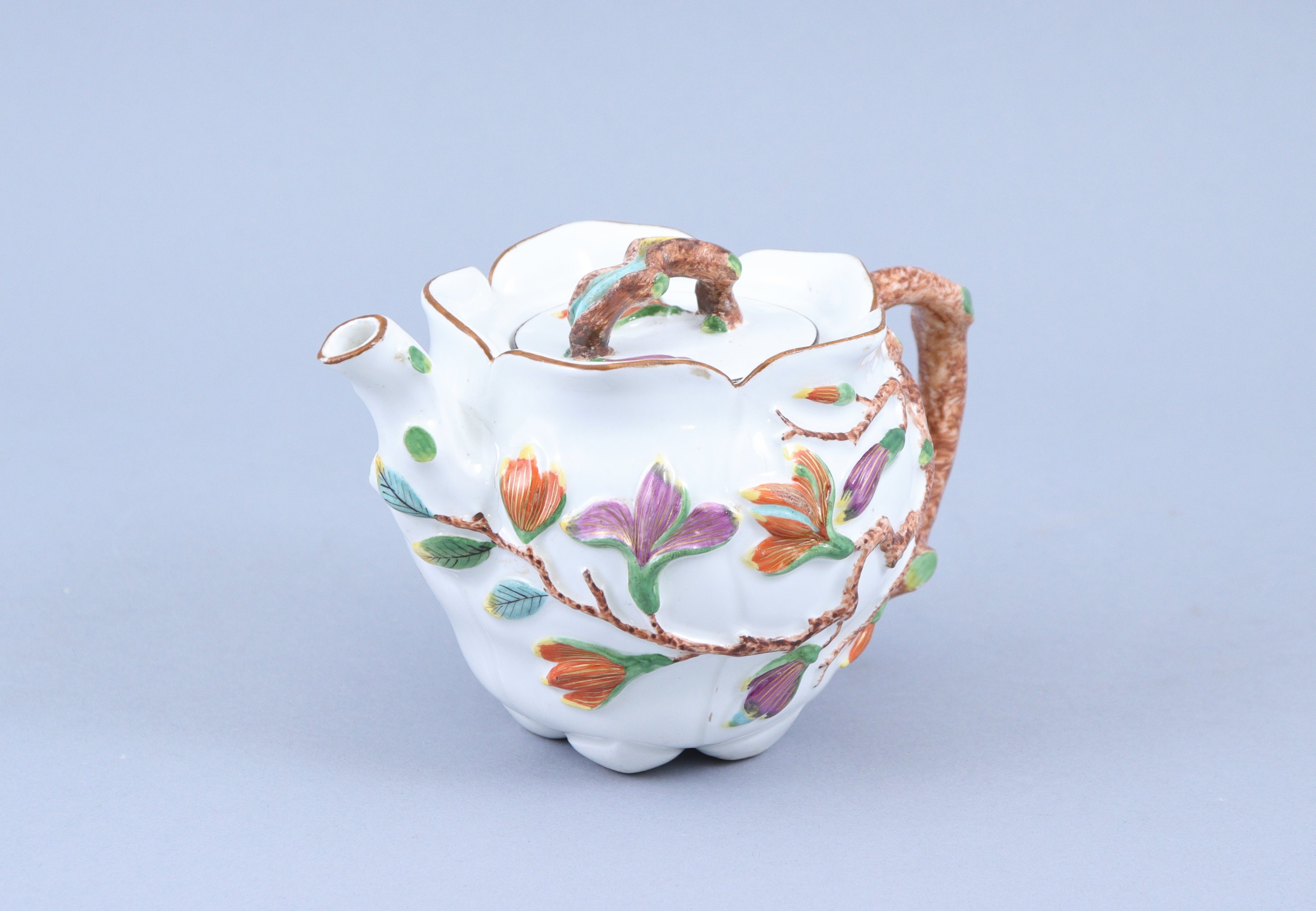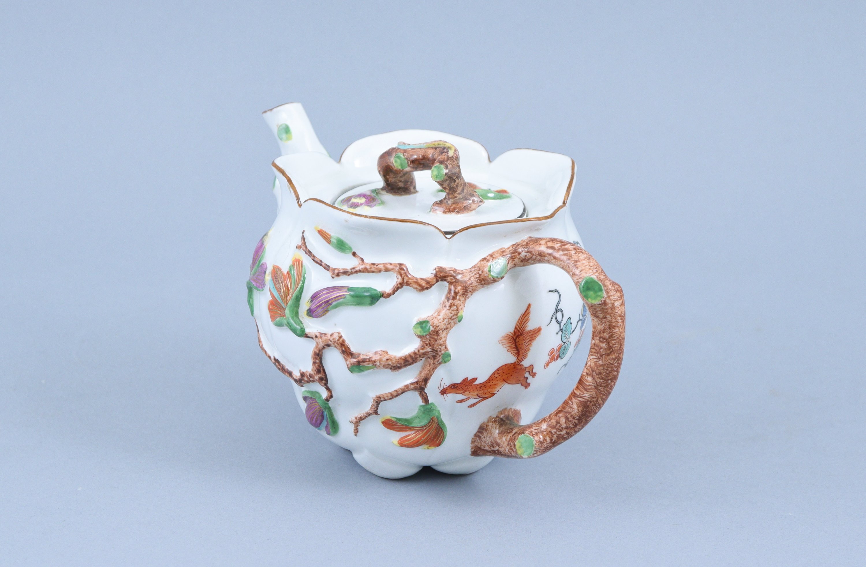 en porcelaine, en forme de fleur à cinq pétales, à décor appliqué en relief et polychrome sur une face d’une branche fleurie moulée partant de l'anse en forme de branche brune et se terminant sur le bec ; l’autre face à décor polychrome de haies fleuries et écureuil, la prise du couvercle en forme de branche fleurie, filet brun sur les bords.