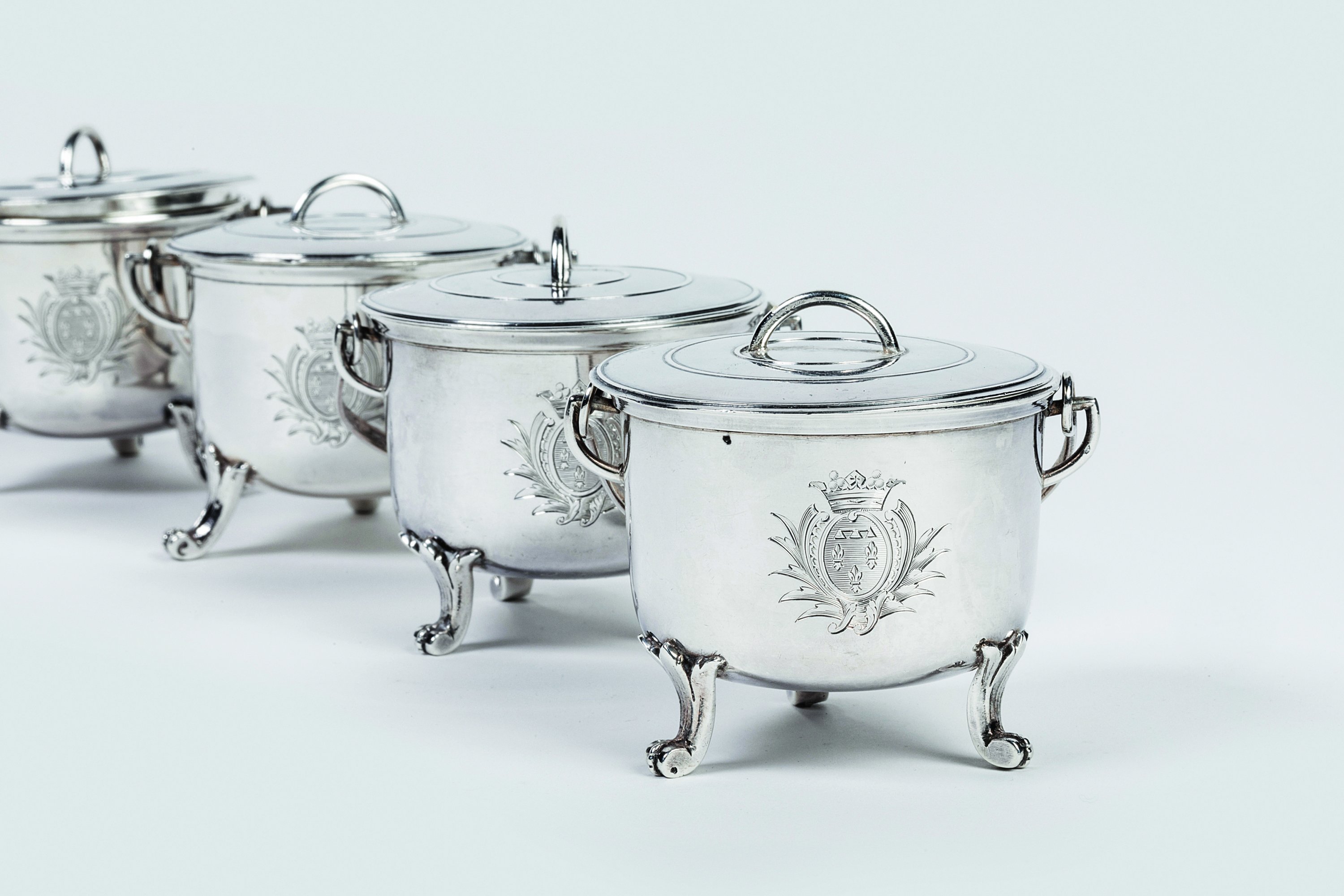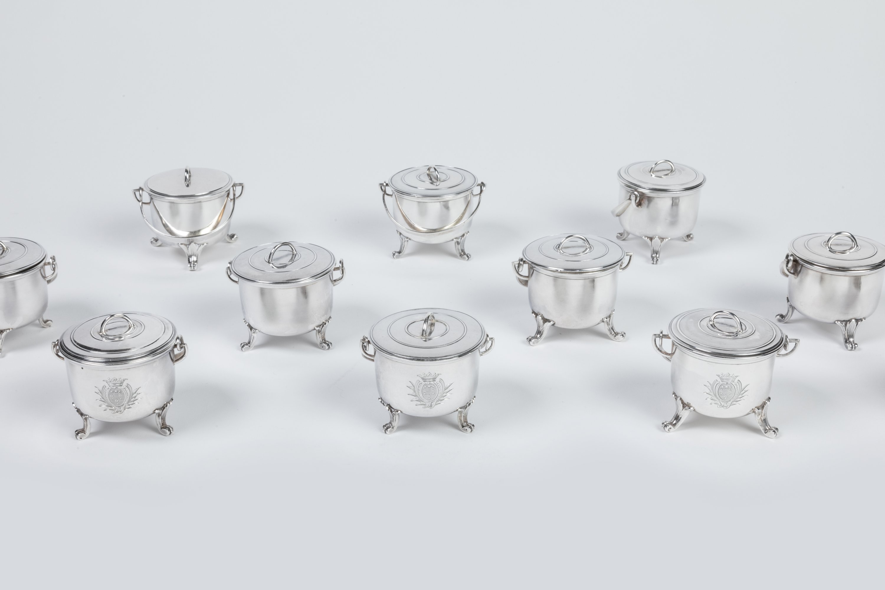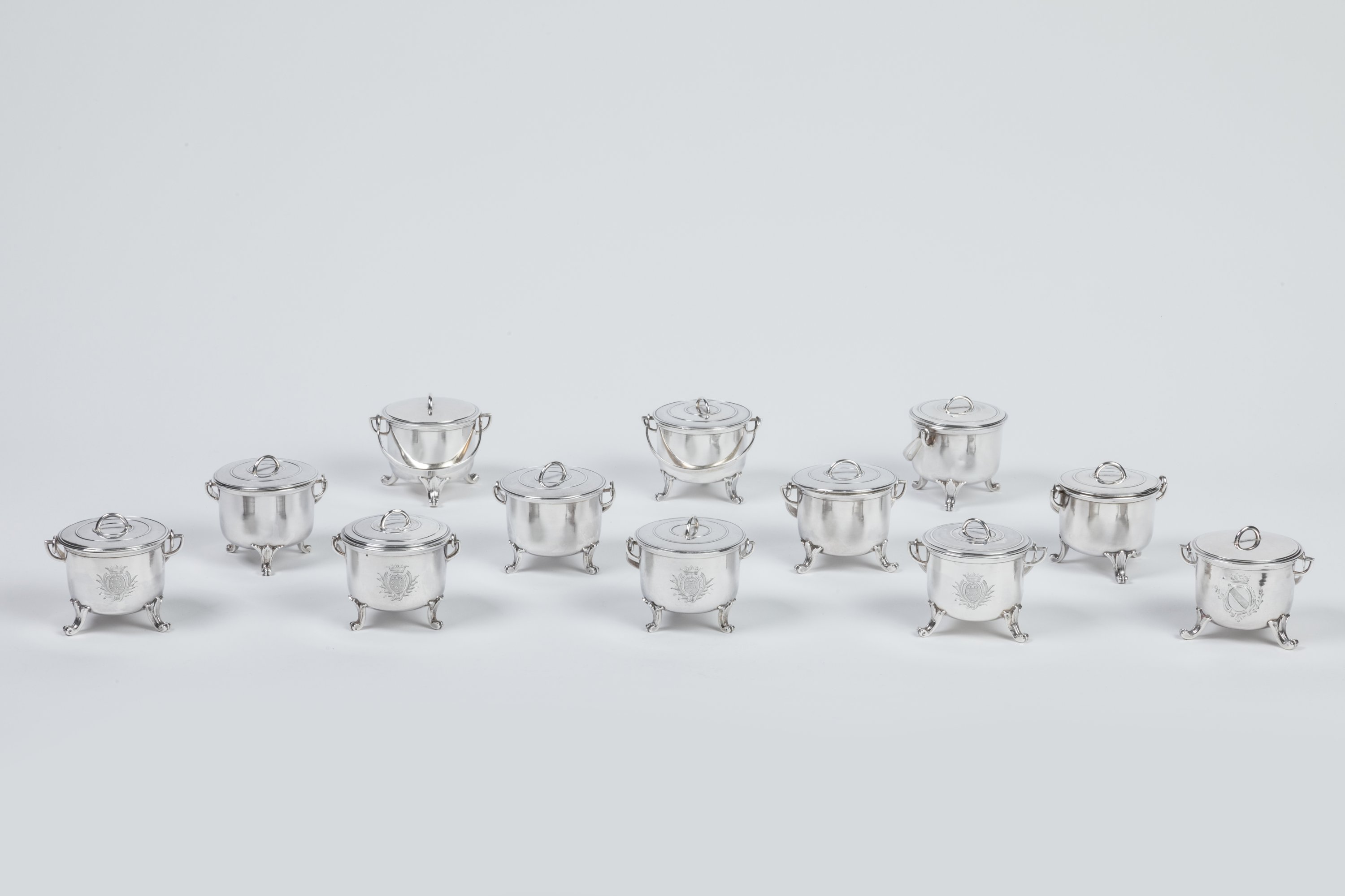 18th C. style. A set of twelve silver pots, four of which bear the coat of arms of Louis Philippe II, Duke of Orléans.