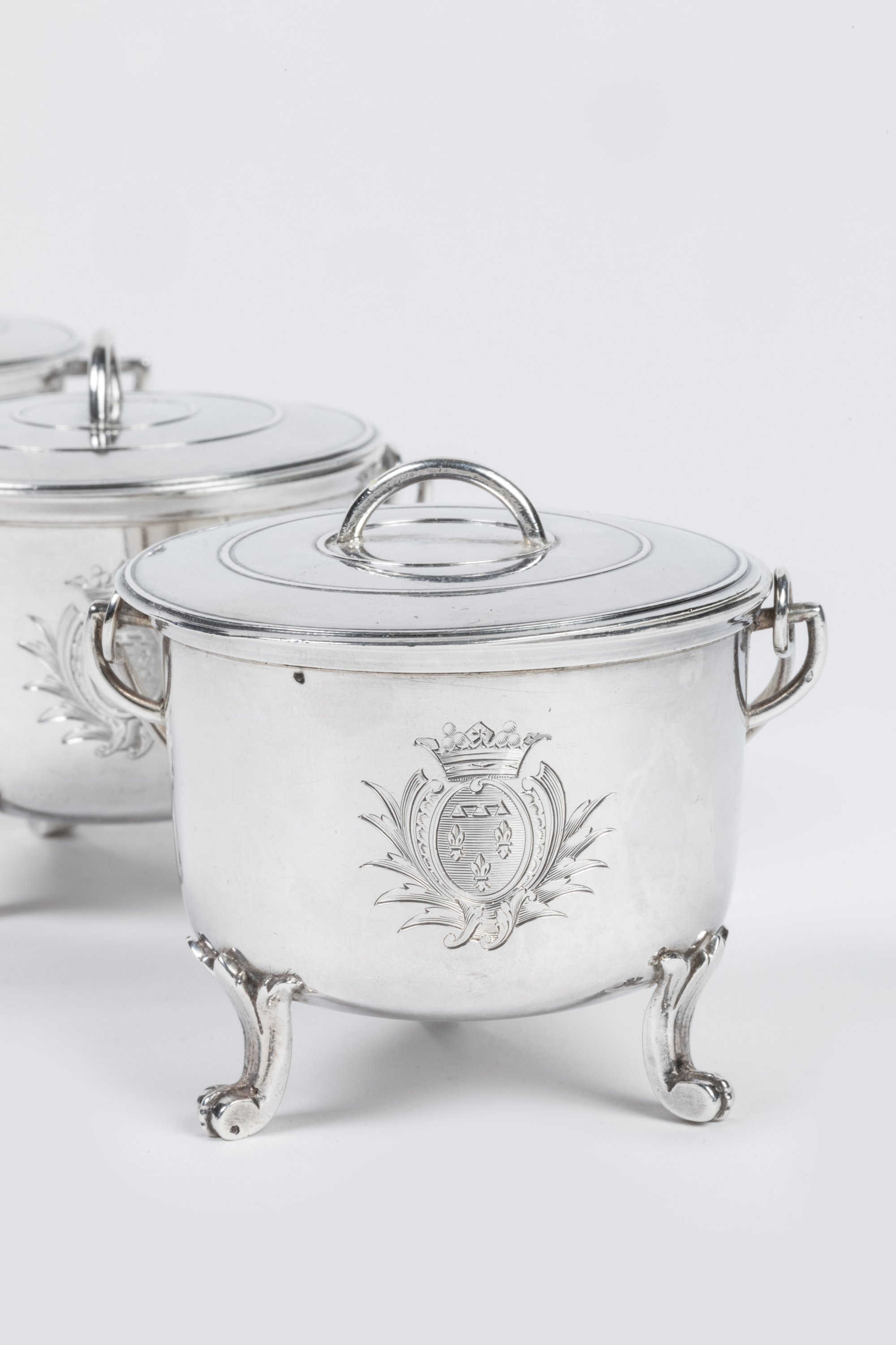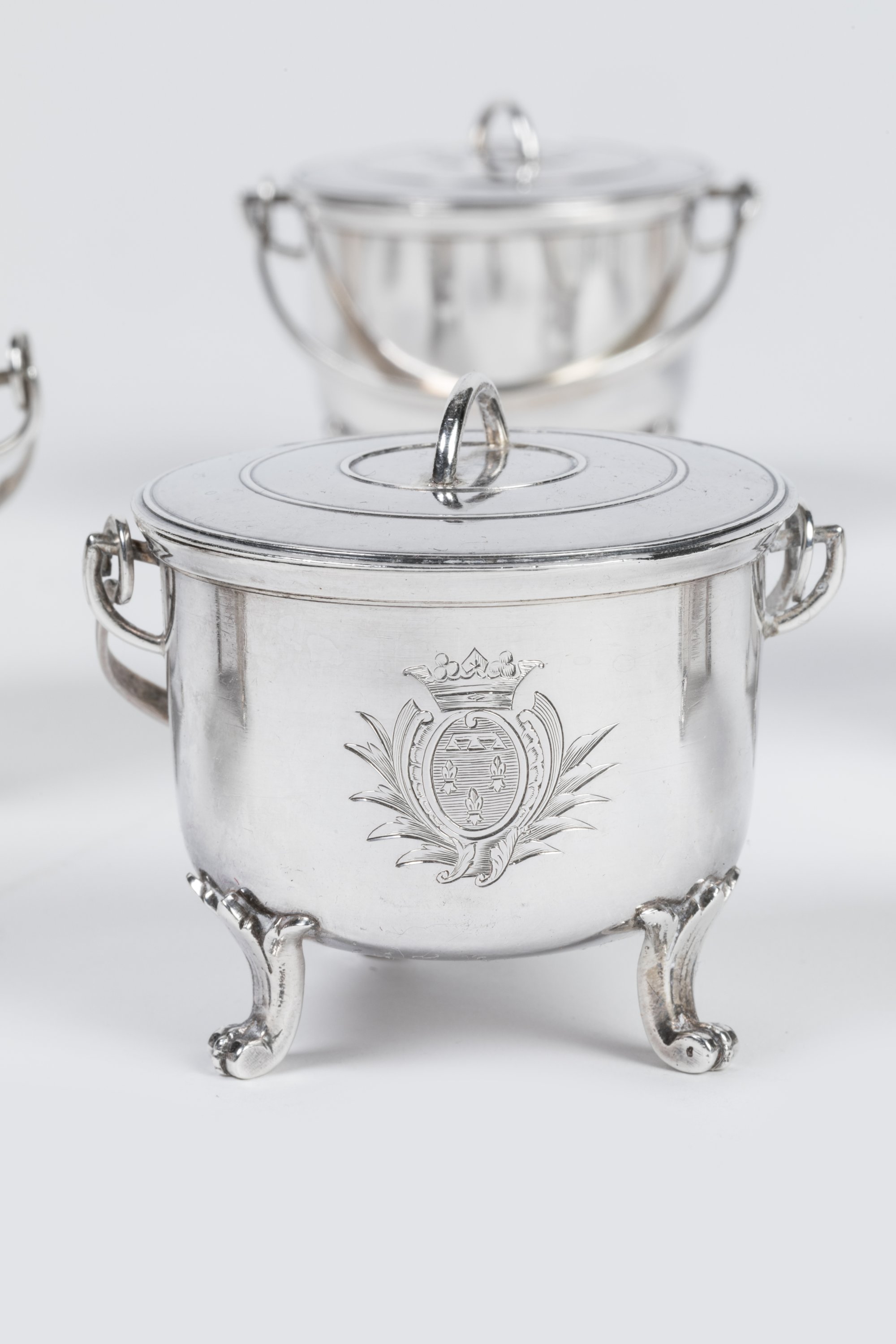 en argent, munis d'une anse mobile et d’un couvercle circulaire à double filets avec poignée. Ils reposent sur trois pieds ciselés de feuilles d'acanthe en enroulement. Quatre sont gravées aux armes du duc d’Orléans, une autre porte un blason tranché surmonté d’un tortil de baron, les autres sont vierges.