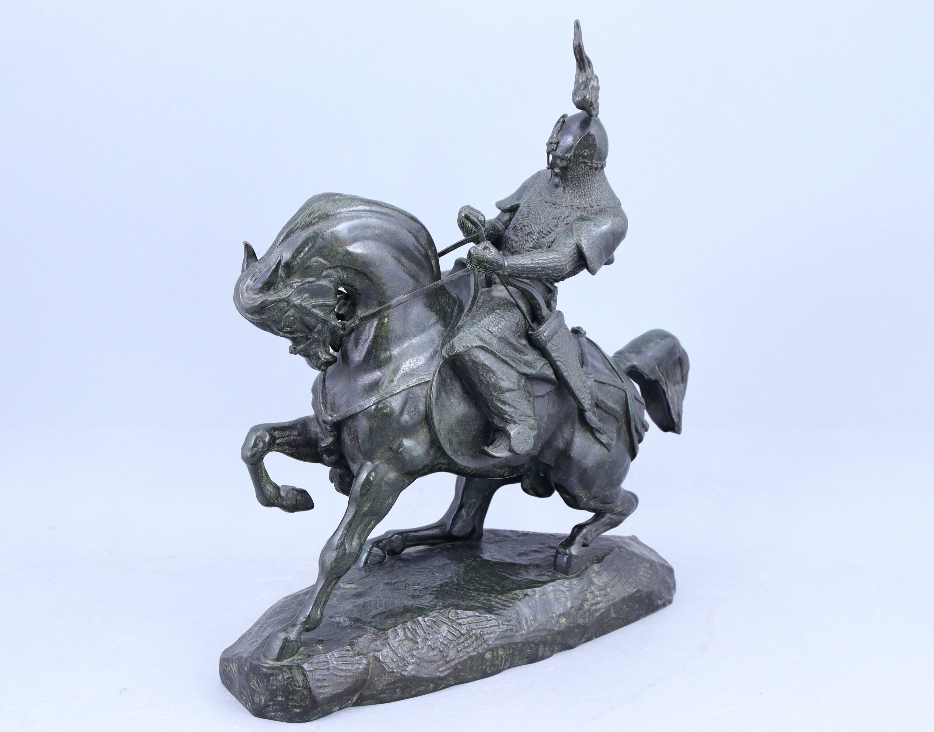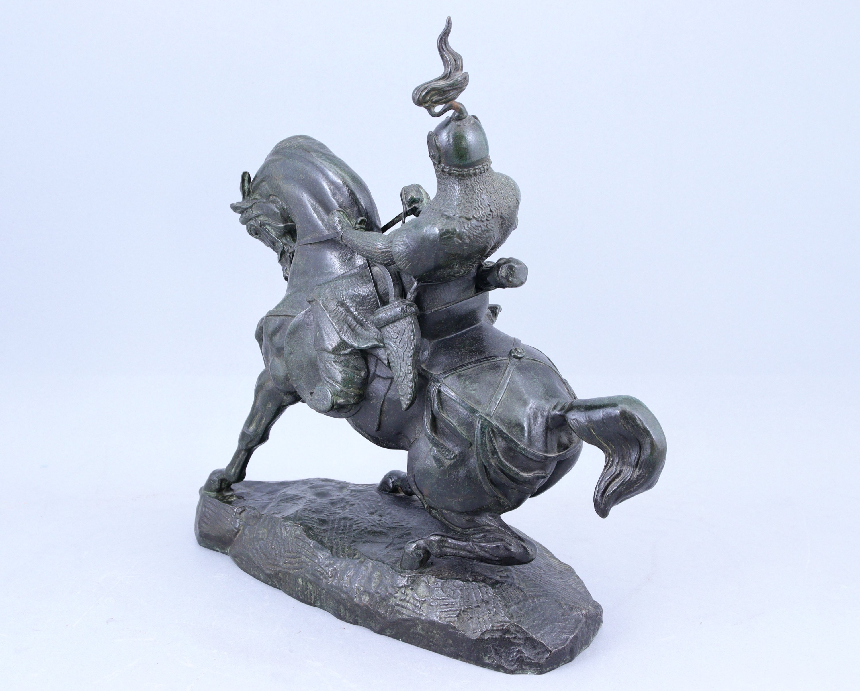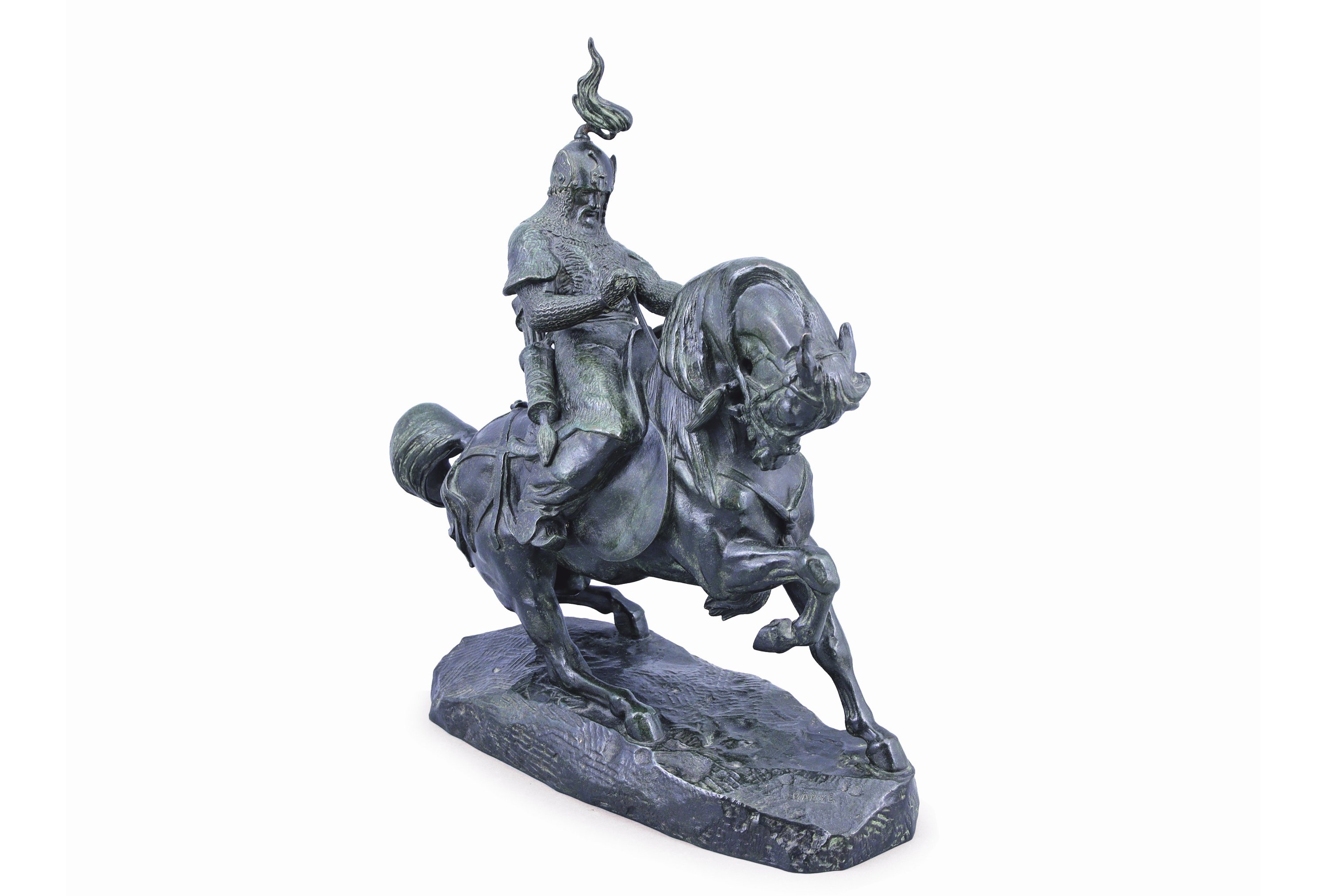 Barye crée le modèle en 1845 et le nomme tout d'abord "cavalier chinois". Il en modifie plusieurs fois les états, en reprenant l'allure du cheval, travaillant son harnachement et gonflant le soufflet du casque pour en renforcer la fougue. Il offre avec ce travail une image mouvementée et synthétique d'un cheval demi-sang tête baissée, dont l'énergie est maîtrisée par son cavalier. Les fontes anciennes, tirées par l'atelier de Barye entre 1858 et 1875, présentent un bronze riche en cuivre, dont la densité offre une ciselure nerveuse rehaussée par une patine stable dans le temps, dont les teintes varient pour chaque exemplaire.