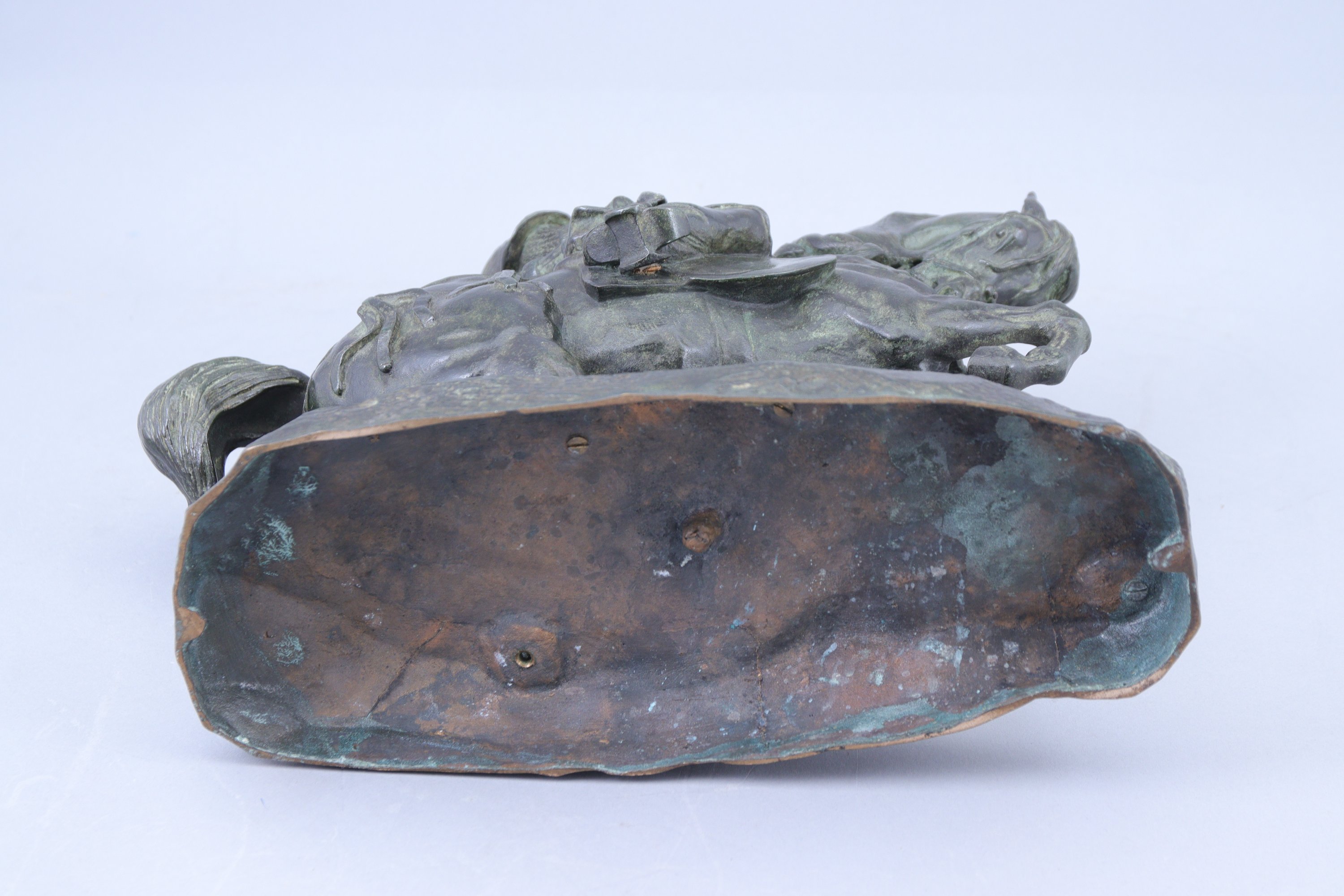 Bronze à patine verte antique aux reflets métalliques.