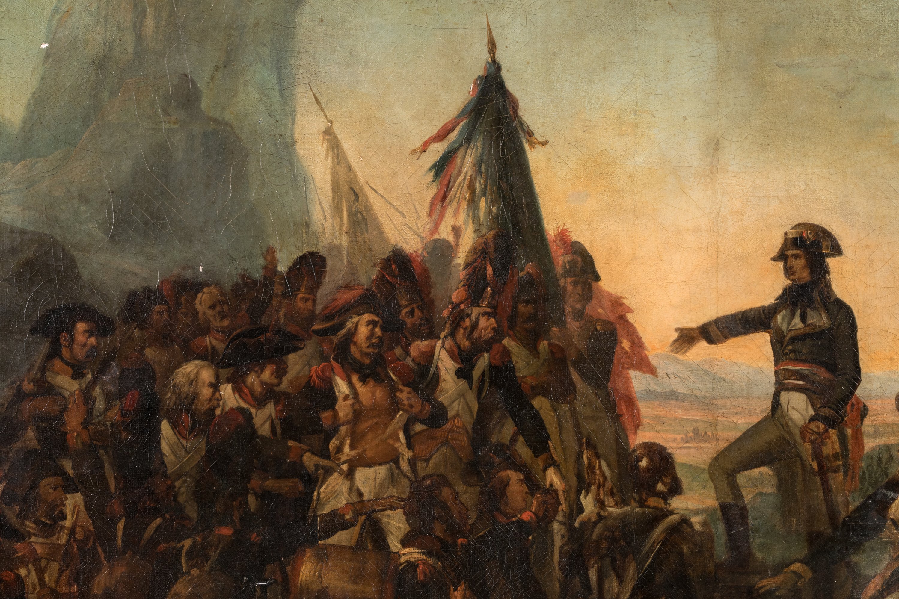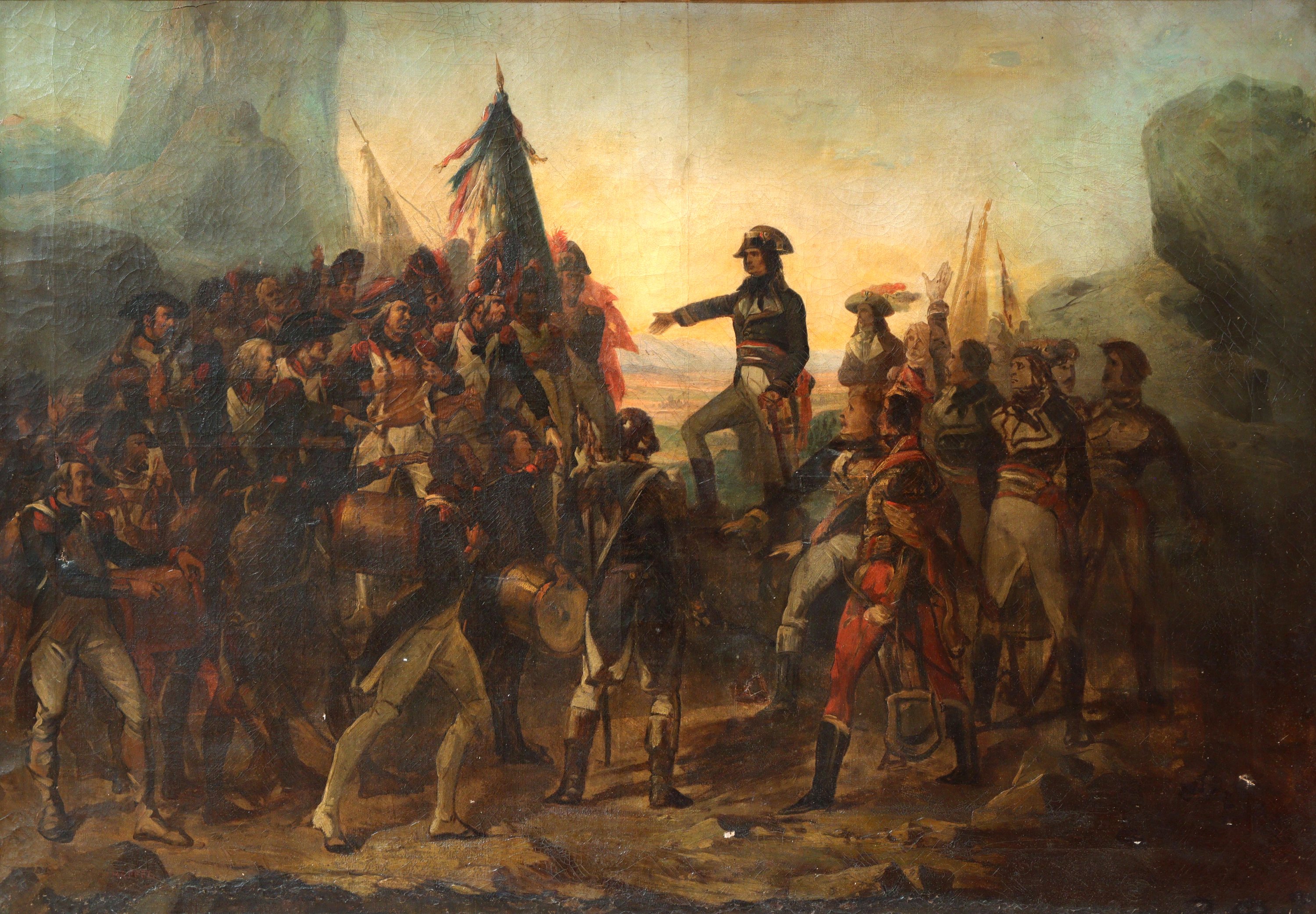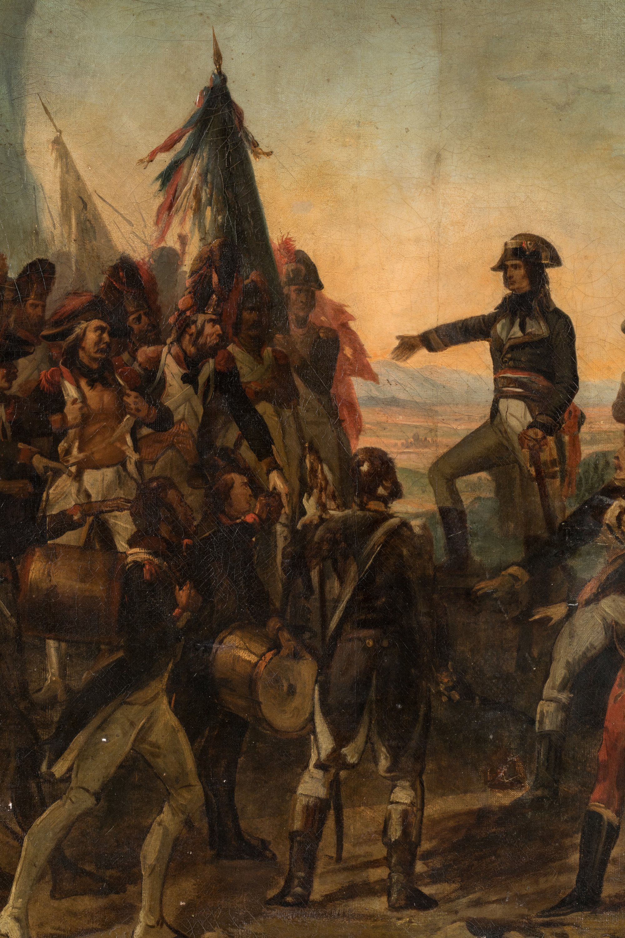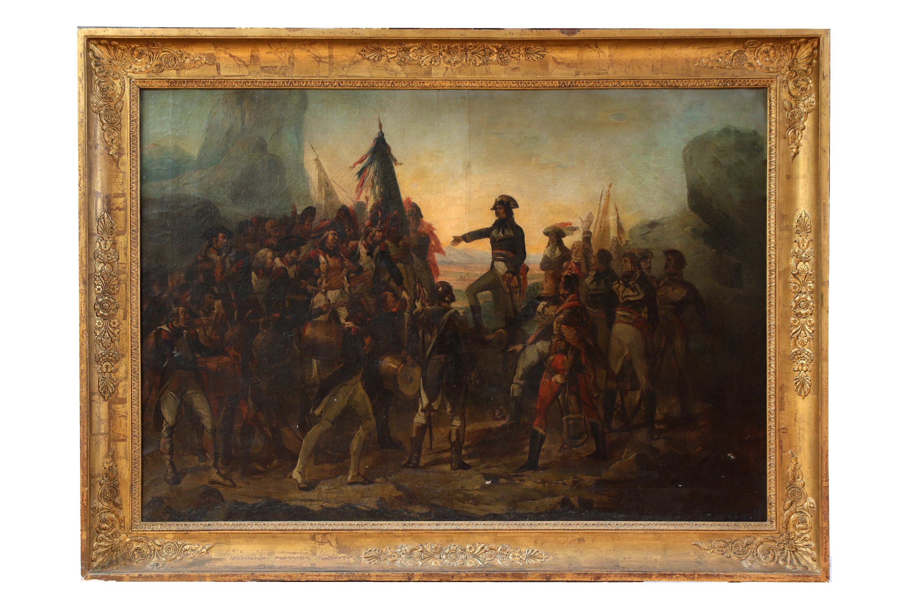 Auguste Raffet. A painting depicting Bonaparte haranguing the army. In a giltwood frame.
