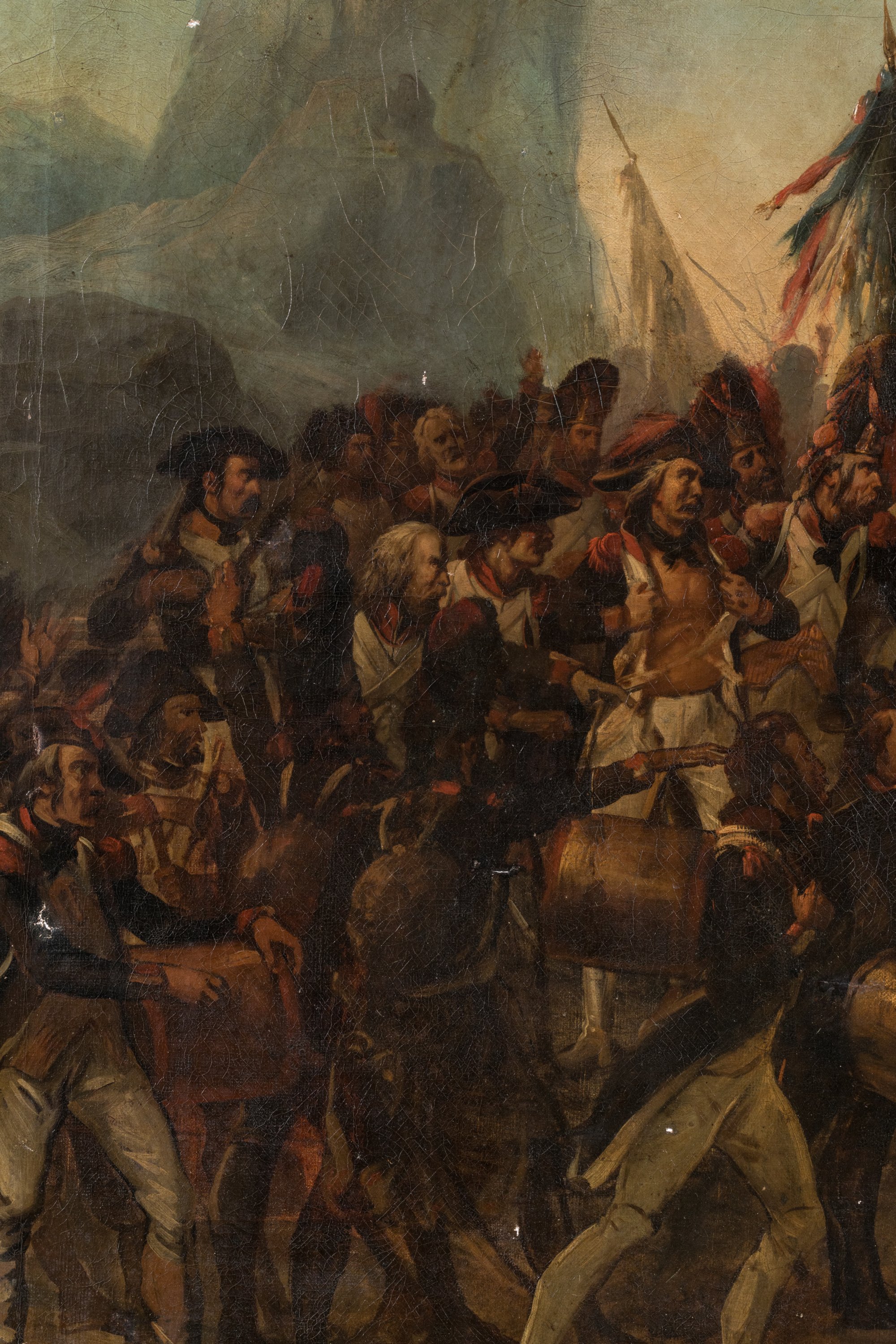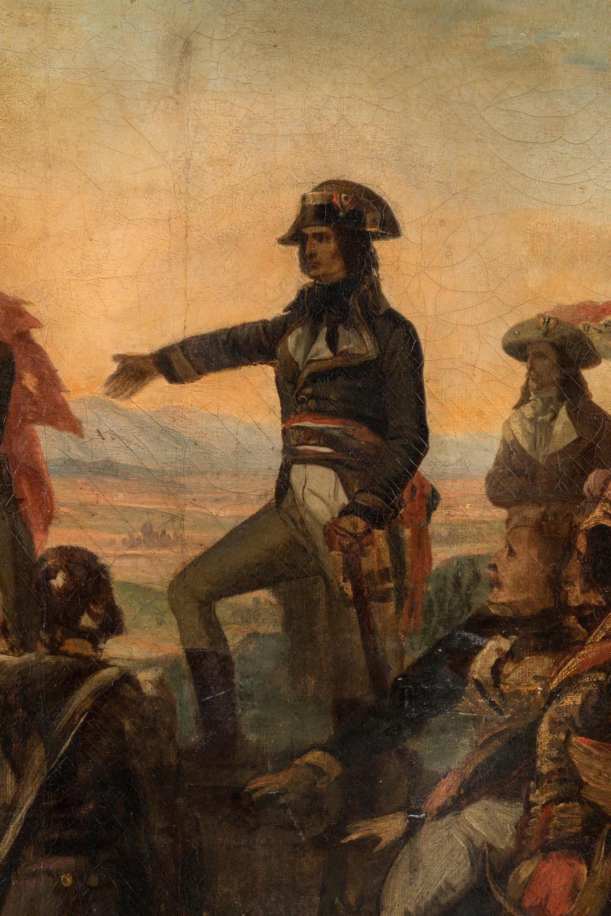 Neveu d'un général d'Empire, Raffet est l'un des principaux illustrateurs de la légende napoléonnienne. Le thème de notre toile est celui de la première campagne d'Italie, qui vit un général de 25 ans à la tête d'une armée de composition battre successivement sept armées et apporter la victoire à la République, mettant ainsi fin à la première coalition. La toile est à rapprocher des planches 215 et 215 bis de l'oeuvre lithographique du peintre, représentant Bonaparte arrivant en Italie, sur un plateau des Alpes, une main sur son sabre et montrant de l'autre les plaines de Lombardie à son armée.