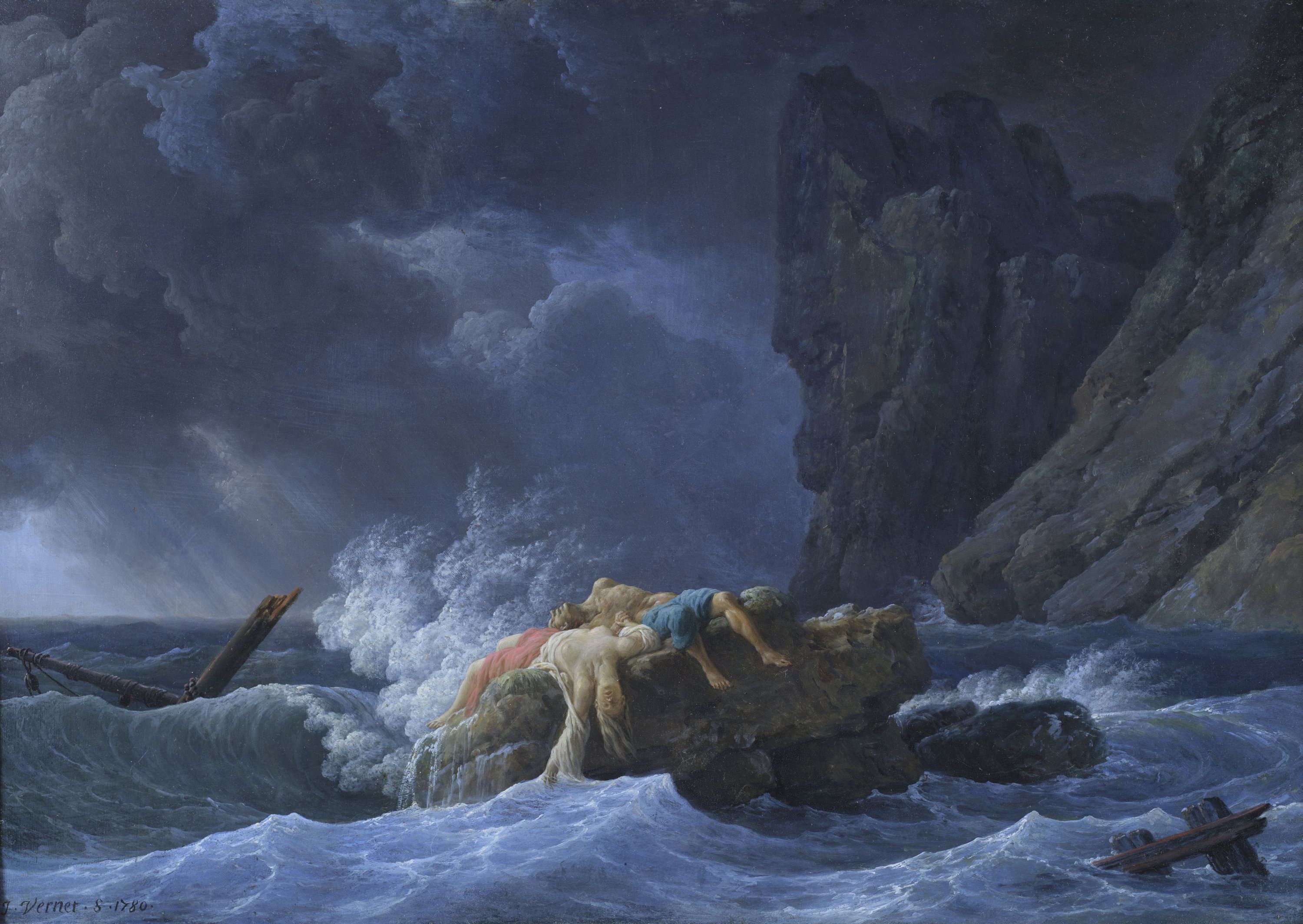 Claude Joseph Vernet, 1780. A painting depicting shipwreck victims on a rocky shore. On a copper plate. In a Louis XVI carved and gilded oakwood frame.