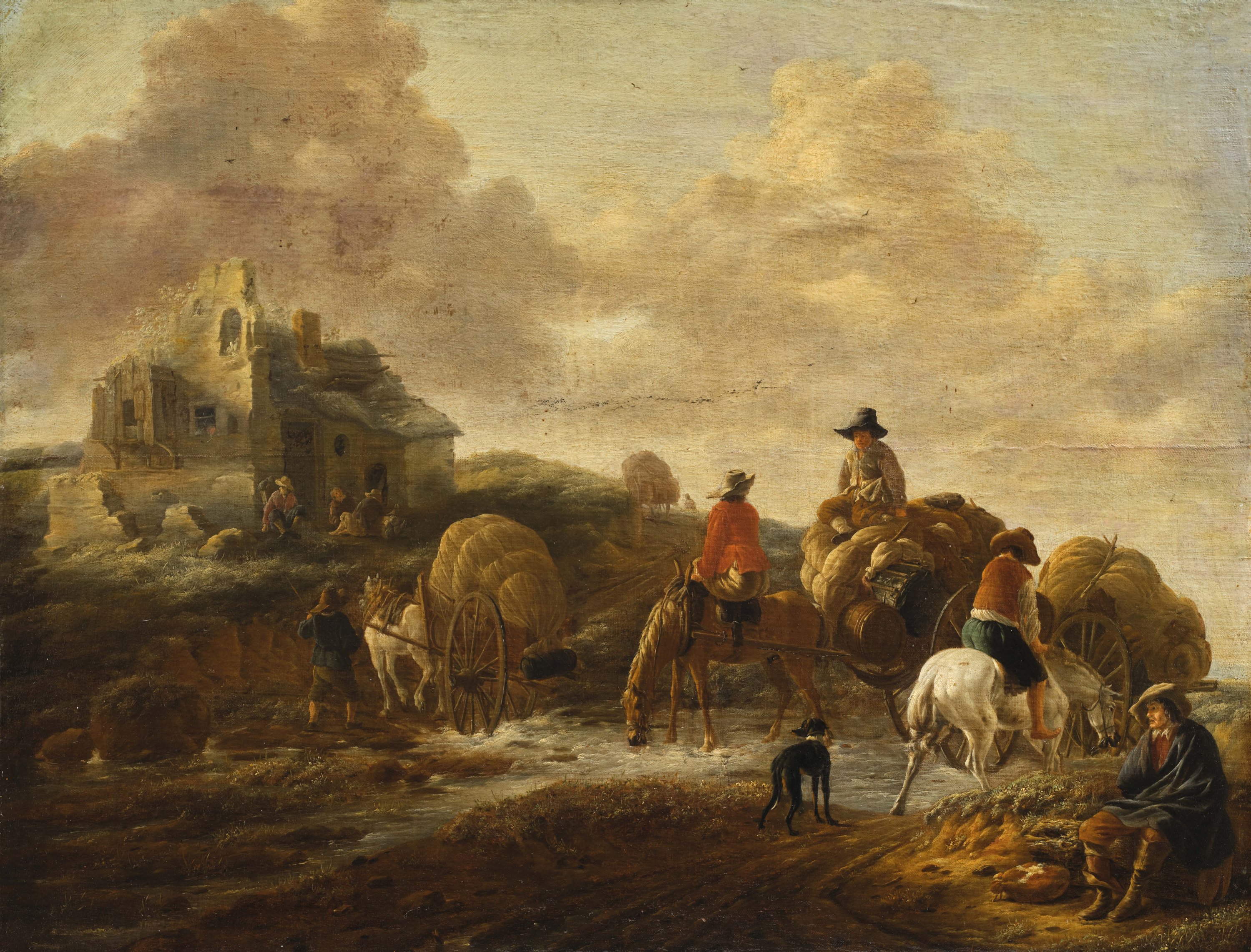 Pieter Wouwerman. A painting depicting a stop next to a thatched cottage. Oil on canvas on wood. In an 18th C. carved giltwood frame.