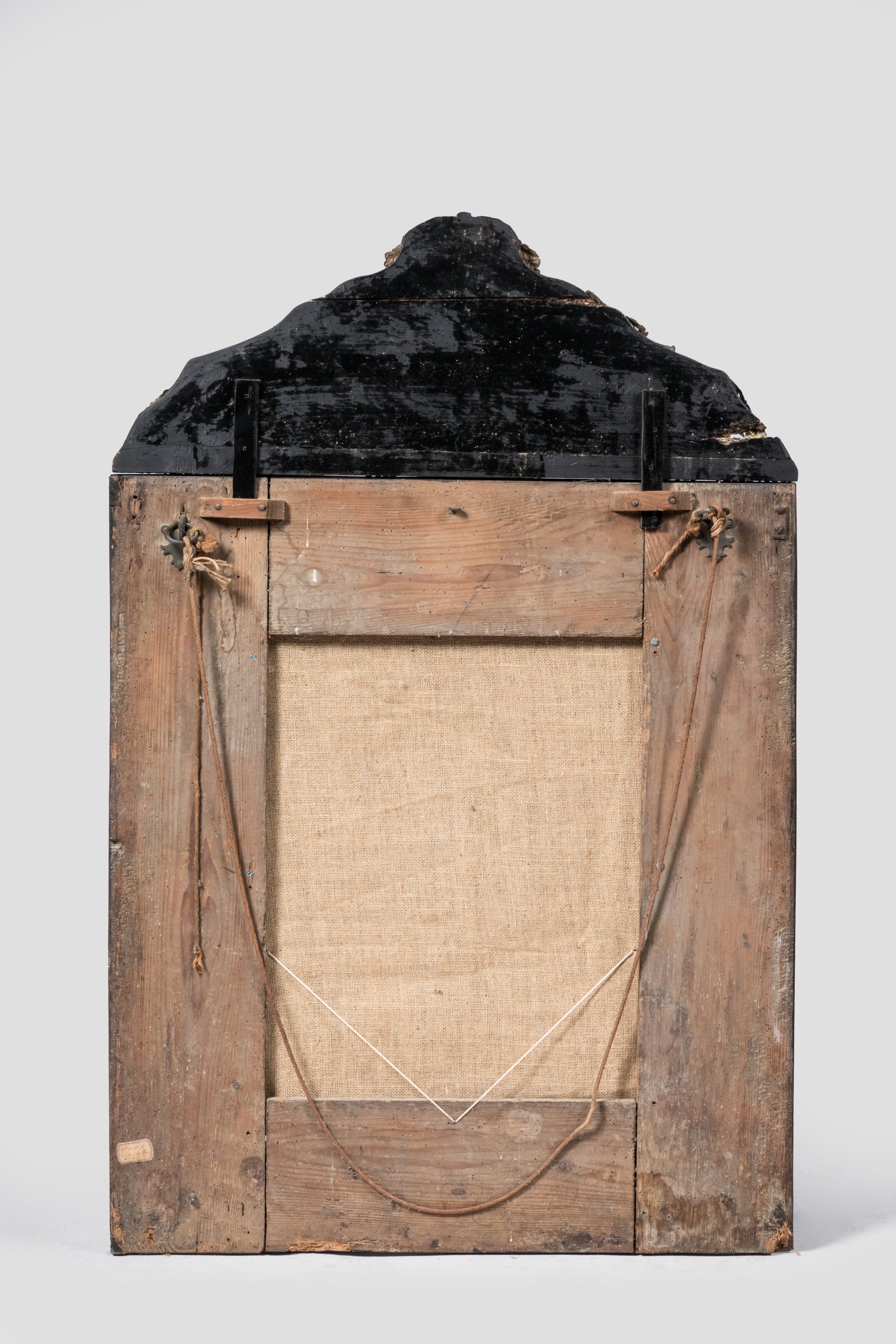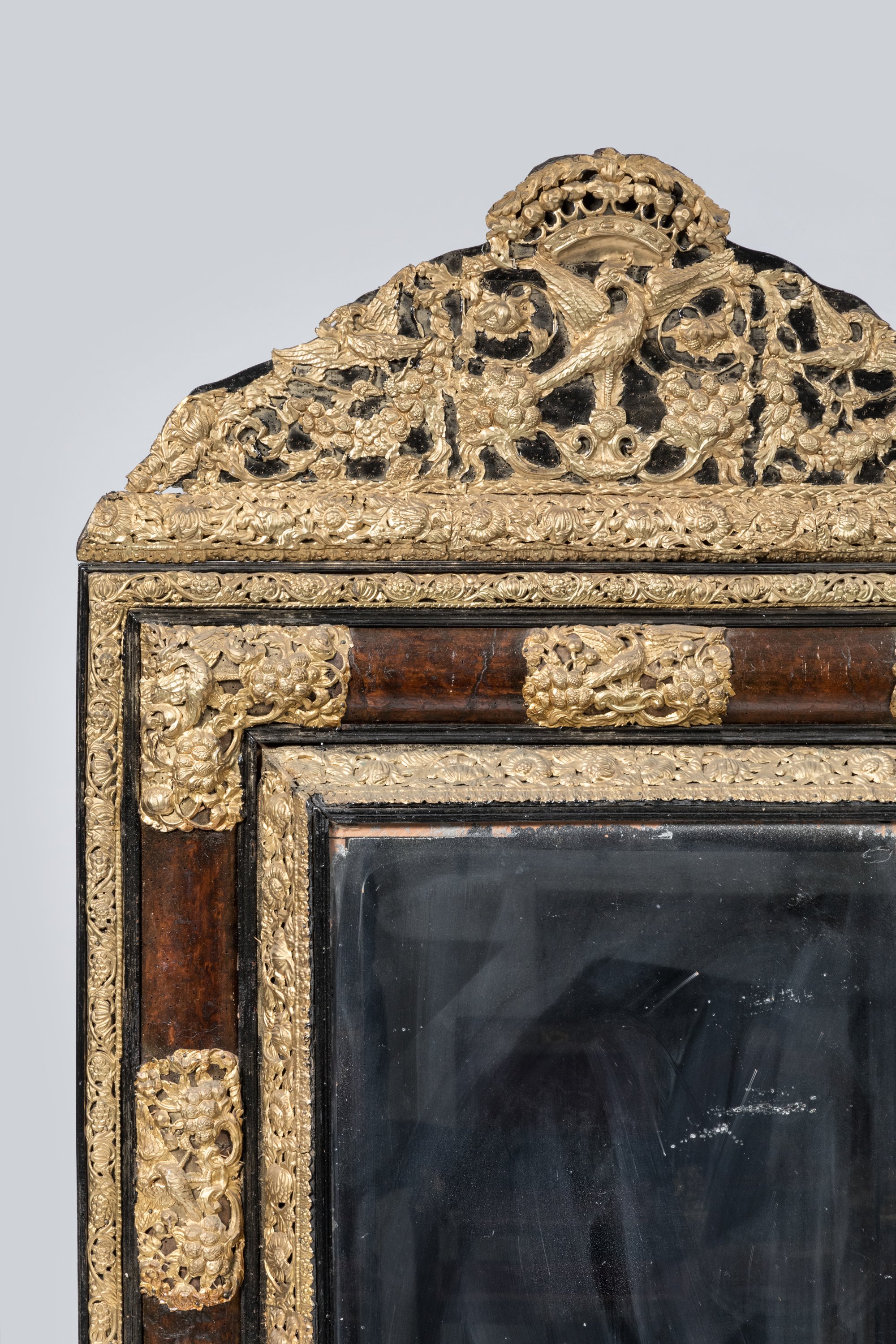 en laiton repoussé, placage de ronce de noyer et ébène. La partie supérieure décorée de trois aigles sous une couronne comtale dans un entourage de guirlandes feuillagées. La glace au mercure biseautée est soulignée de frises végétales, les angles et les points cardinaux d'ornements floraux.