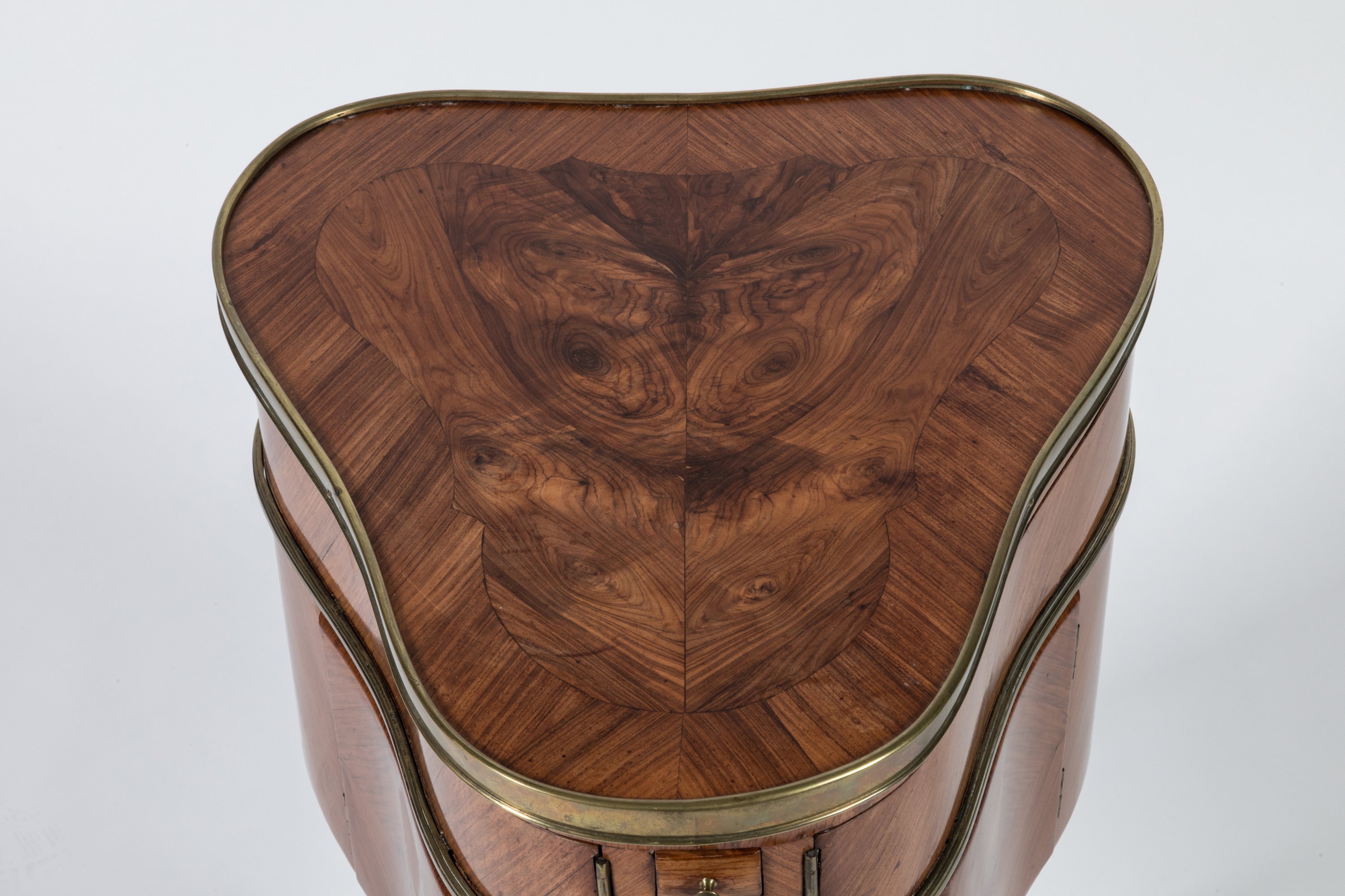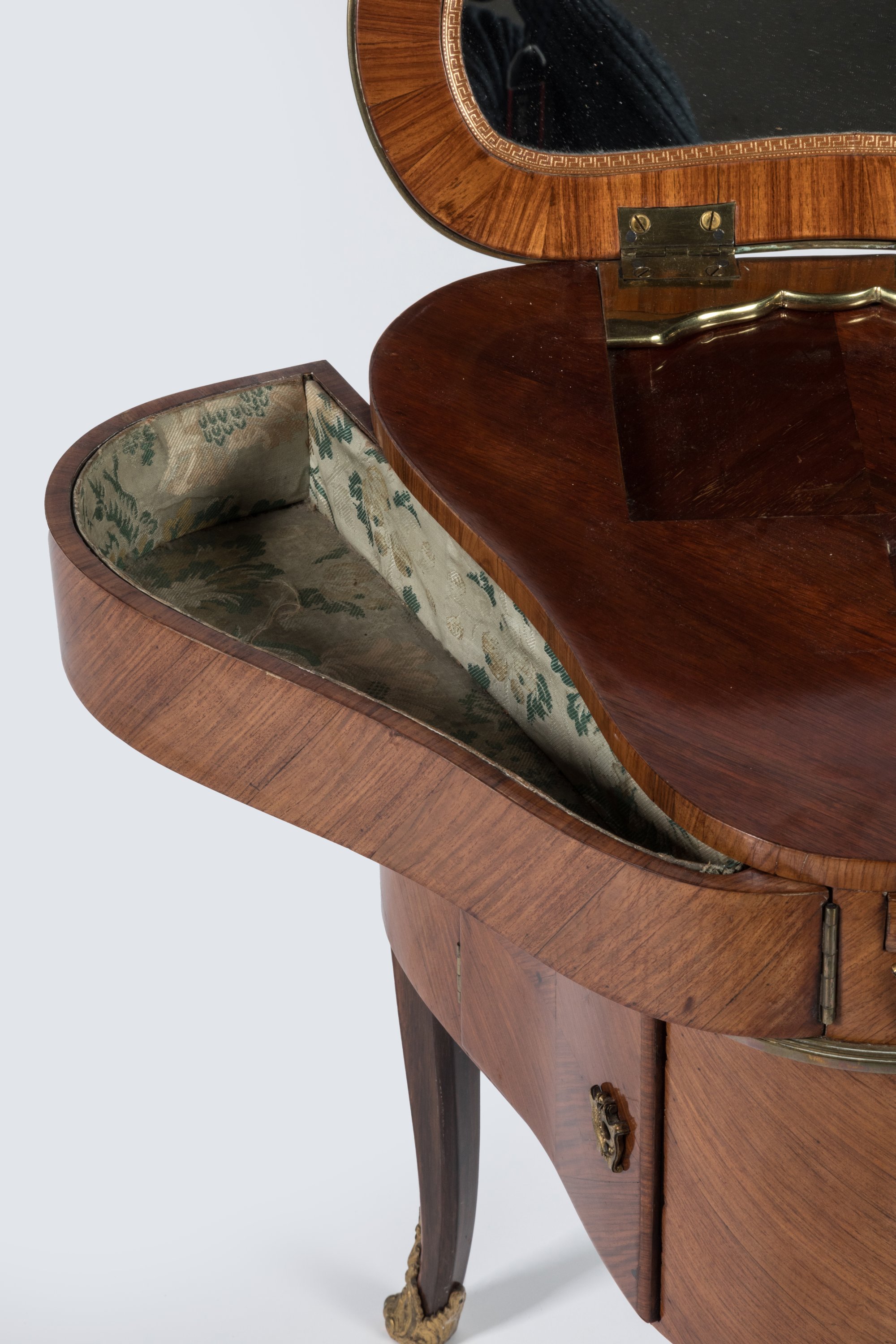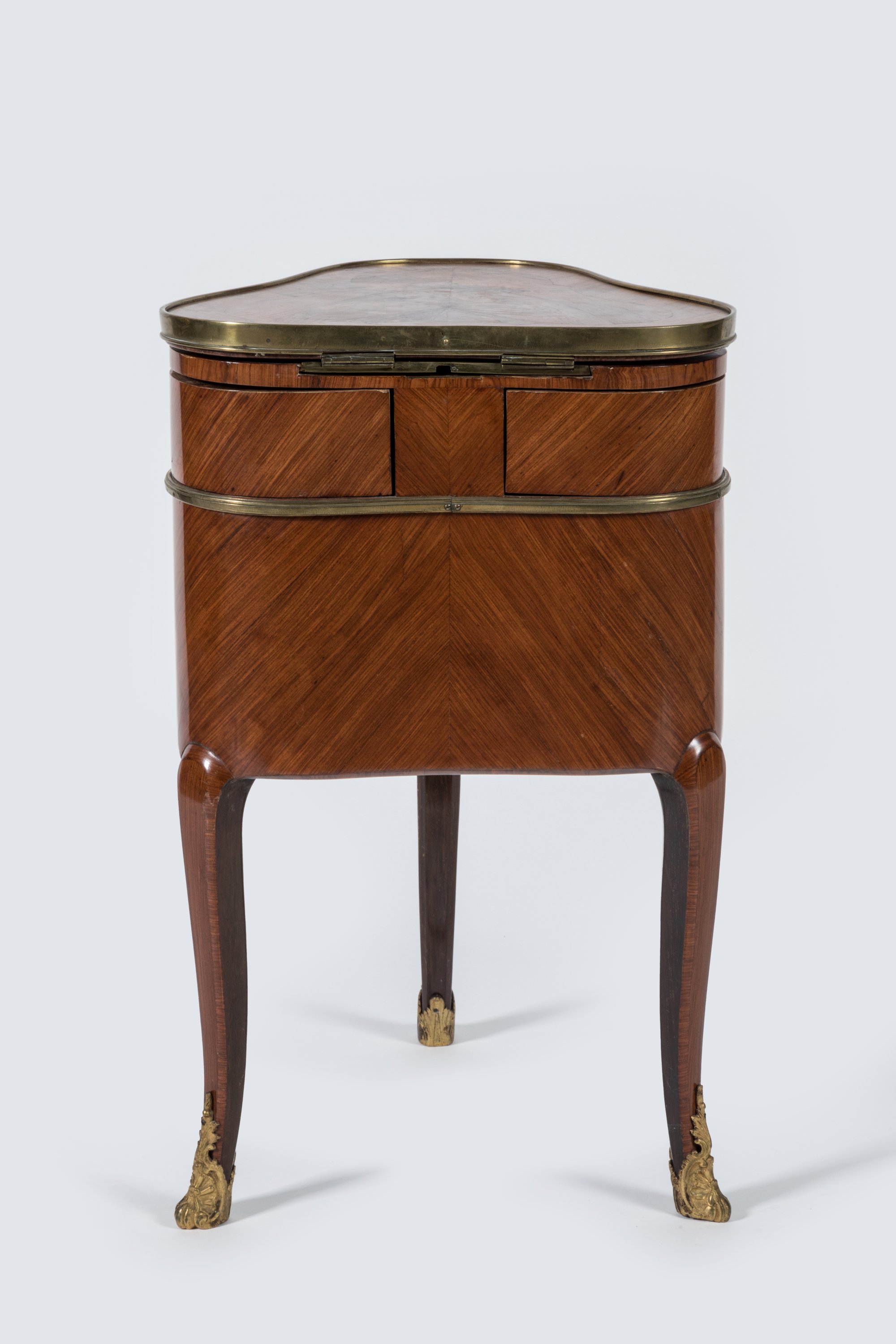 en placage de bois de violette et bois de rose, à ouverture mécanique par deux tiroirs violonnés et deux vantaux. Le dessus trilobé entouré d'une lingotière dévoile un abattant foncé d'un miroir intérieur dans une frise de grecques en cuir marqué au petit fer. Elle repose sur trois pieds cambrés terminés par des sabots feuillagés.
