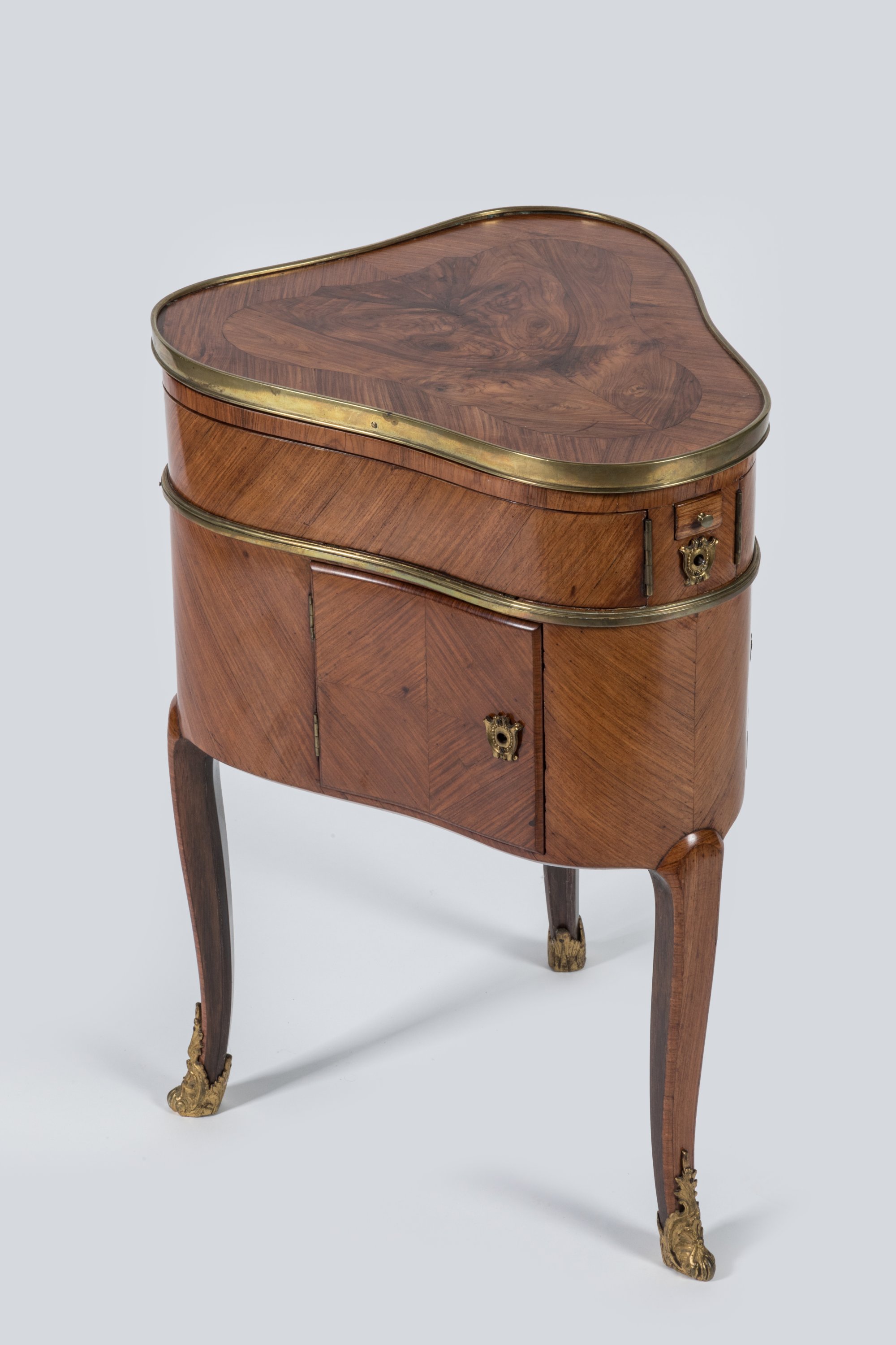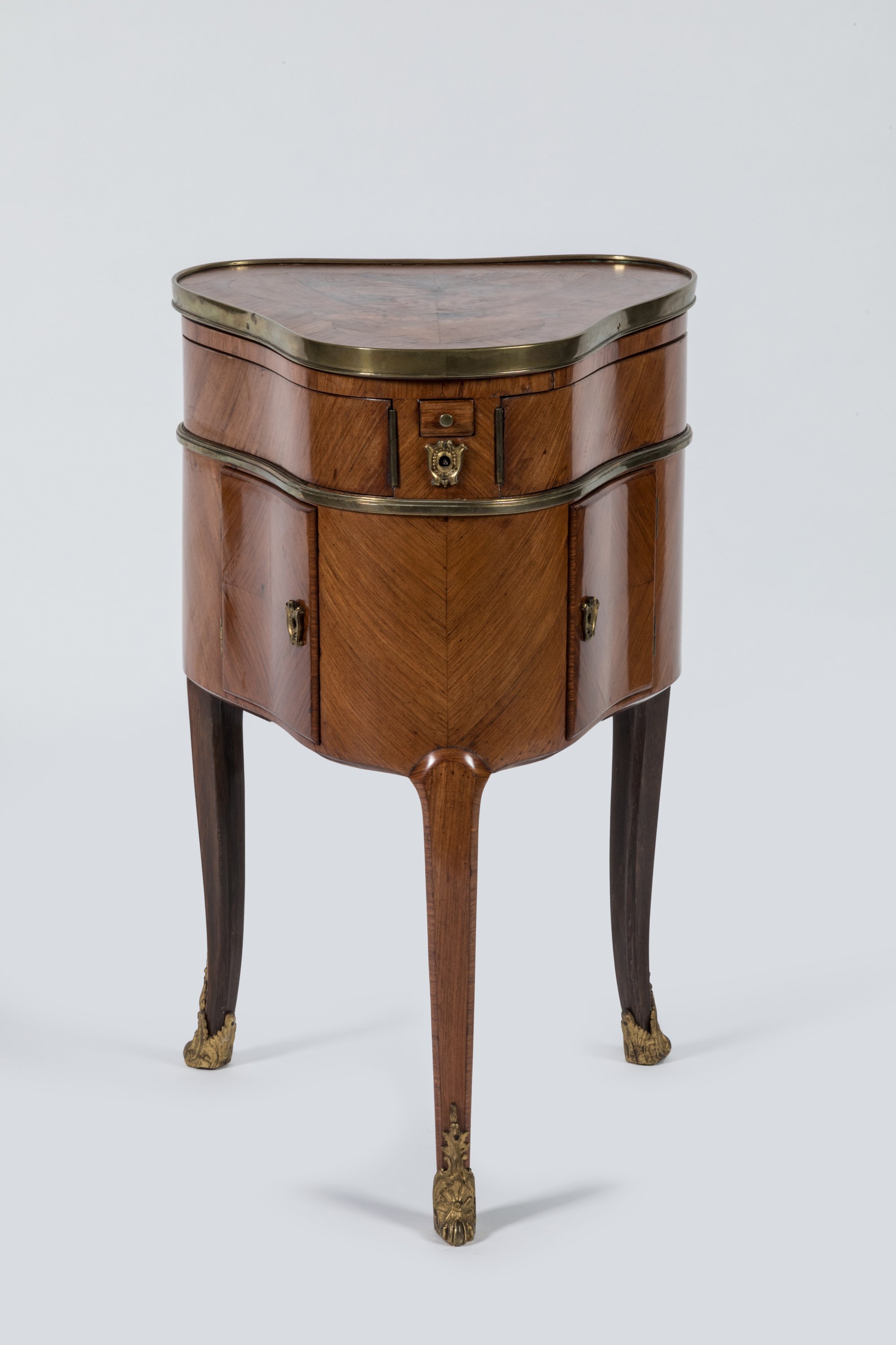 La table de toilette en forme de coeur est un meuble masculin, créé dans les années 1760 par Jean-François Oëben (Français, 1721-1763), dont l'inventaire en recense plusieurs exemplaires. L'une d'elle est reproduite dans Les cahiers du mobilier consacrés à l'ébéniste, en 2002, par les éditions de l'Amateur (p. 89). L'abattant orné d'un miroir ainsi que les compartiments sur les côtés permettent aux hommes de ranger leur nécessaire de toilette et de rasage.