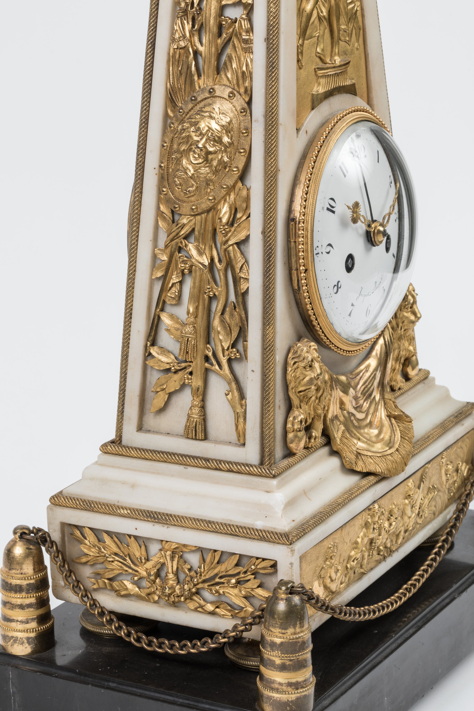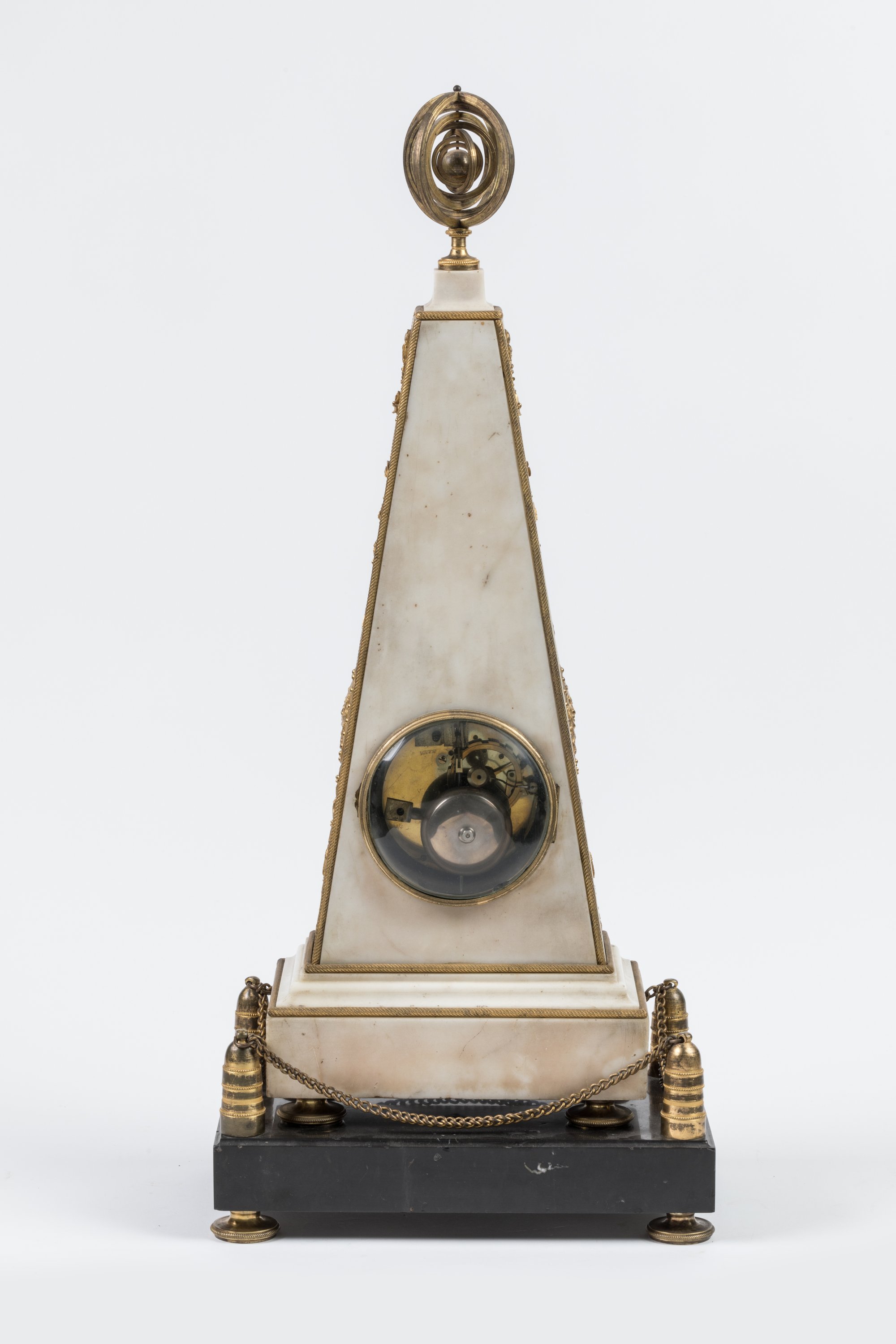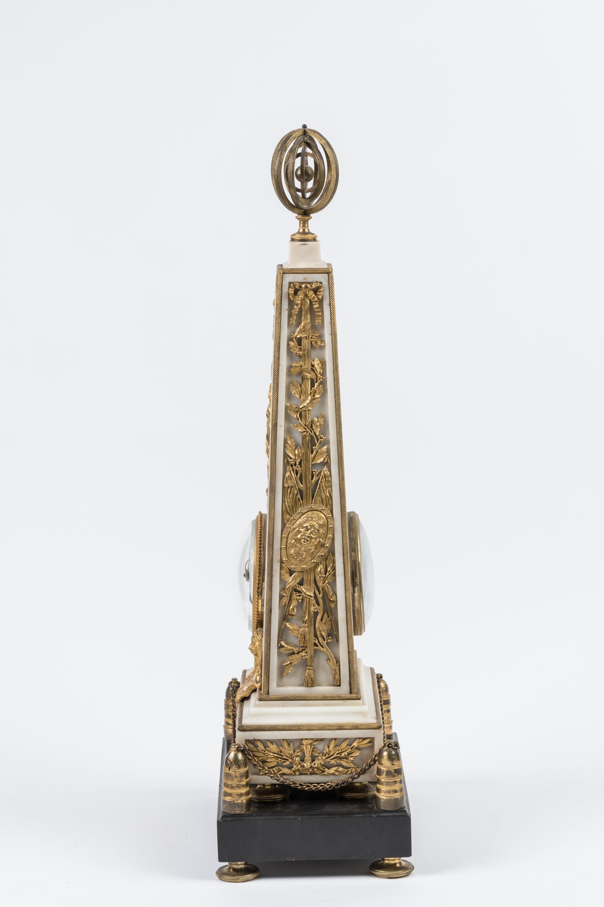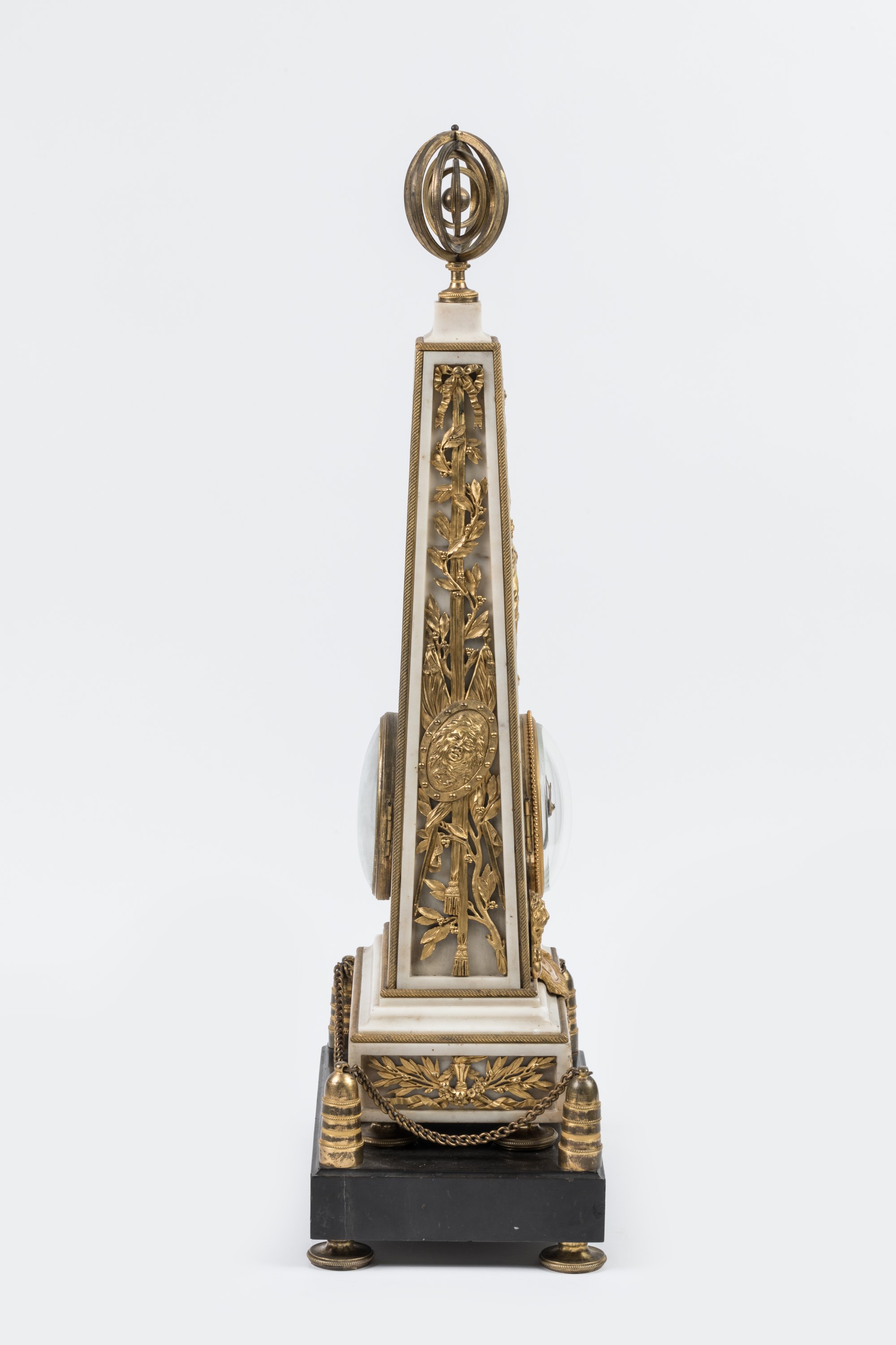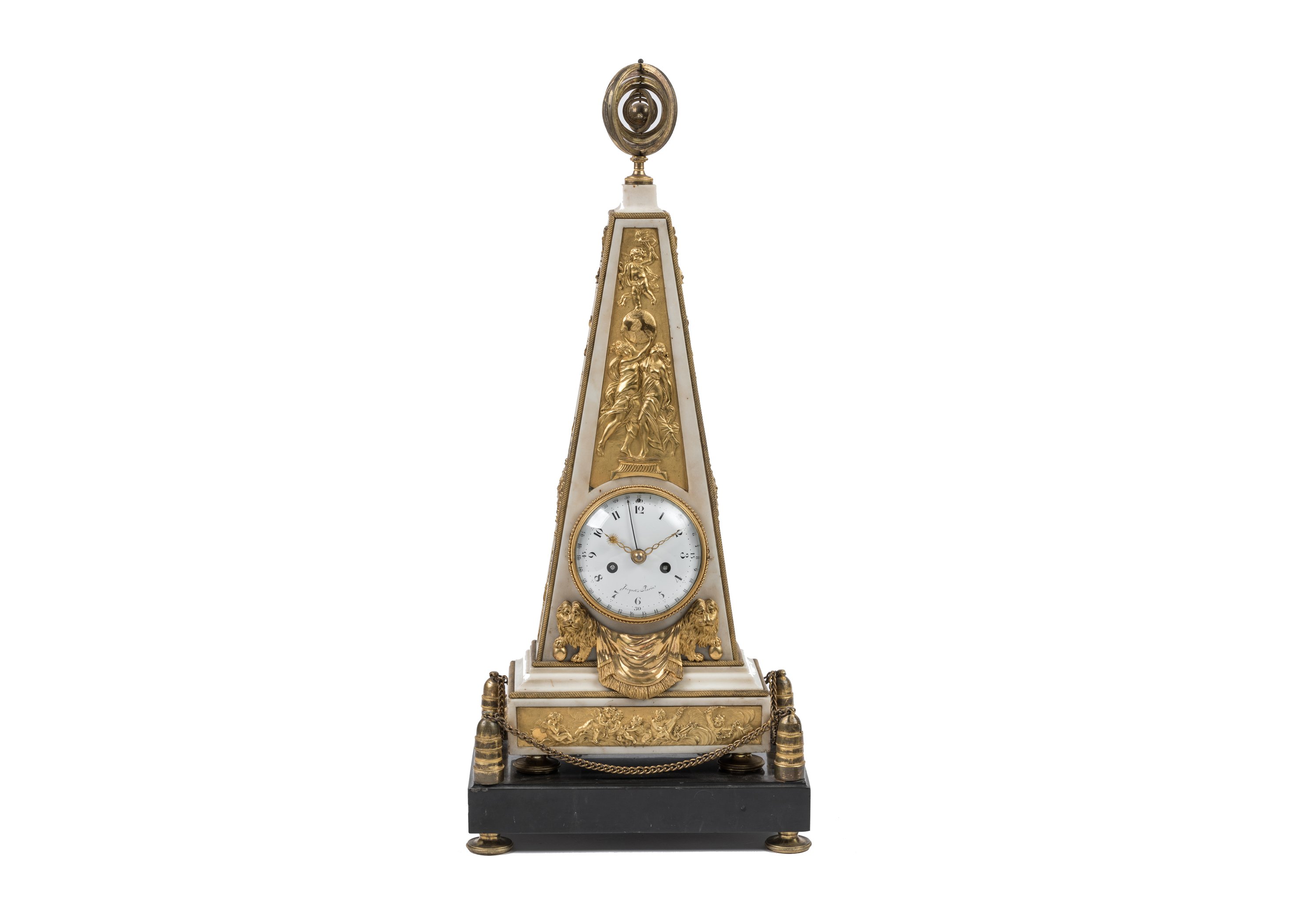 Late 18th C.- early 19th C. A large ormolu and white marble obelisk clock. Topped with an armillary sphere. On a black marble base.
