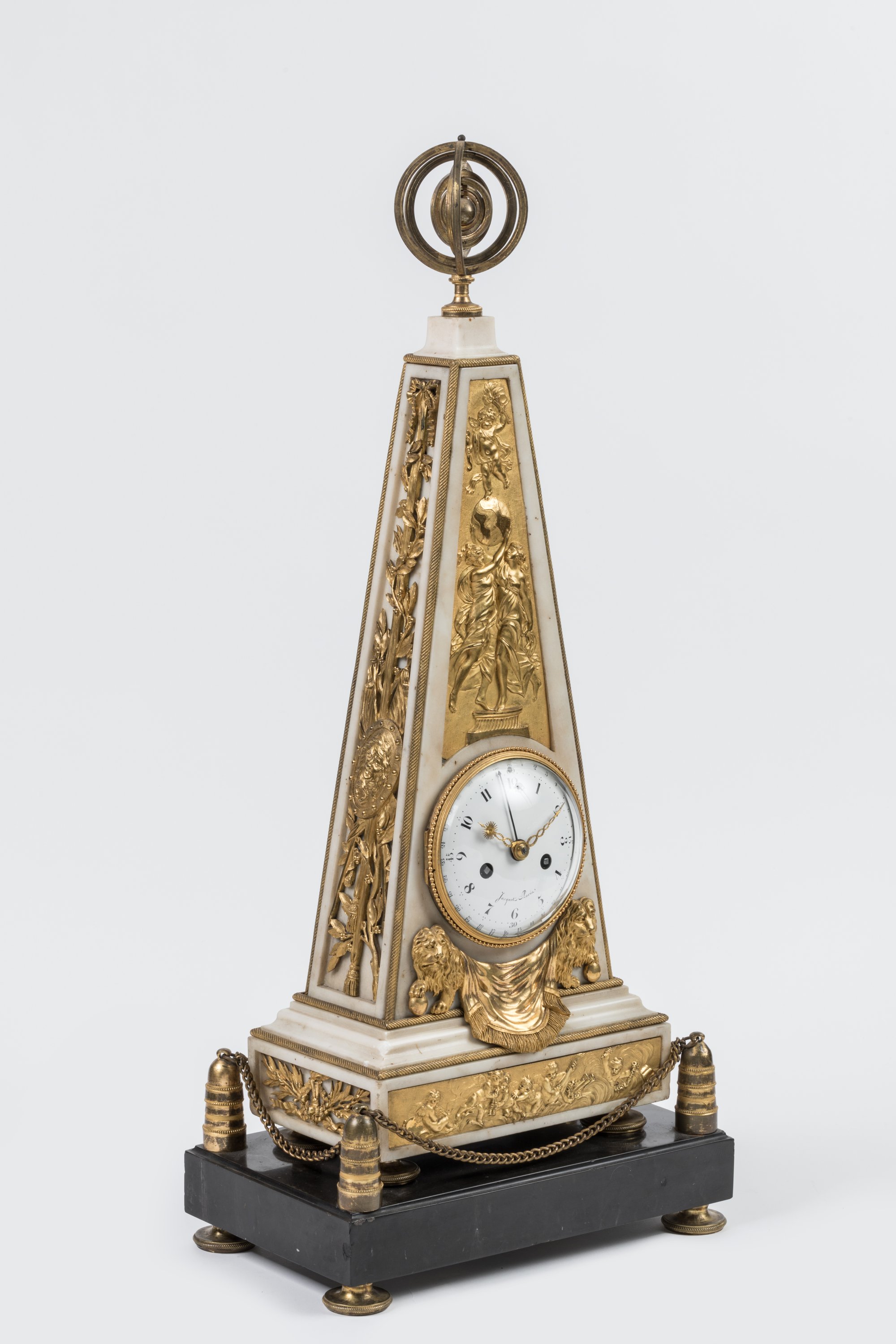 L'obélisque, surmonté d'une sphère armillaire, est orné à sa base d'un cadran émaillé signé "Jacquot A Paris", avec les heures et les minutes en chiffres arabes. Le cadran est surmonté d'un bas-relief en bronze doré avec deux nymphes portant le monde sur lequel trône Cupidon et soutenu par un autre bas-relief présentant deux lions réunis par une draperie. Les côtés sont décorés d'attributs guerriers et les arêtes soulignées par un liseré doré torsadé. La base est ornée d'un bas-relief en bronze doré avec une frise d'enfants dans le goût de Clodion.
