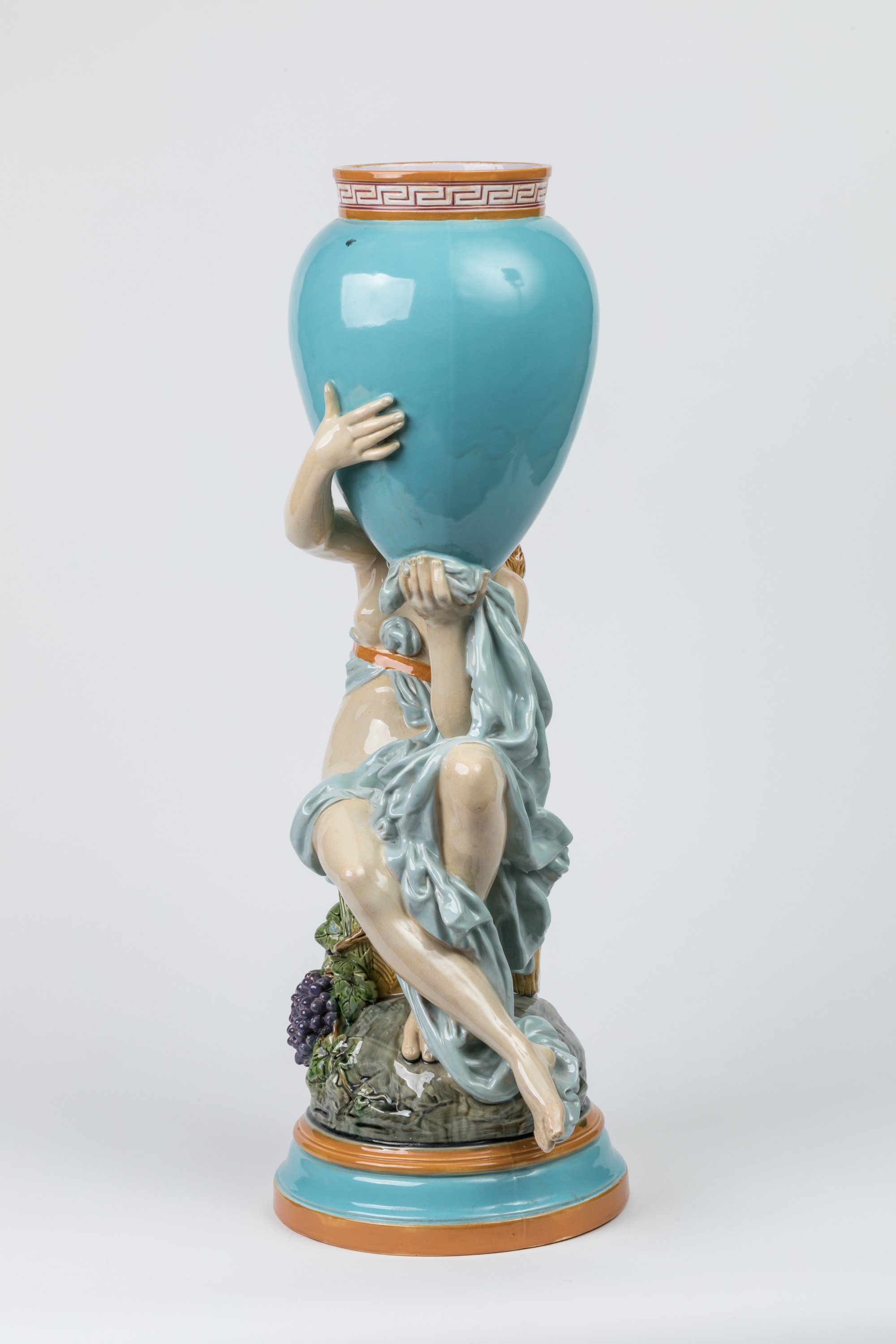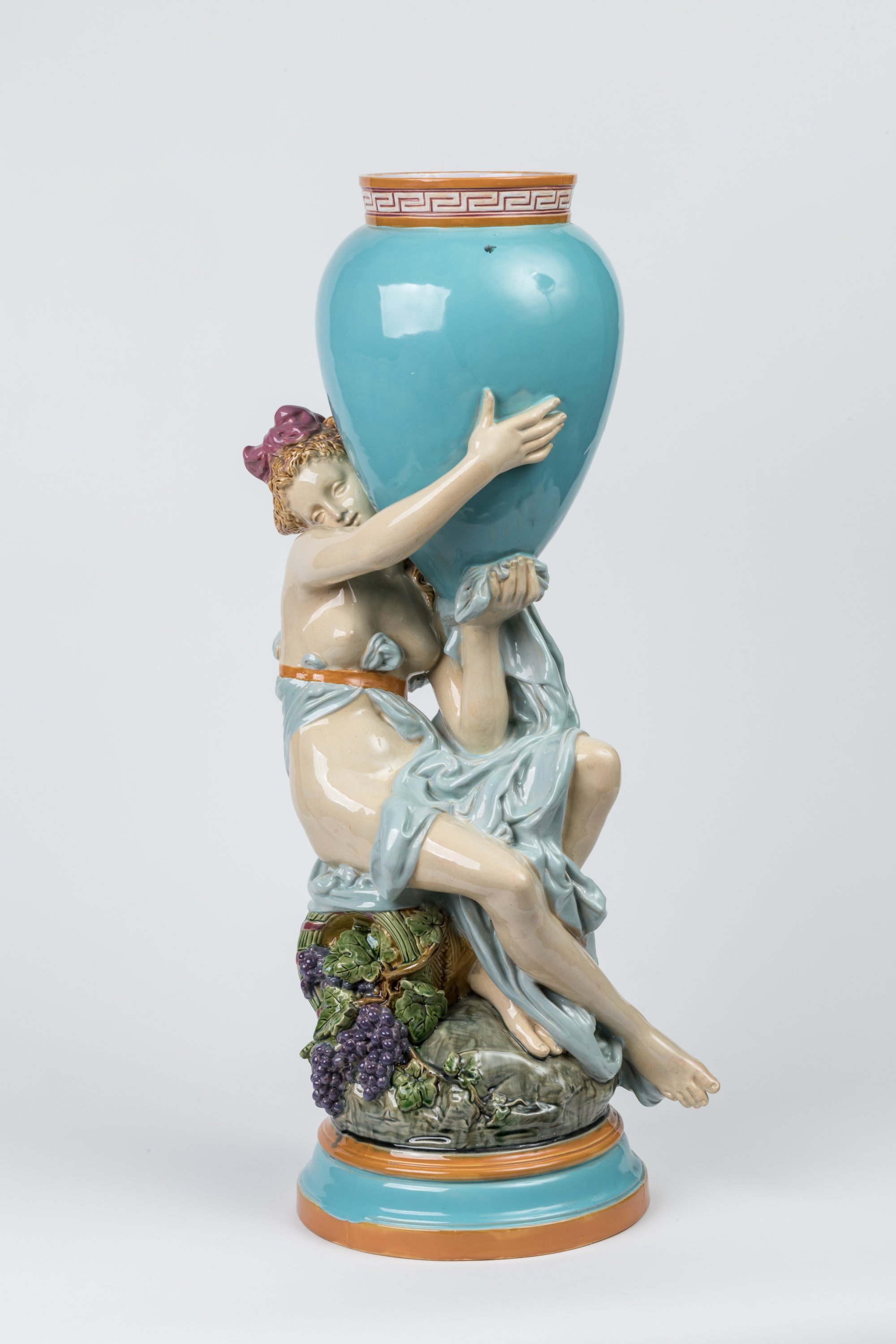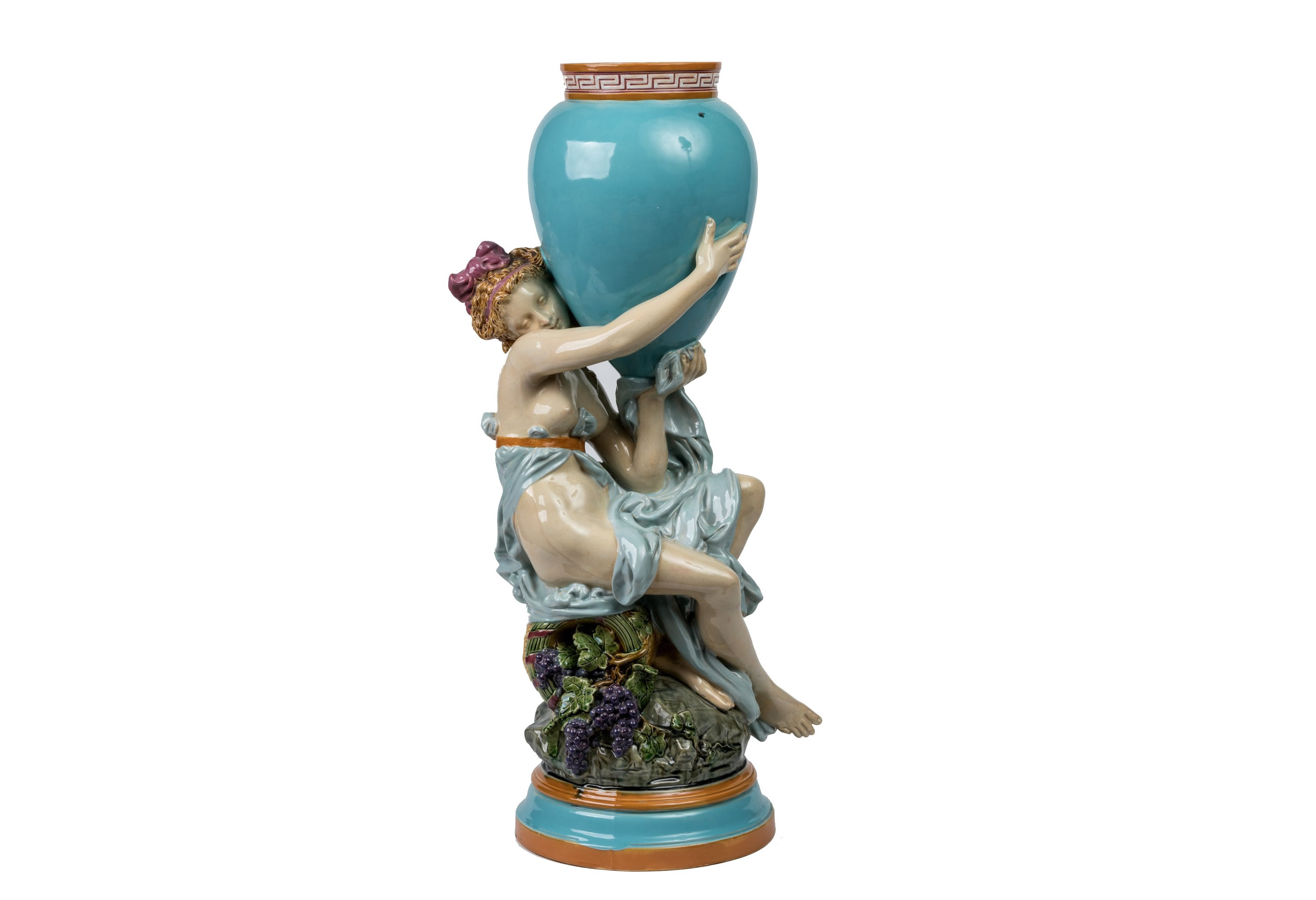 Albert-Ernest Carrier-Belleuse for Minton, 1878. A polychrome glazed majolica vase figuring a scantily clad nymph seated on a wicker basket overflowing with grapes while supporting an amphora.