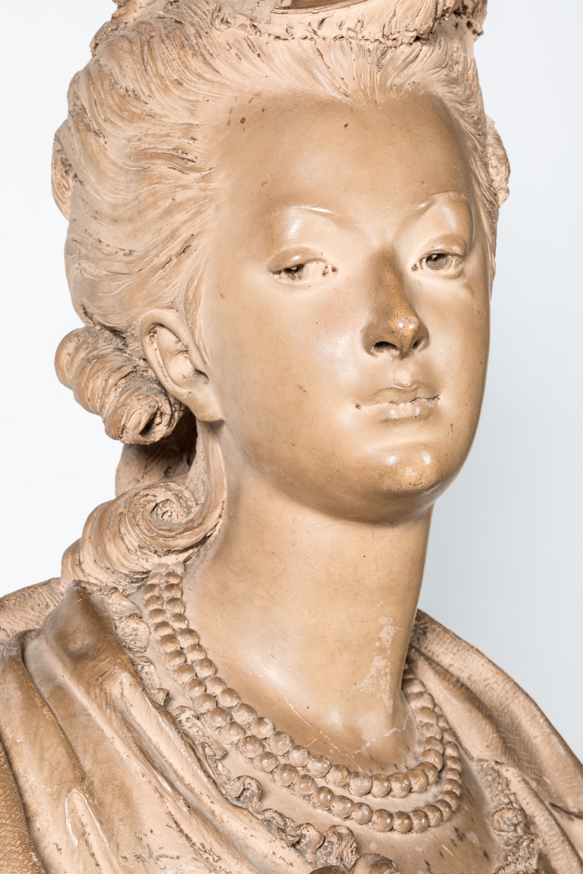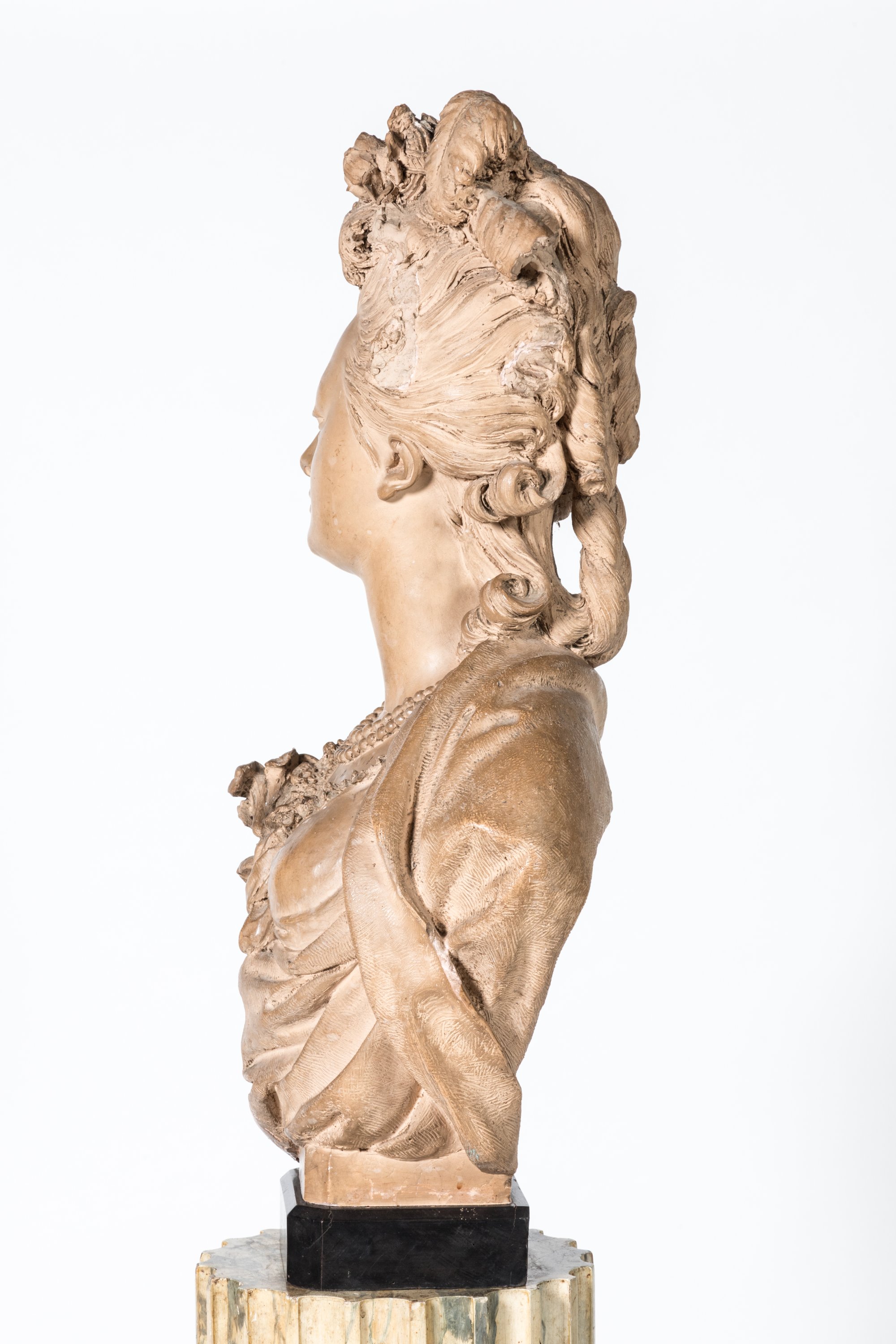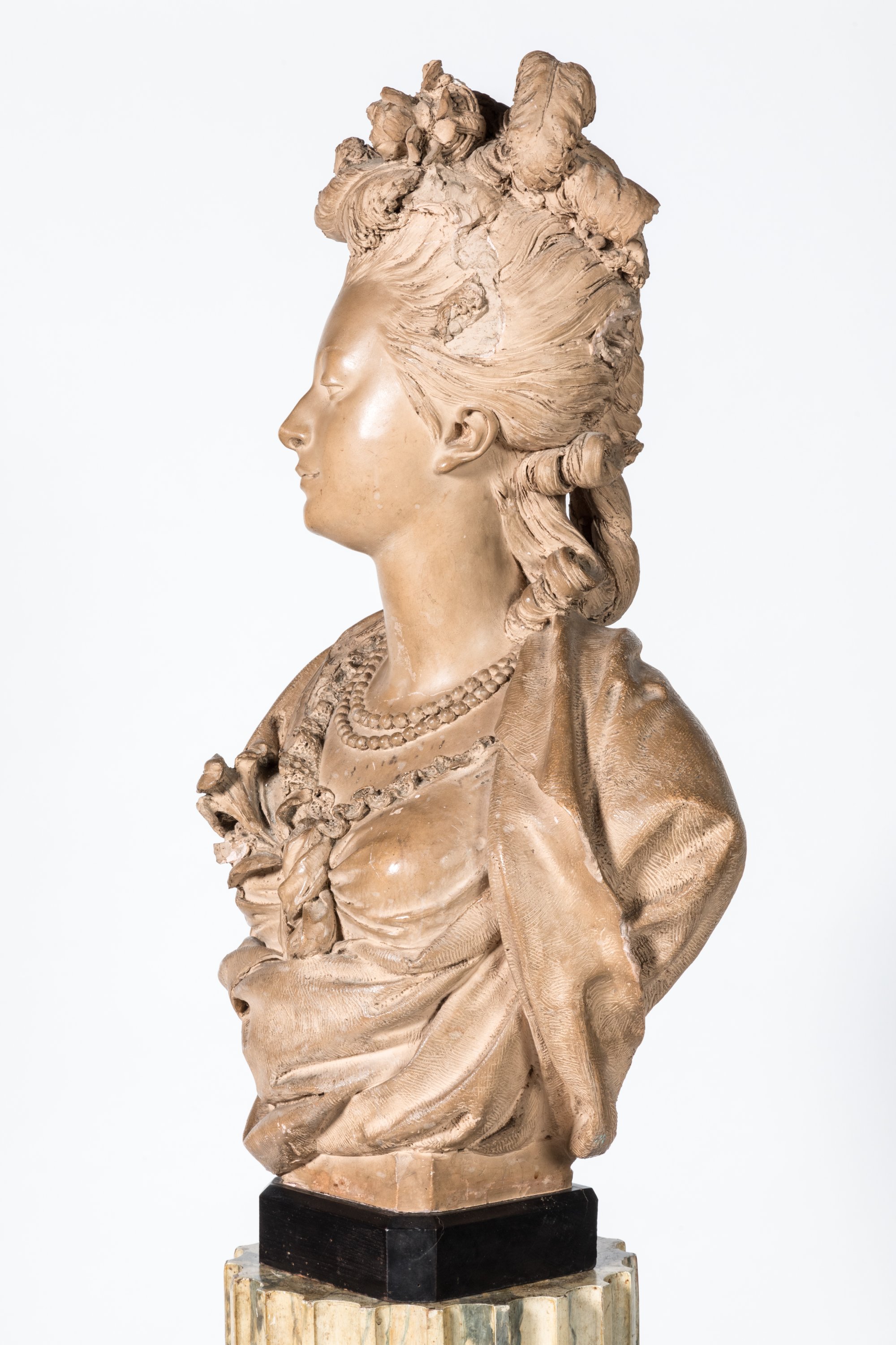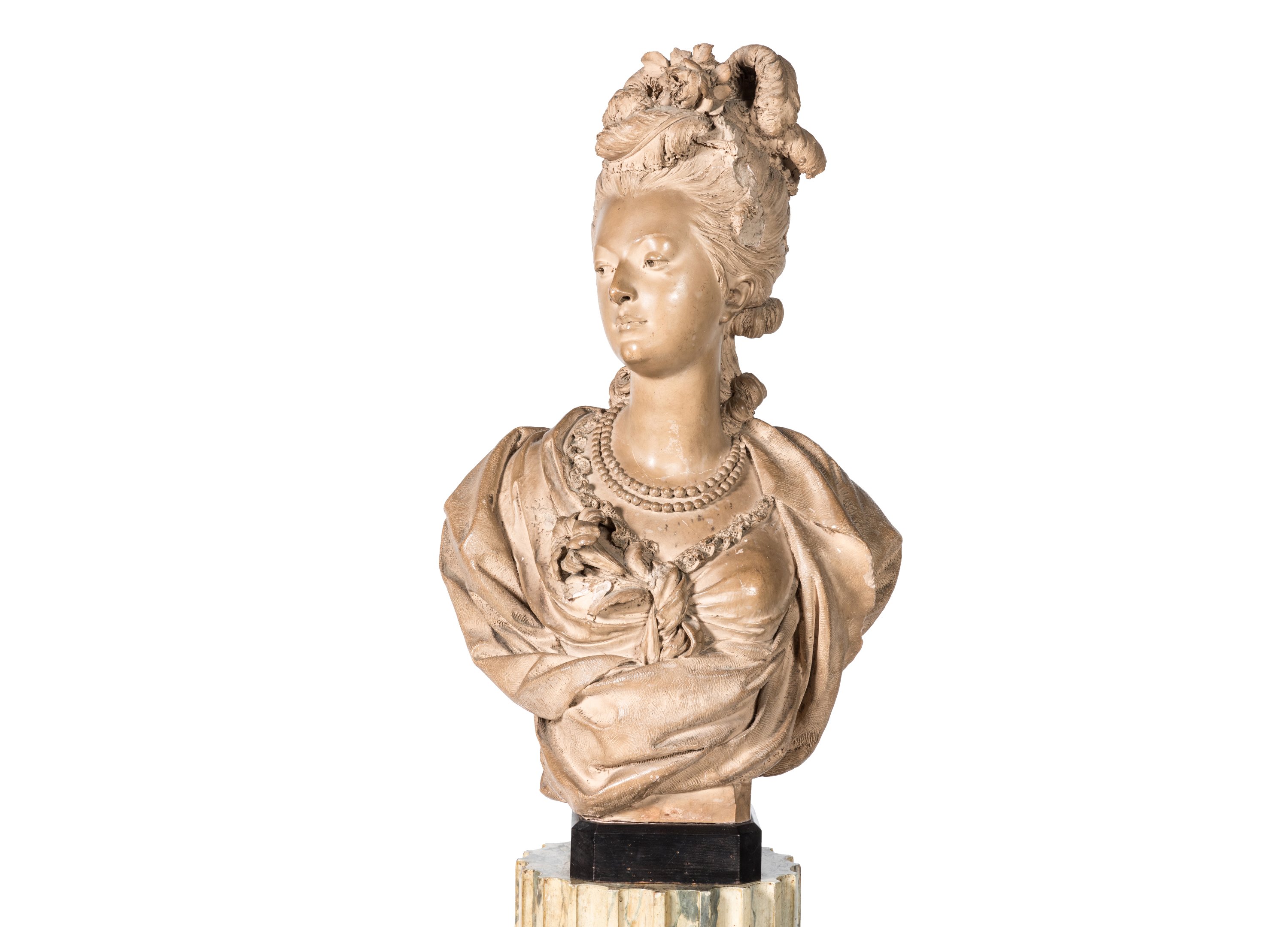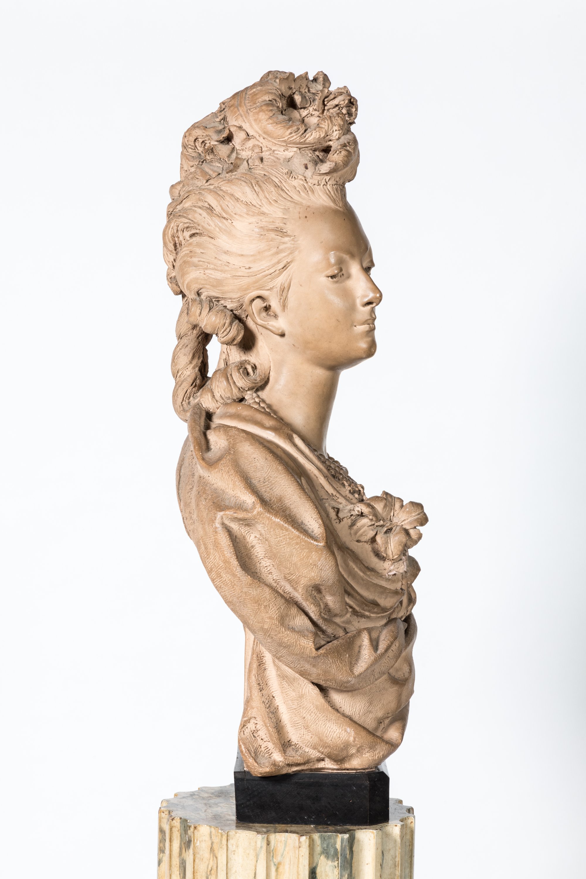 L’œuvre de Carrier-Belleuse est à envisager sous deux angles. D’une part, il se présente comme le prolongement de la statuaire du XVIIIe siècle, en s’inspirant notamment des œuvres de Houdon, d’autre part il s’inscrit dans la production presque sérielle du XIXe siècle. Réalisé en terre-cuite, notre exemplaire figure une jeune femme au collier à double rang de perles. Il évoque à la fois le fantasme pour le siècle des Lumières, encouragé par l’attrait de l’Impératrice Eugénie pour Marie-Antoinette, et le demi-monde où Carrier-Belleuse puise une partie de ses modèles, à l’instar de Marguerite Bellanger, maîtresse de l’Empereur Napoléon III (in "Carrier-Belleuse. Le maître de Rodin", cat. exp., Palais de Compiègne, Paris Ed. de la RMN, 2014, p. 53-54). Ce buste s’inscrit dans la production de portraits dits « de fantaisie ». L’artiste s’inspire évidemment des ateliers de céramique avec lesquels il collabore pour augmenter efficacement sa production. Il utilise des moules pour former le sujet principal et assemble des morceaux avant la cuisson, afin de le personnaliser.