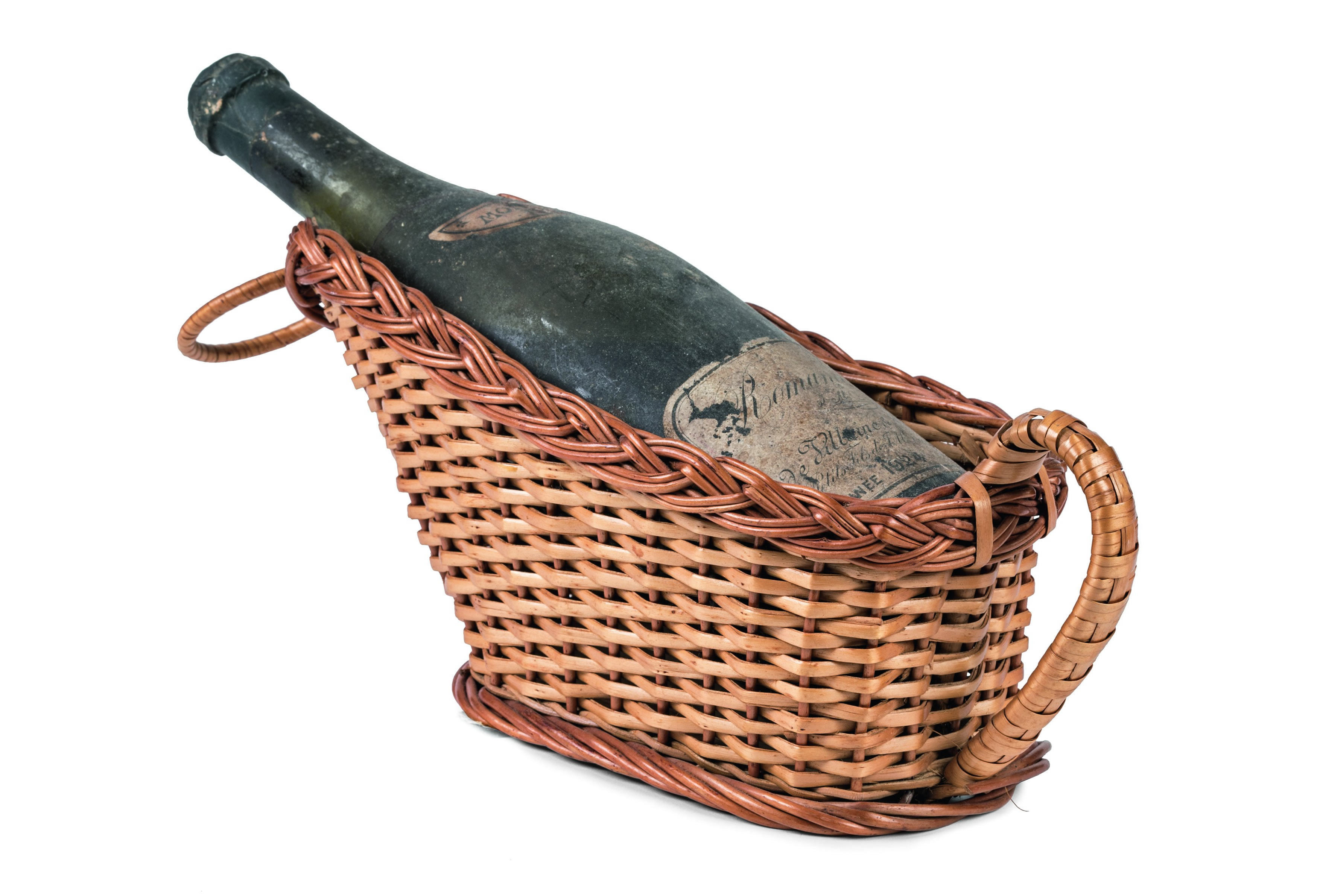 A 1924 bottle of Romanée Conti red wine. In a contemporaneous wicker basket.