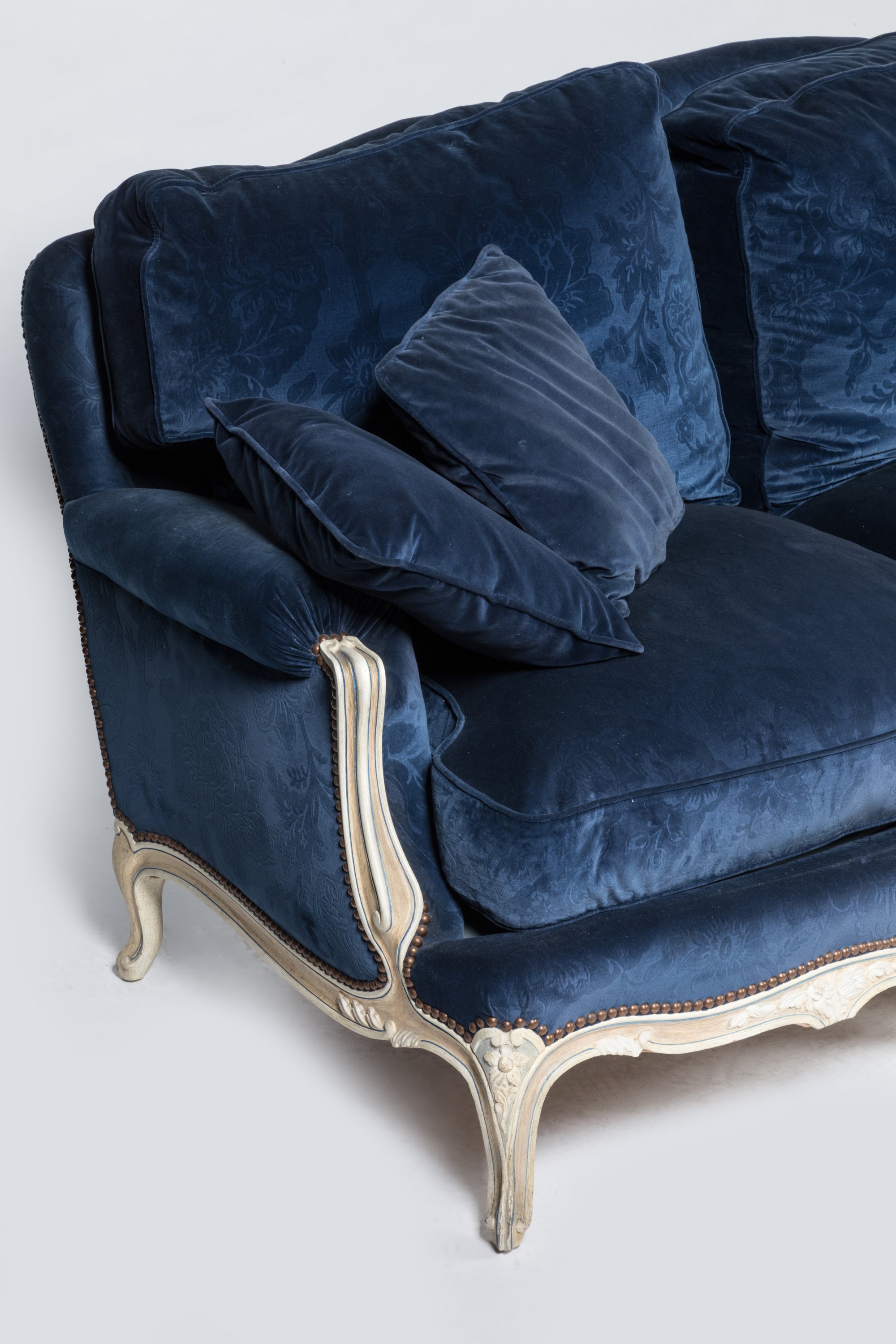 en bois mouluré, sculpté et laqué crème et bleu. Les accotoirs de forme mouvementée reposent sur une ceinture chantournée à décor de motifs floraux. Huit pieds cambrés.