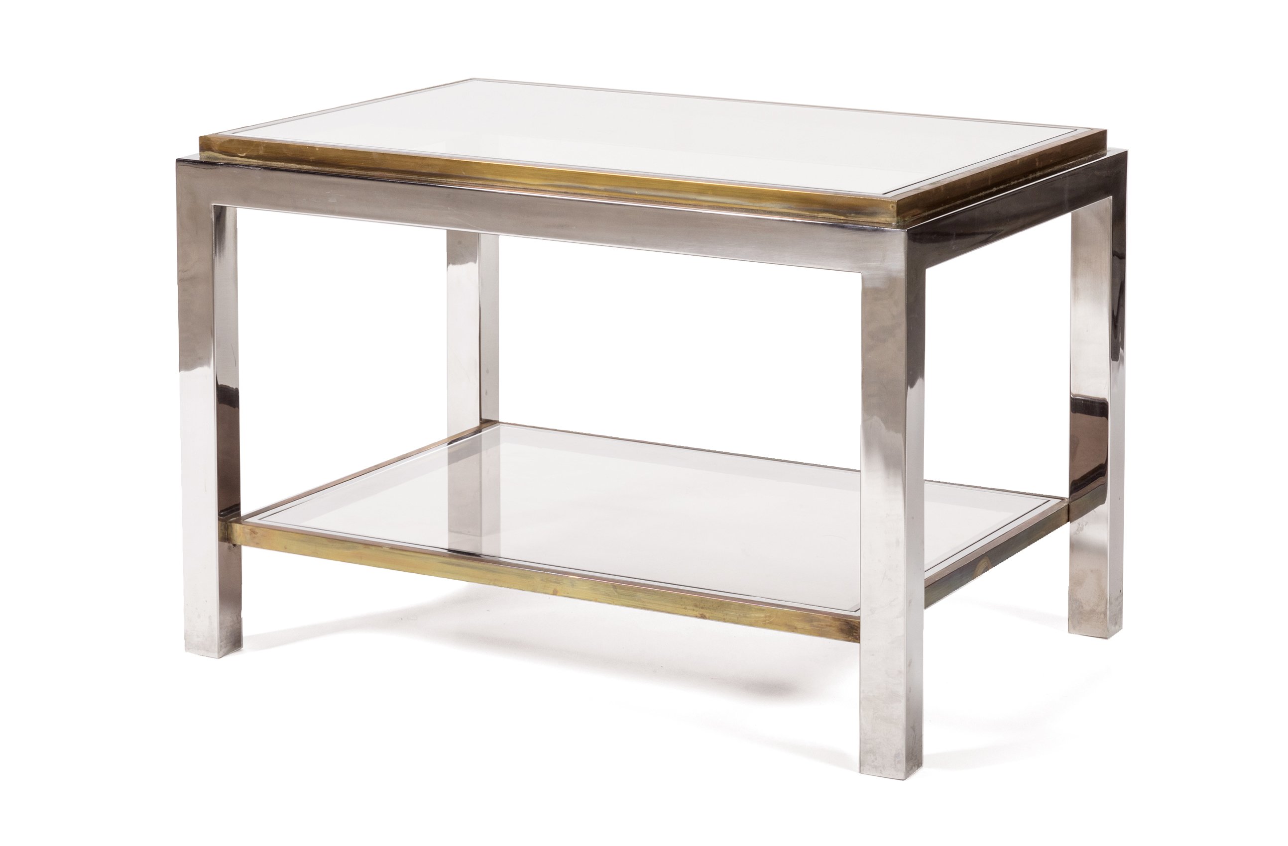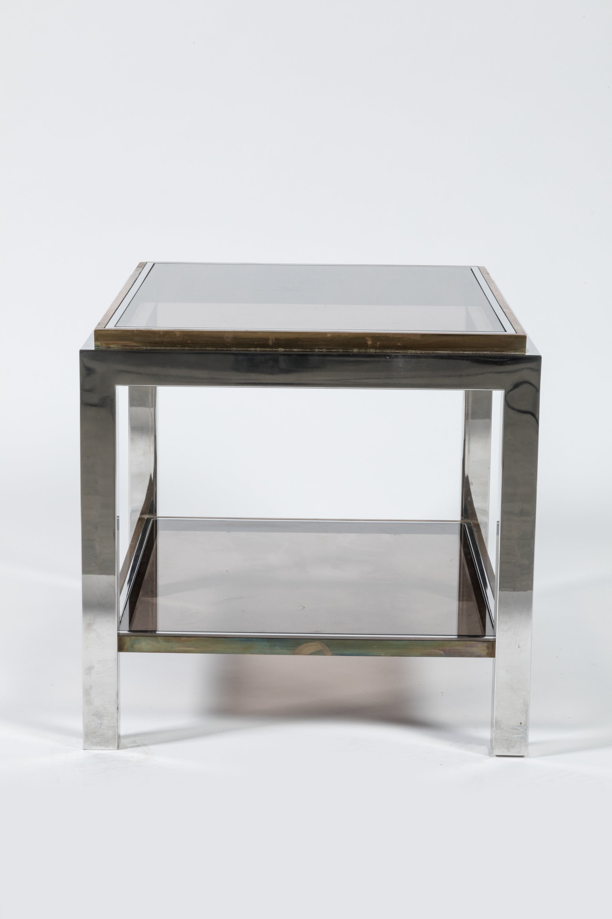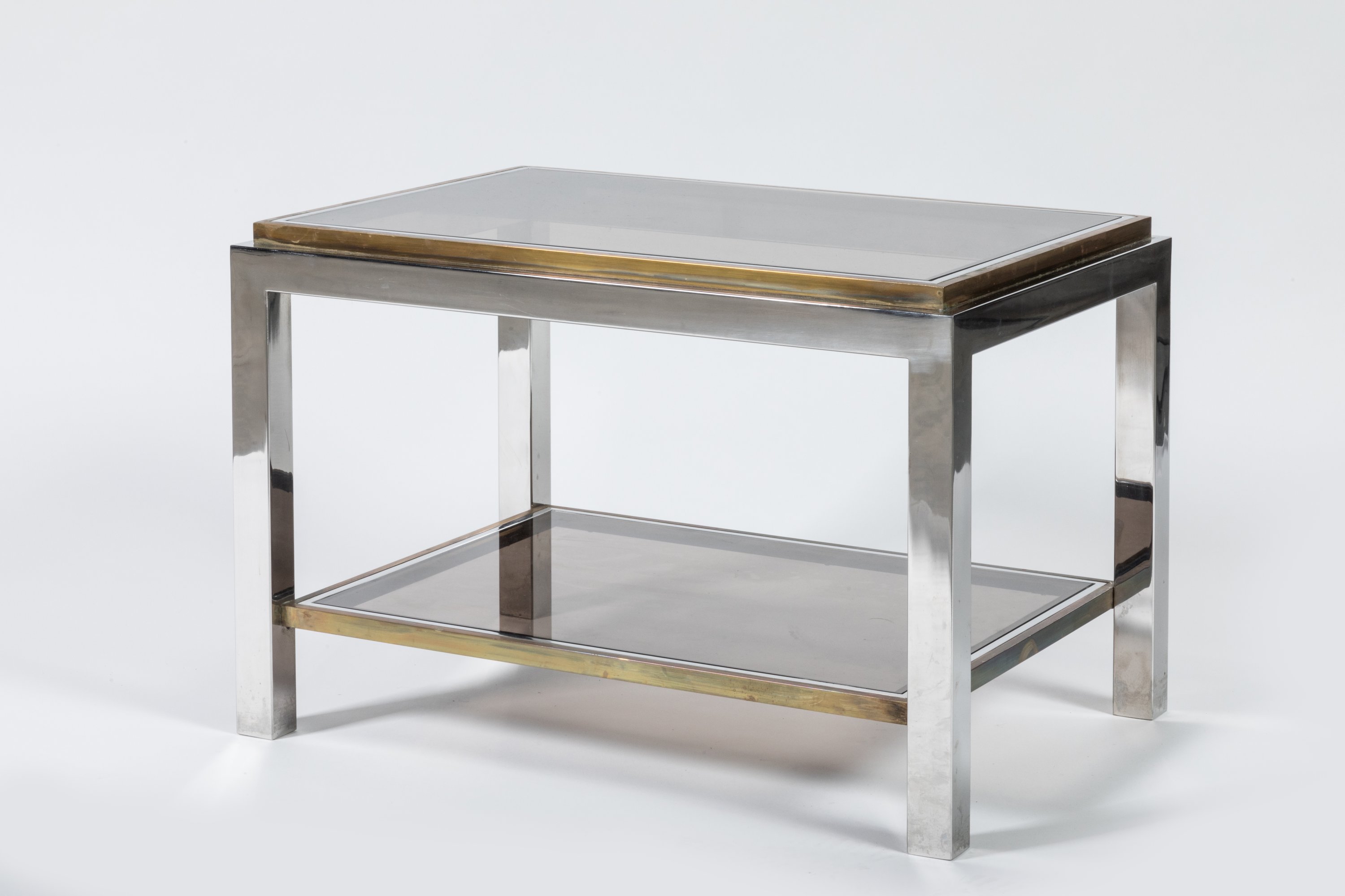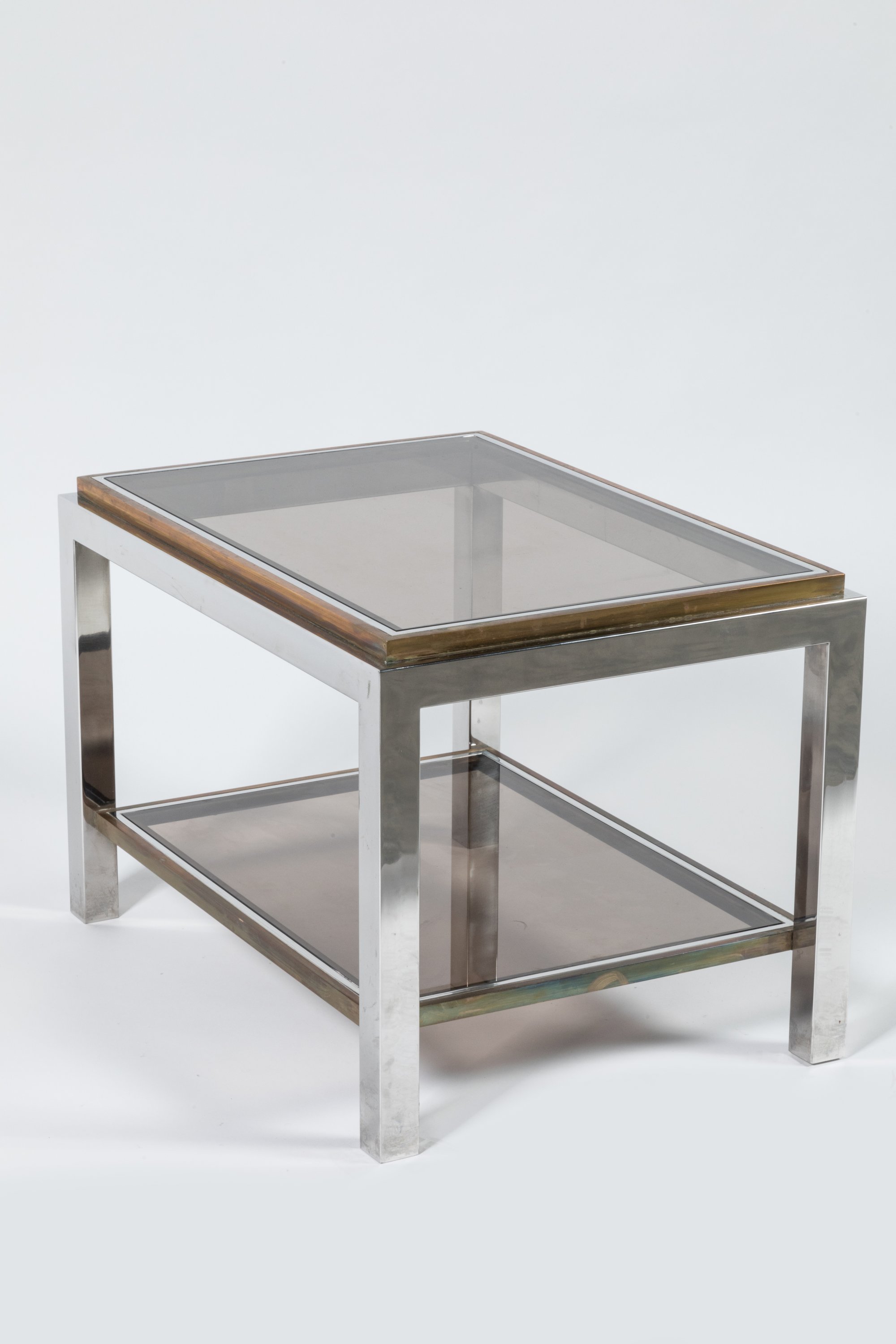 en acier chromé et laiton de forme rectangulaire à deux plateaux en verre fumé. Quatre pieds de section carrée.