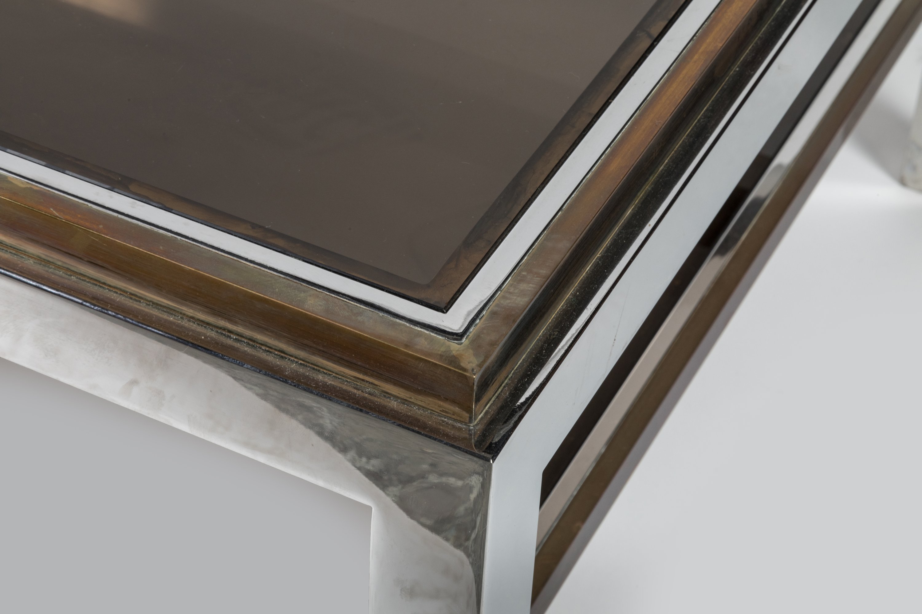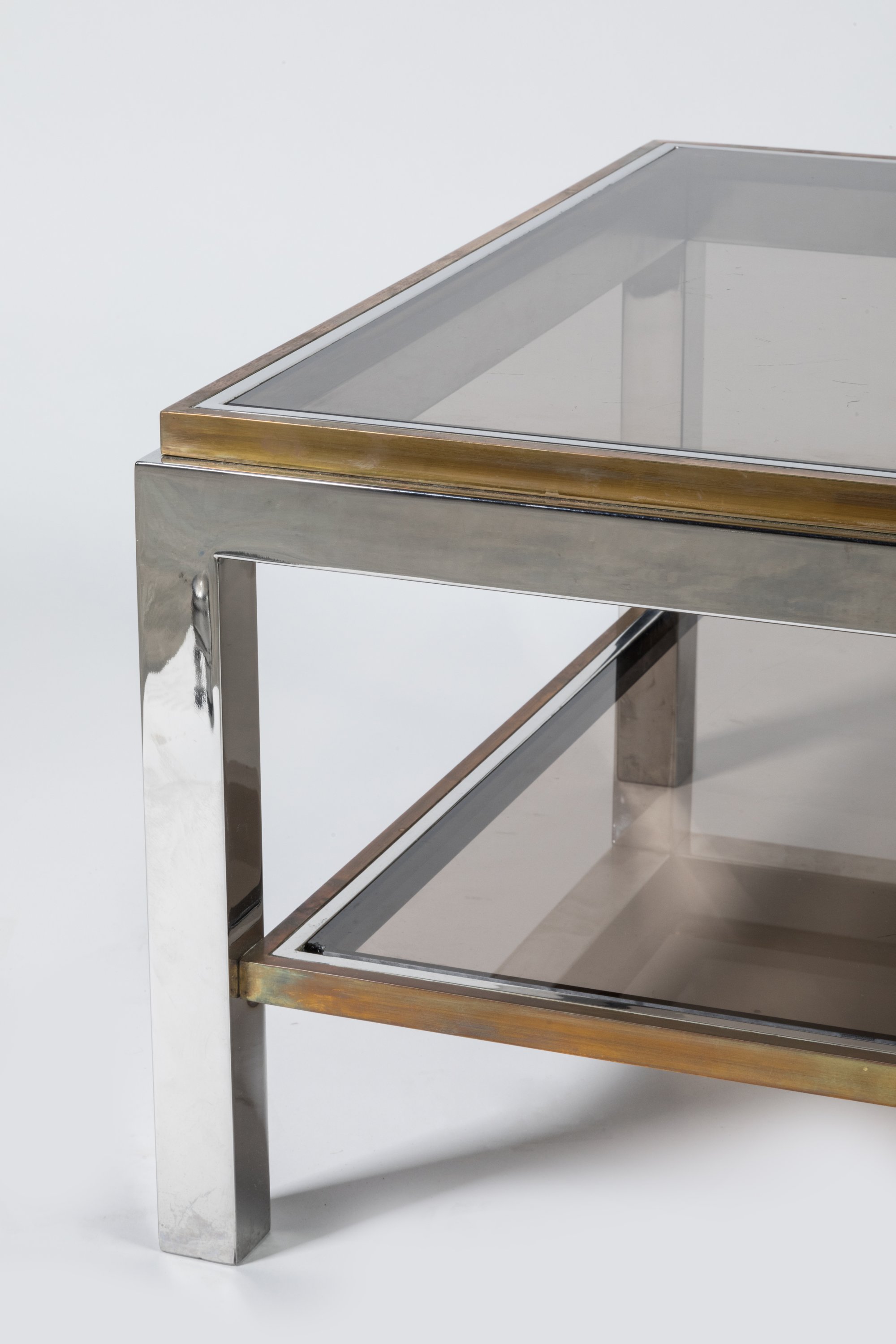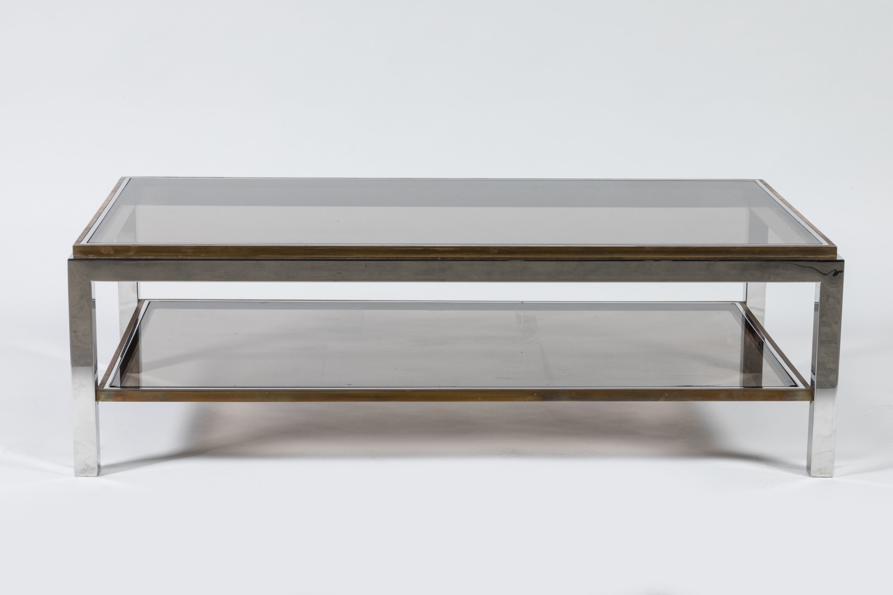 Guy Lefèvre for Maison Jansen. A large chrome-plated steel and brass coffee table. Two smoked glass tops. Bespoke piece of furniture for the Parisian apartment of Princess Radziwill.