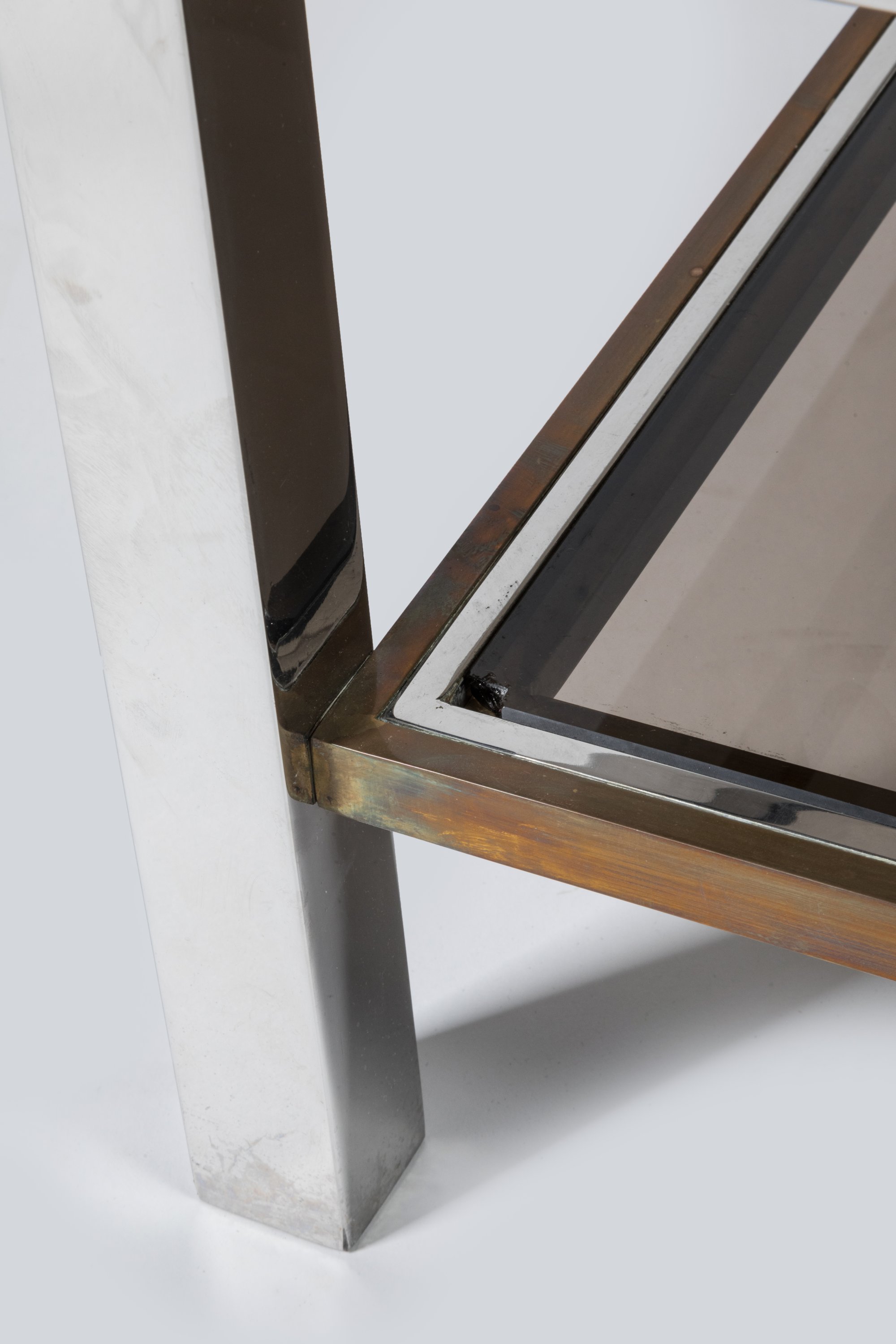 en acier chromé et laiton à deux plateaux en verre fumé. Quatre pieds de section carrée.