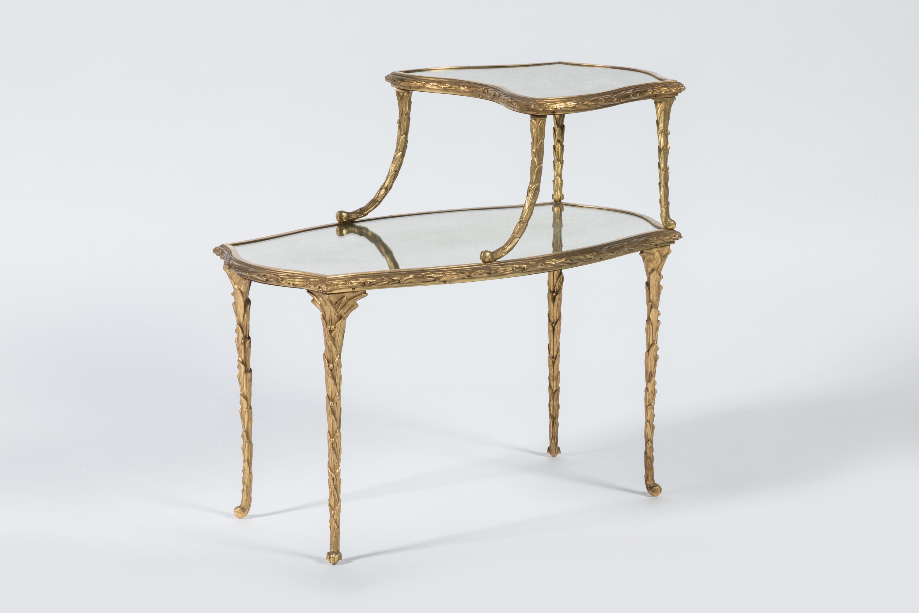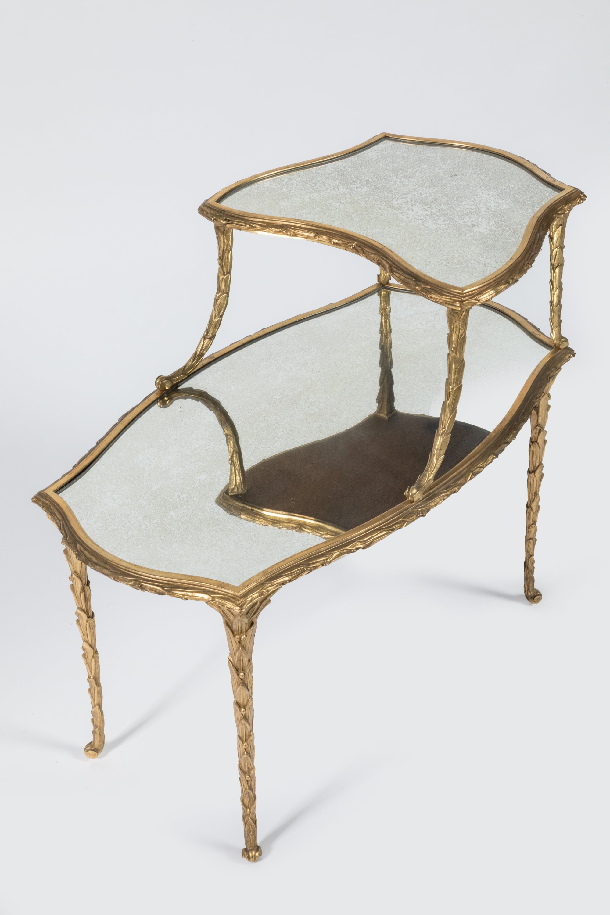 en bronze doré de forme mouvementée, composée de deux plateaux en deux tailles à fond de miroir. L'ensemble est décoré de motifs de feuilles de laurier. Quatre pieds terminés en enroulement.
